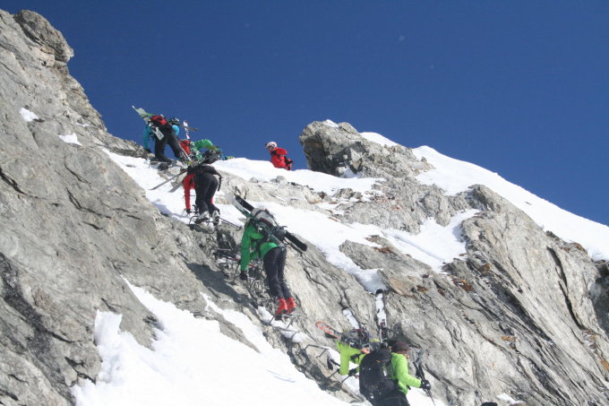 Starker Wind, Triebschnee, Abfahrt über Staldenfirn gut, viele Tourengänger waren an diesem schönen Tag unterwegs.