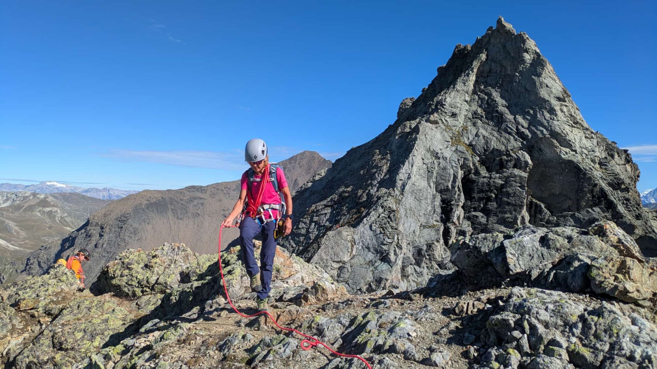 Normale Kletterausrüstung für Gratüberschreitungen. 30m Seil.Wichtig; 6 Schlingen, drei Camolots. Der Grat muss selbst abgesichert werden.