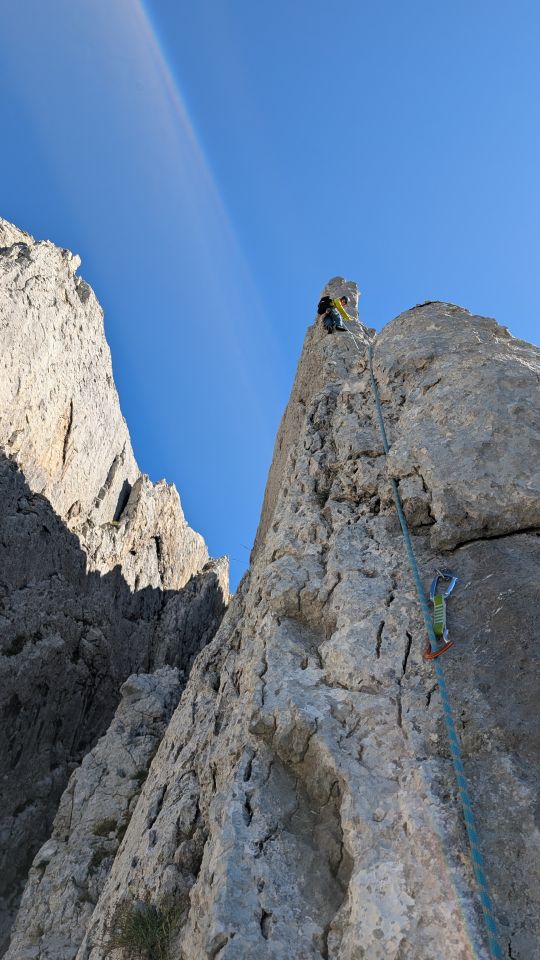 Nun kommt eine sehr schöne Seillänge (5c) in tollem Fels, mit einigen kräftigen Zügen. Es finden sich immer irgendwo gute Griffe. Die letzte Seillänge dann einfach (3a) bis zu einem Stand etwas links des zweiten Felsbands von rechts nach ca. 40m.