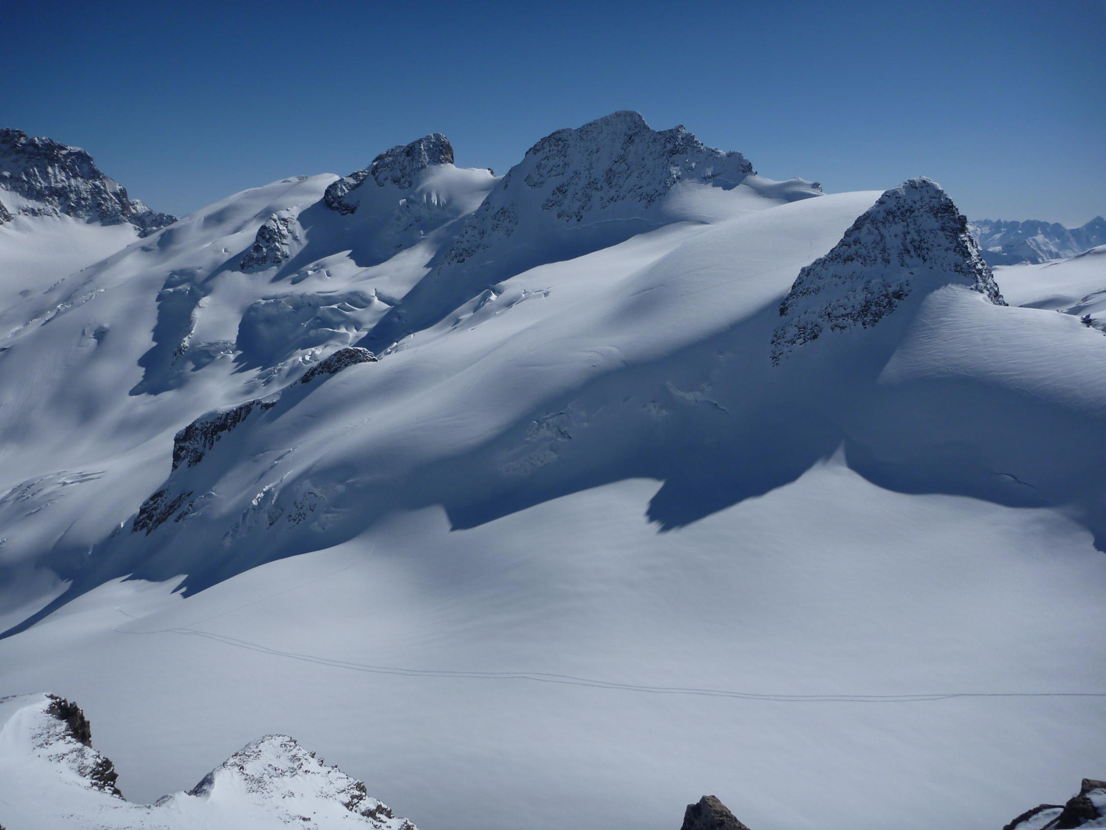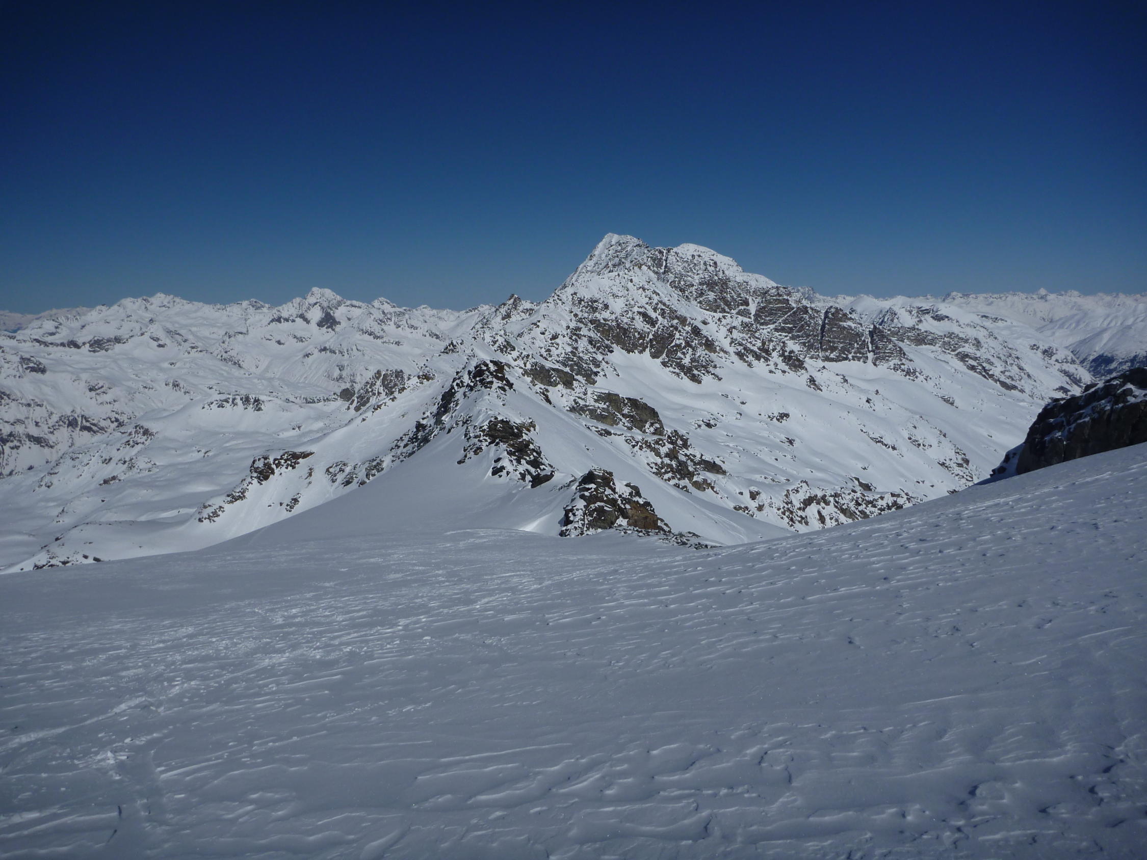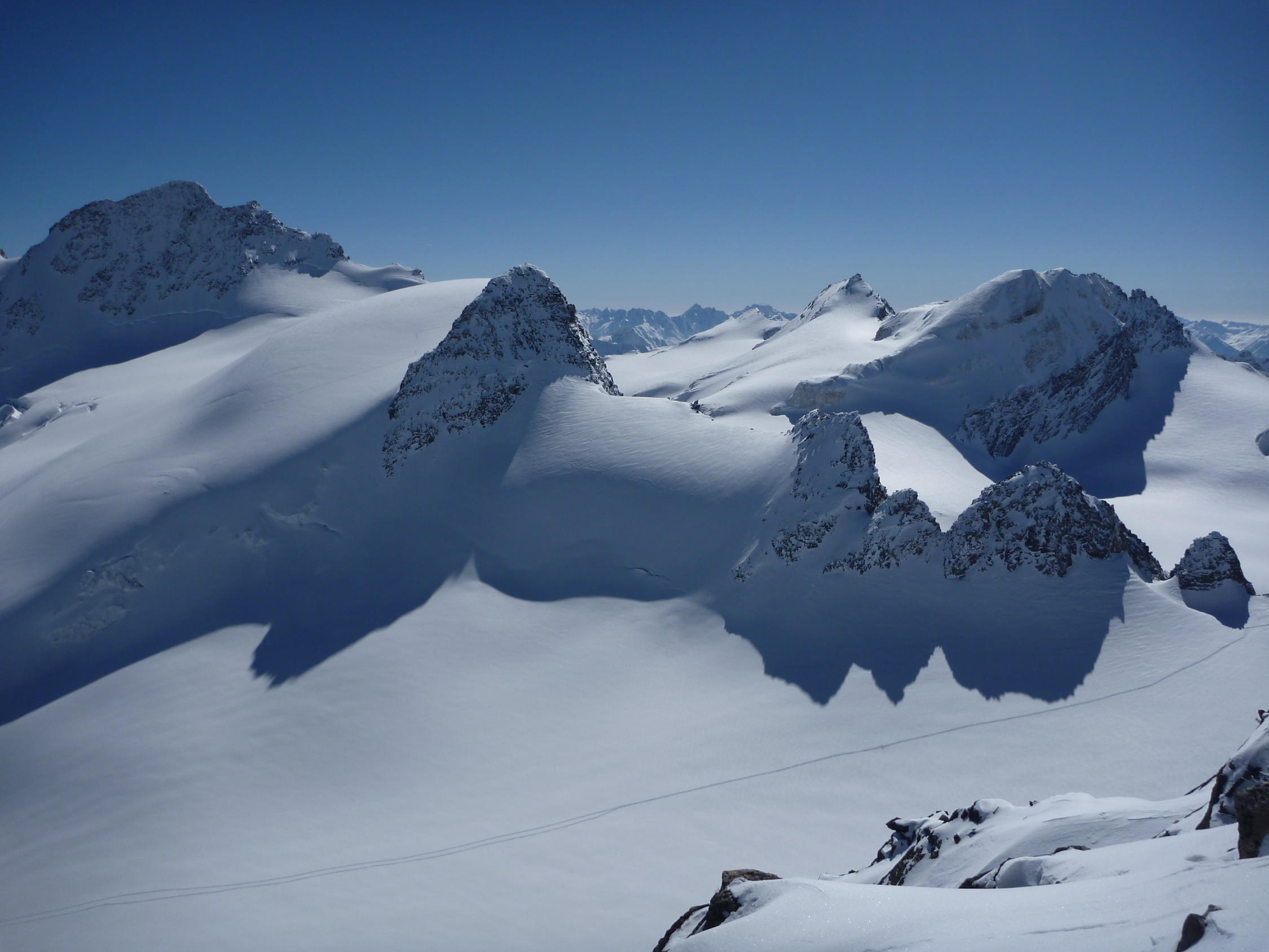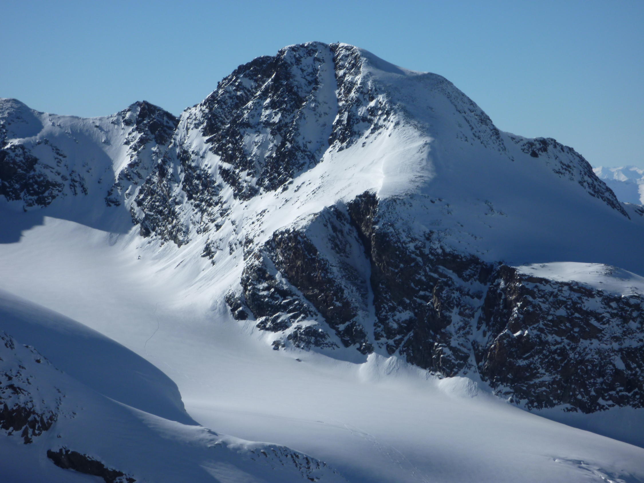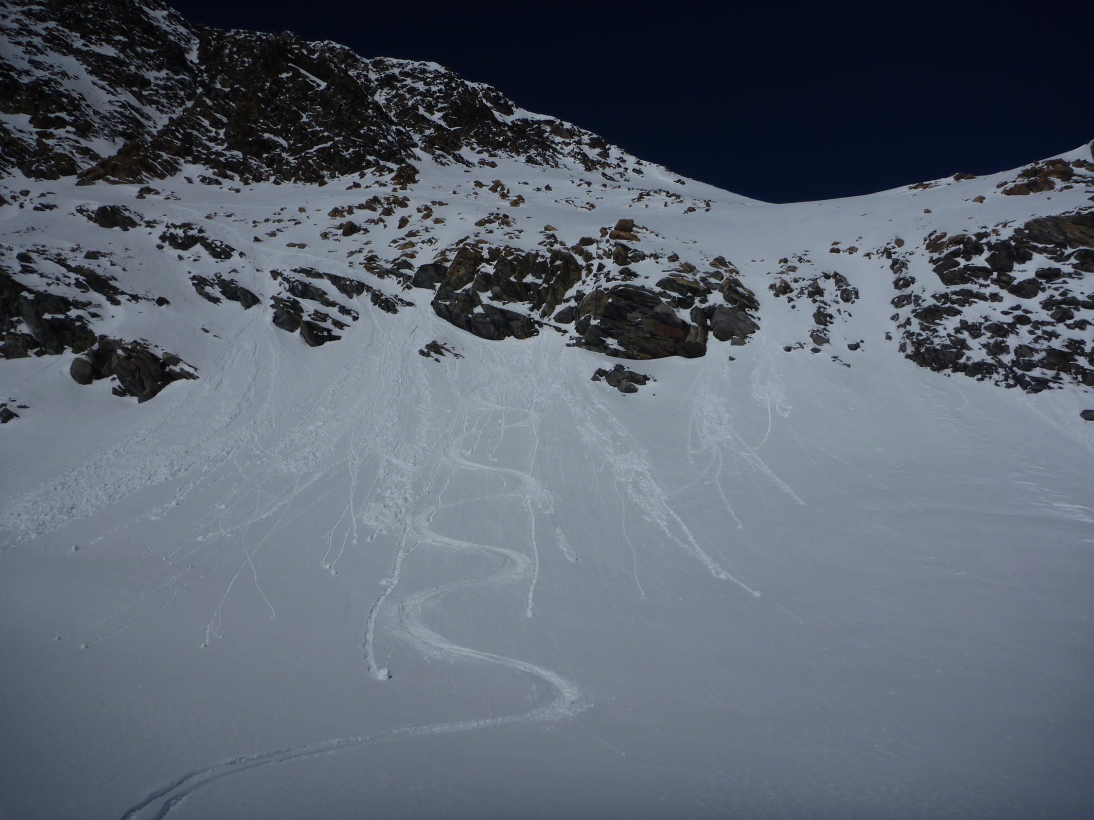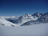 Osthänge bei Murtel früh hart (Harscheisen). Pulver auf den Gletschern. Ostgrat abgeweht. Südflanke Sulz.