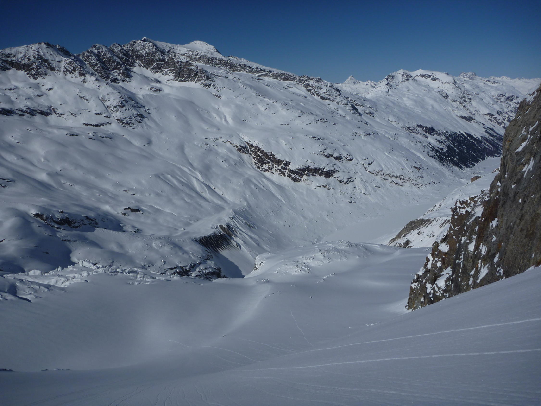 Gletscher sind super eingeschneit. Ab nachmittags im Gipfelbereich sehr starker Nordwind, der mir den Pulver um die Ohren geweht hat. Abfahrt zum Sellapass windgepresst, sehr steil und treppenförmig verblasen.