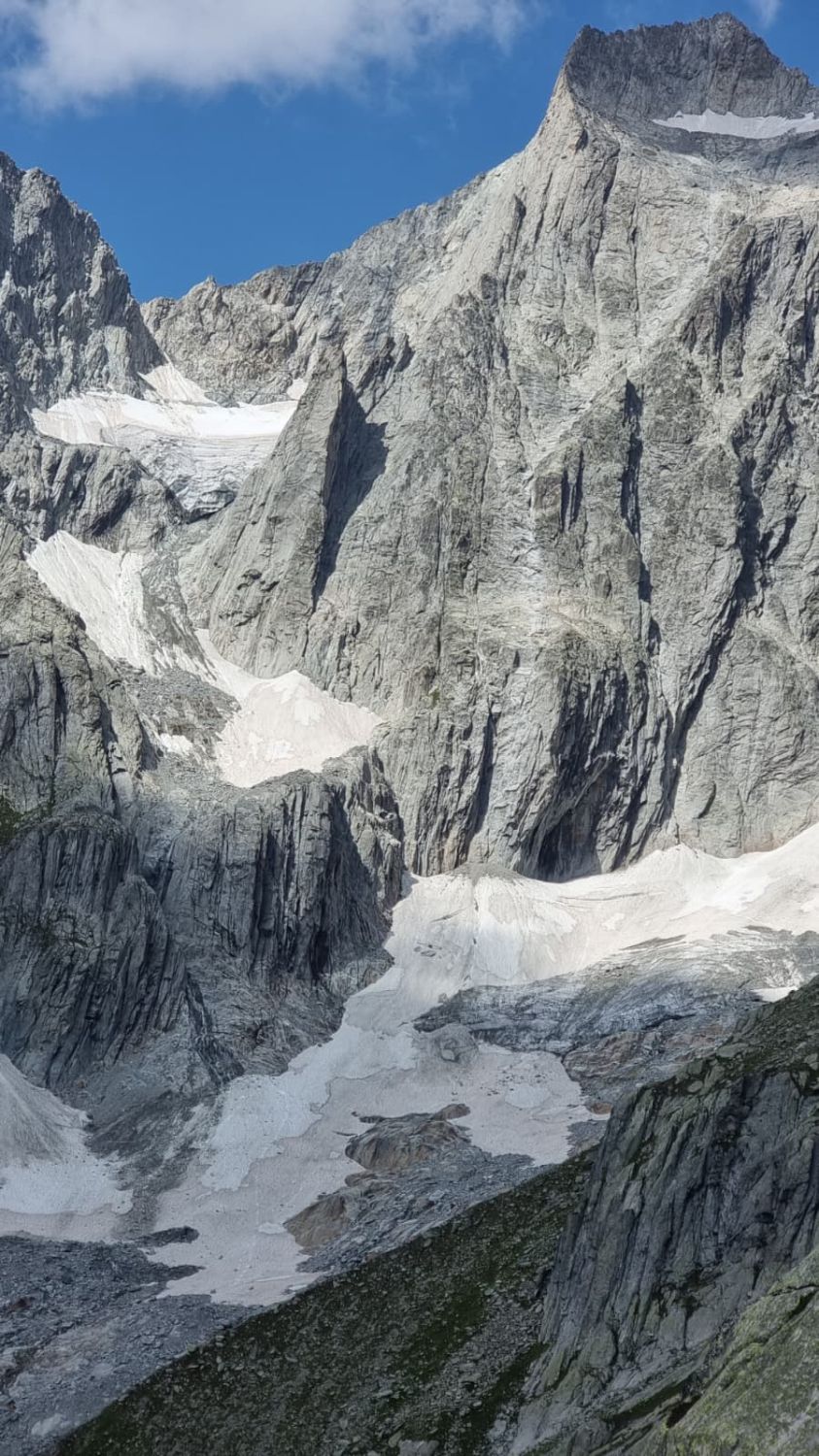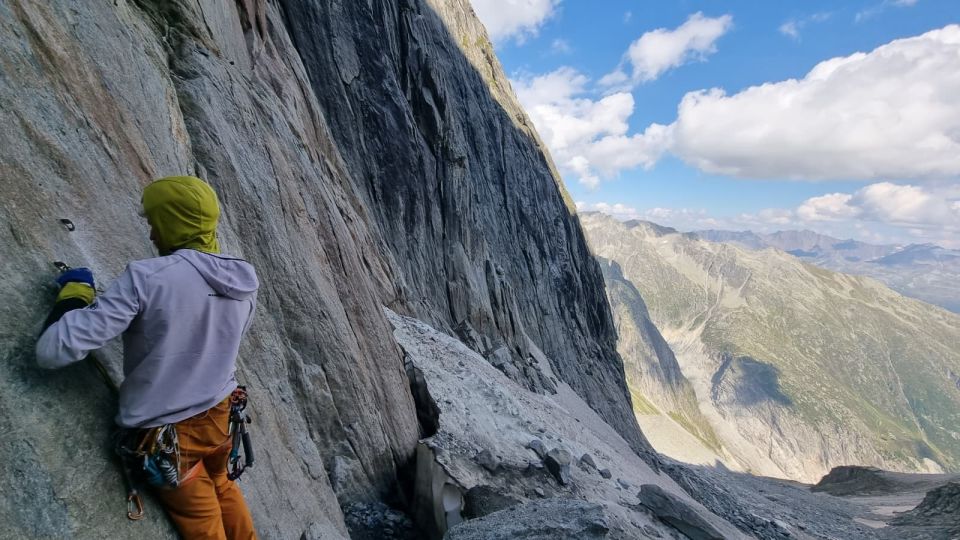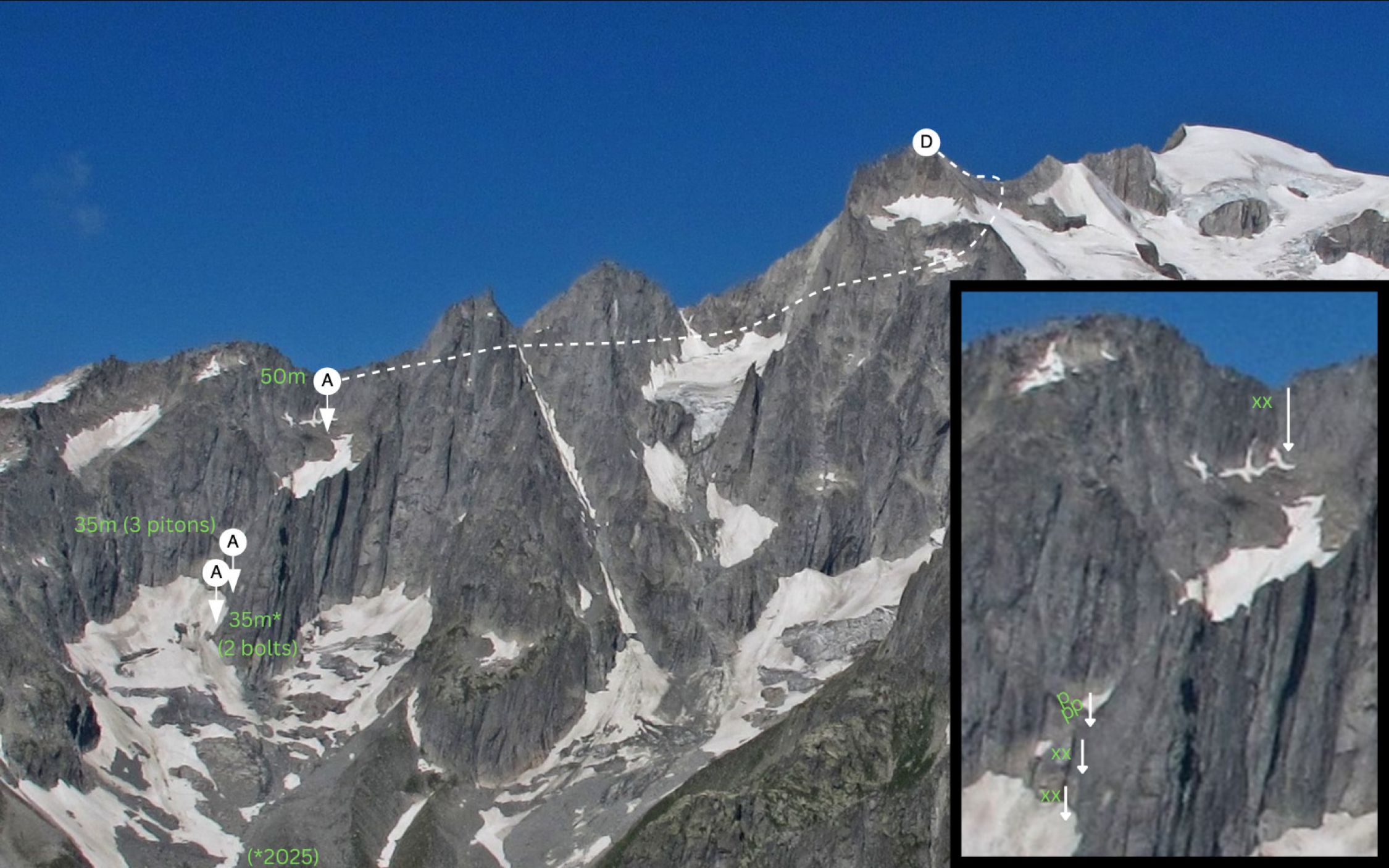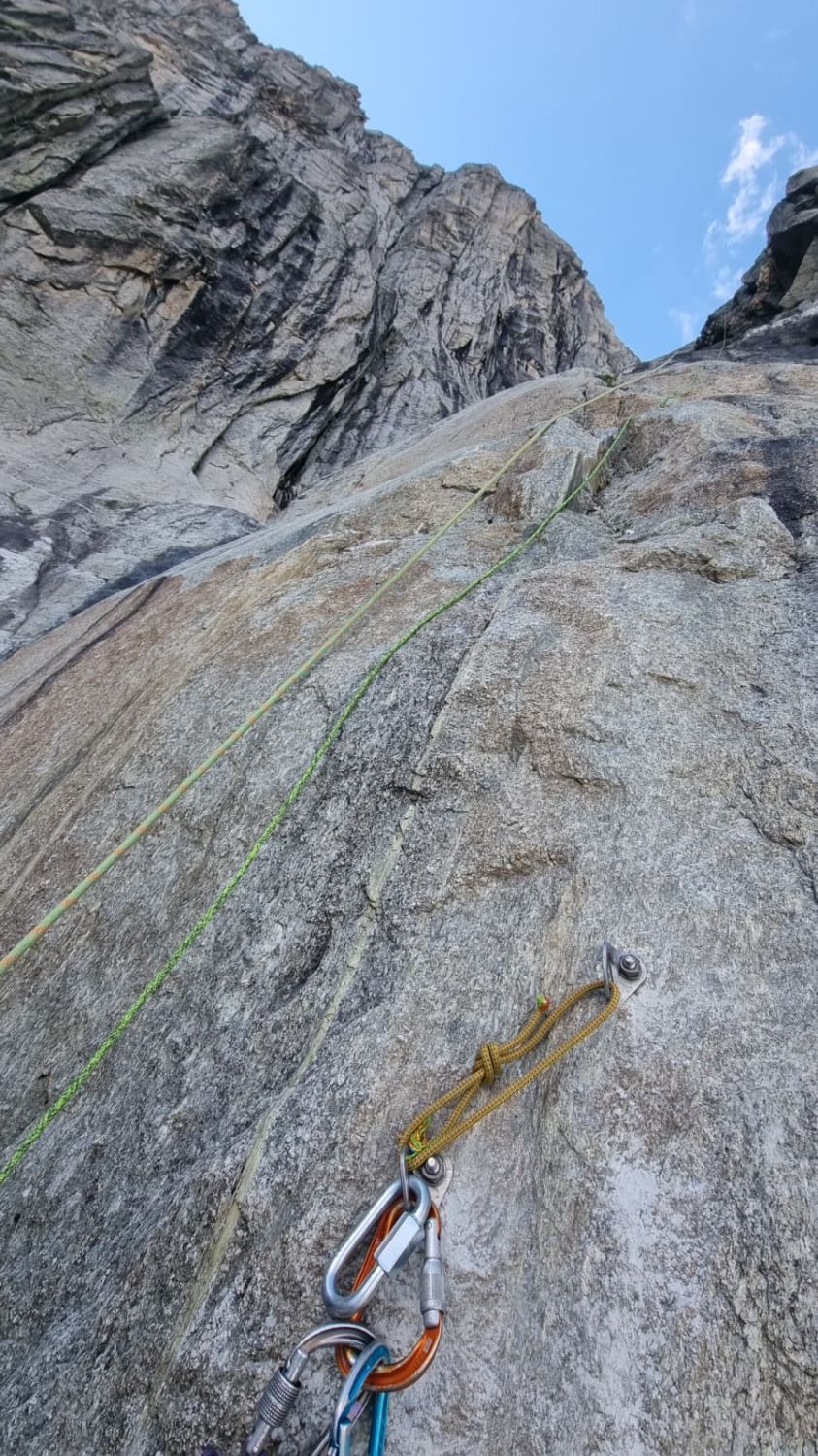 Da der letzte Reisebericht aus dem Jahr 2020 eine Herausforderung darstellte, beschlossen wir, uns gut vorzubereiten. Wir haben zwei Abseilstände hinzugefügt: Aktuell (2025) ist der Abstieg zurück zum Gletscher problemlos in zwei 35-m-Abseilungen möglich (erst an drei Schlaghaken, dann an zwei Bohrhaken). Außerdem haben wir einen weiteren Abseilstand auf der aktuellen Gletscherspitze hinzugefügt. Wenn ihr dies also im Jahr 2033 oder später lest, müsst ihr auch diesen benutzen :) (extrapoliert man davon, dass der Gletscher weiterhin 2–3 m pro Jahr schmilzt).