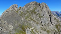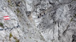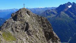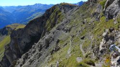 Oberhalb der Hütte glänzt bereits das stattliche Gipfelkreuz des Hirschpleiskopfes in der Sonne. 45 Minuten braucht man für die 300 Höhenmeter zum höchsten Punkt. Mein Tagesziel, der Stanskogel ist aber noch eine gute Stunde entfernt. Vorerst wandert man über karge Hochflächen auf einen vorgelagerten Kamm. Dann wird die Route bald recht alpin. Ein ausgesetztes, schmales Steiglein quert nun in den steilen Schrofen hinüber zum Gipfelmassiv. An Seilsicherungen kraxelt man über den Südwestgrat auf die Nordseite des Berges. In der abschüssigen Flanke führen dann teils rutschige Pfadspuren auf den Vorgipfel und weiter zum nahen Hauptgipfel des Stanskogel. Bergschuhe mit guter Profilsohle, Trittsicherheit und Schwindelfreiheit sind Voraussetzung (T4+) !