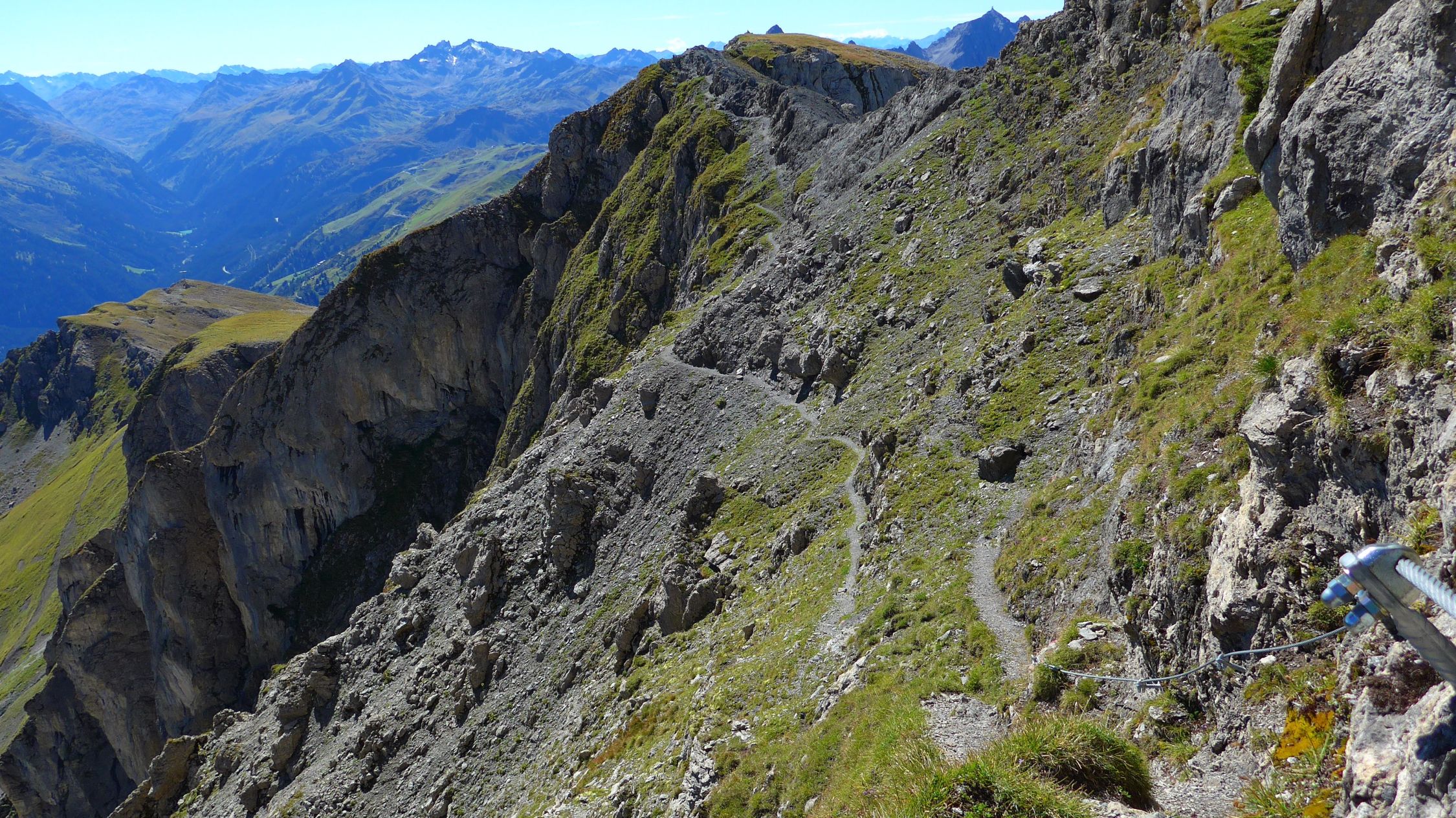 Zunächst bringen mich die Sesselbahnen von St. Anton am Arlberg auf den Kapall (38 € für die Tageskarte). In den steilen Bergplanken der Weissschrofenspitze führt dann ein traumhafter Höhenweg hinüber zur Leutkircher Hütte.