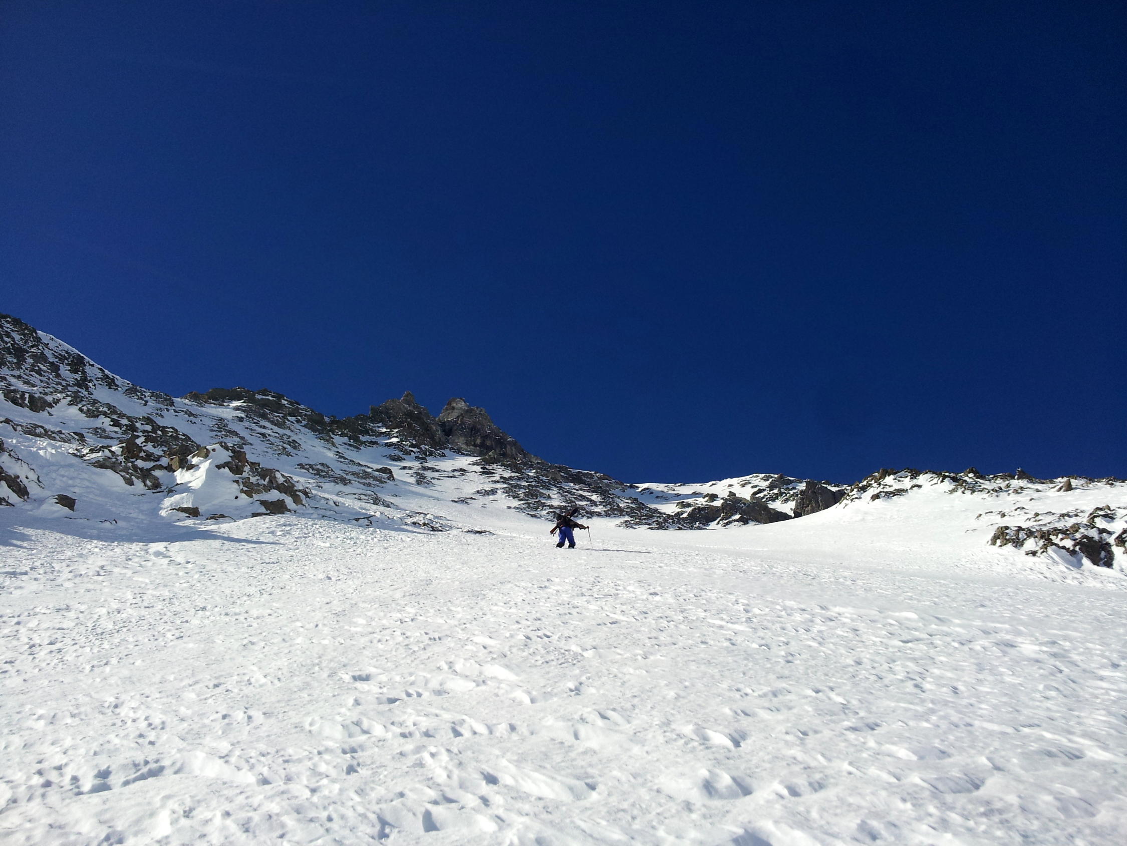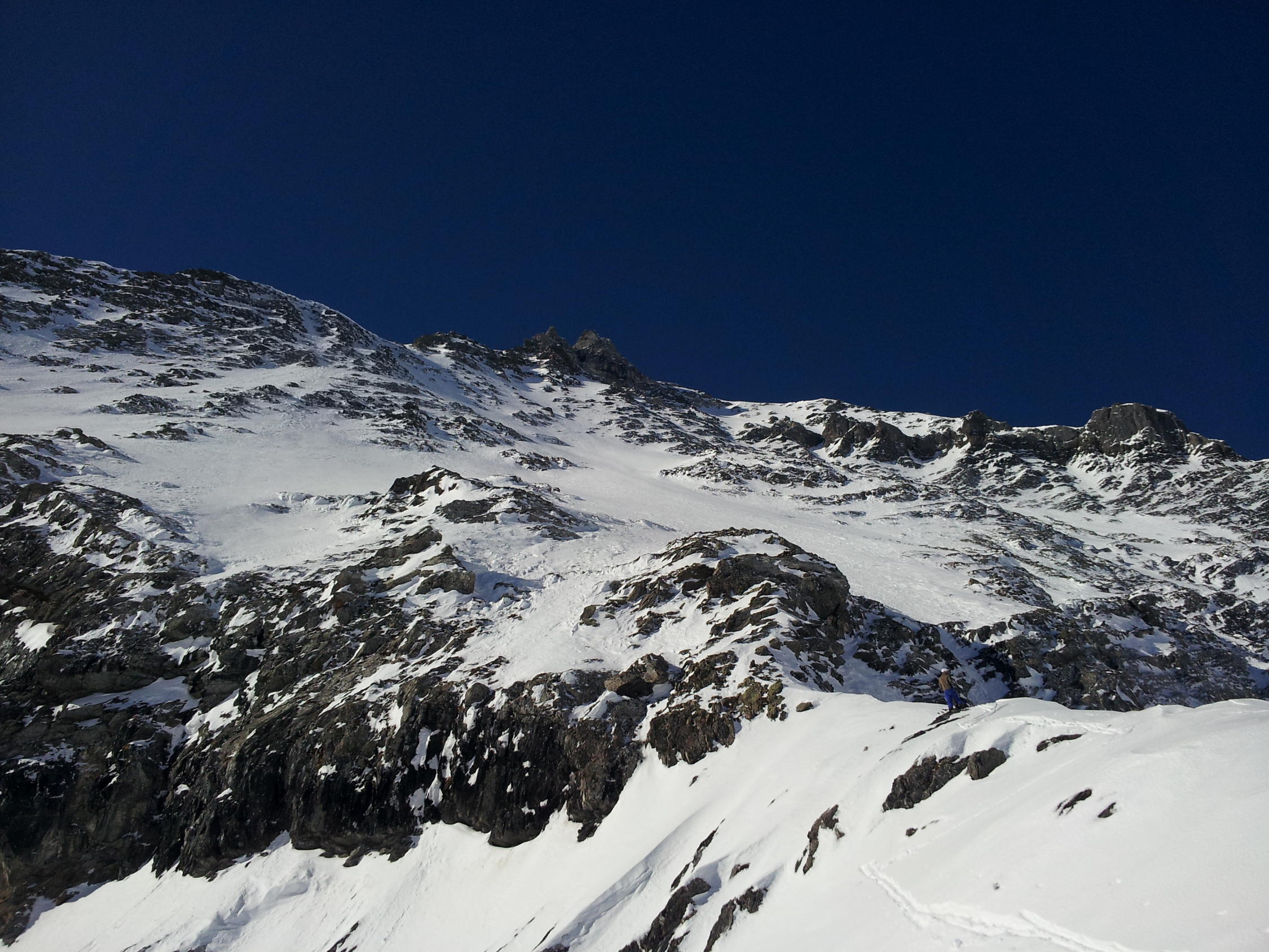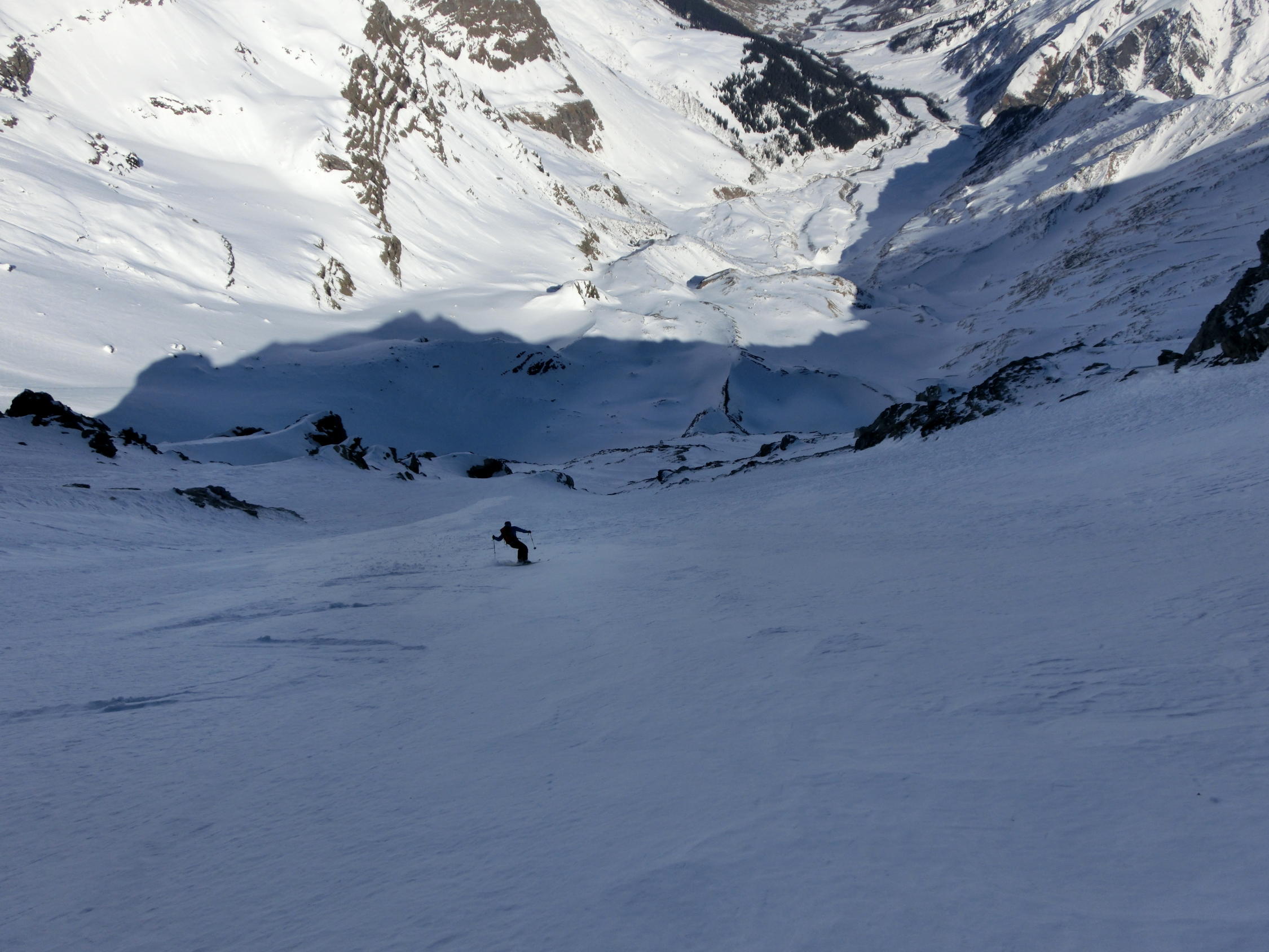 Schnee in der Nordostwand bleibt hart, aber homogen und somit berechenbar zu fahren.