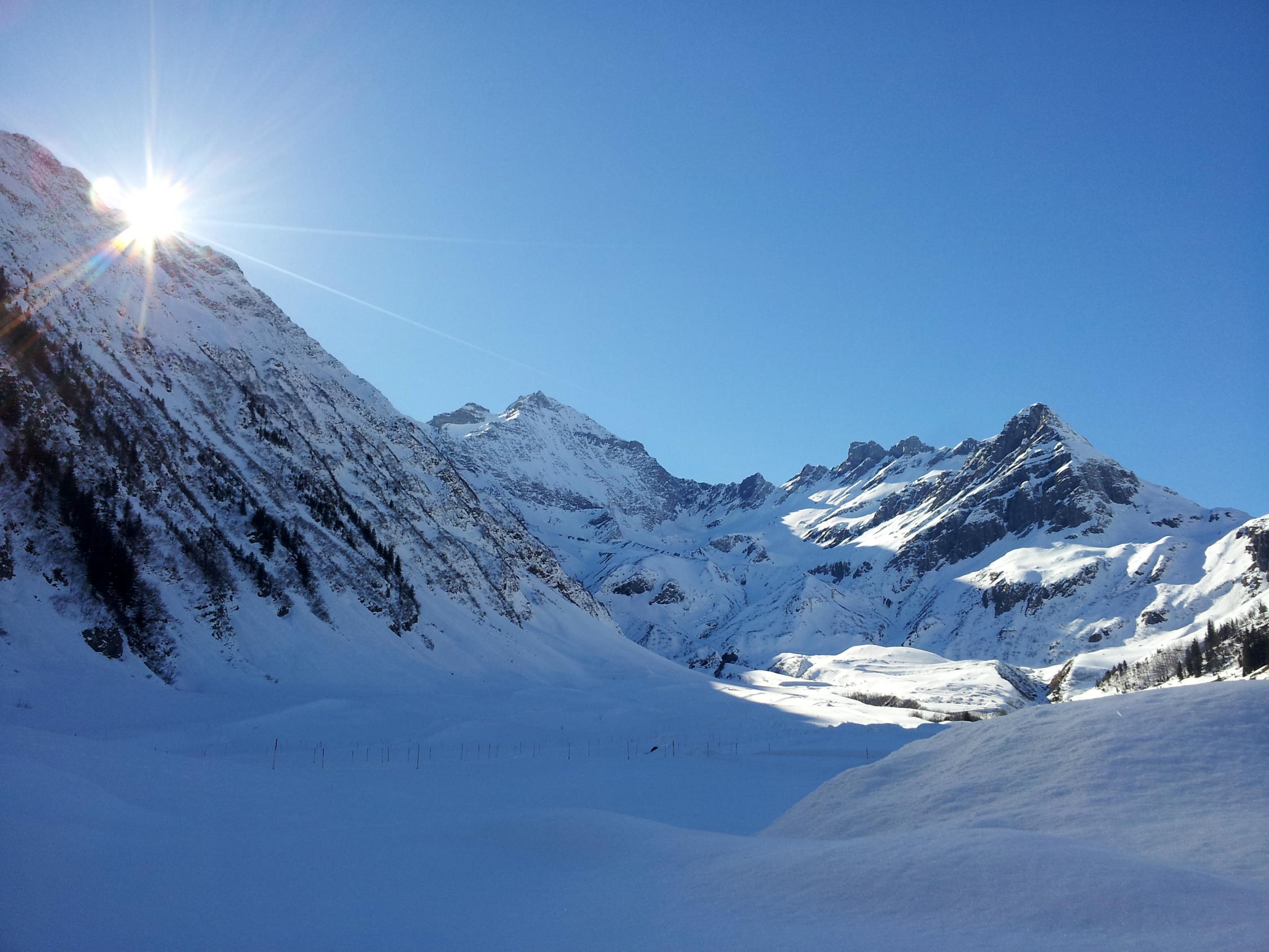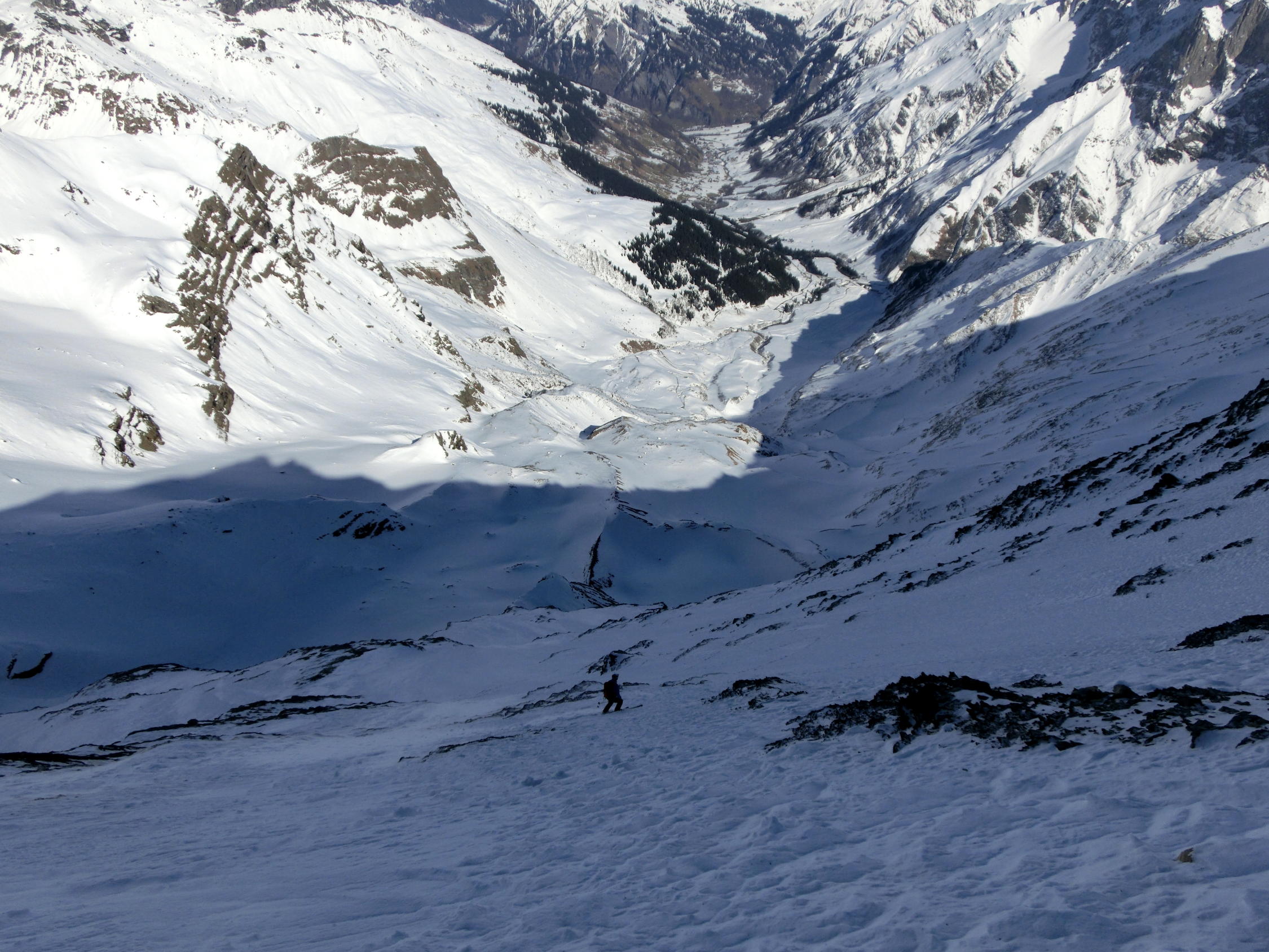 An den unteren Hängen größtenteils nicht tragende Schmelzharschdecke, kaum noch Pulver.