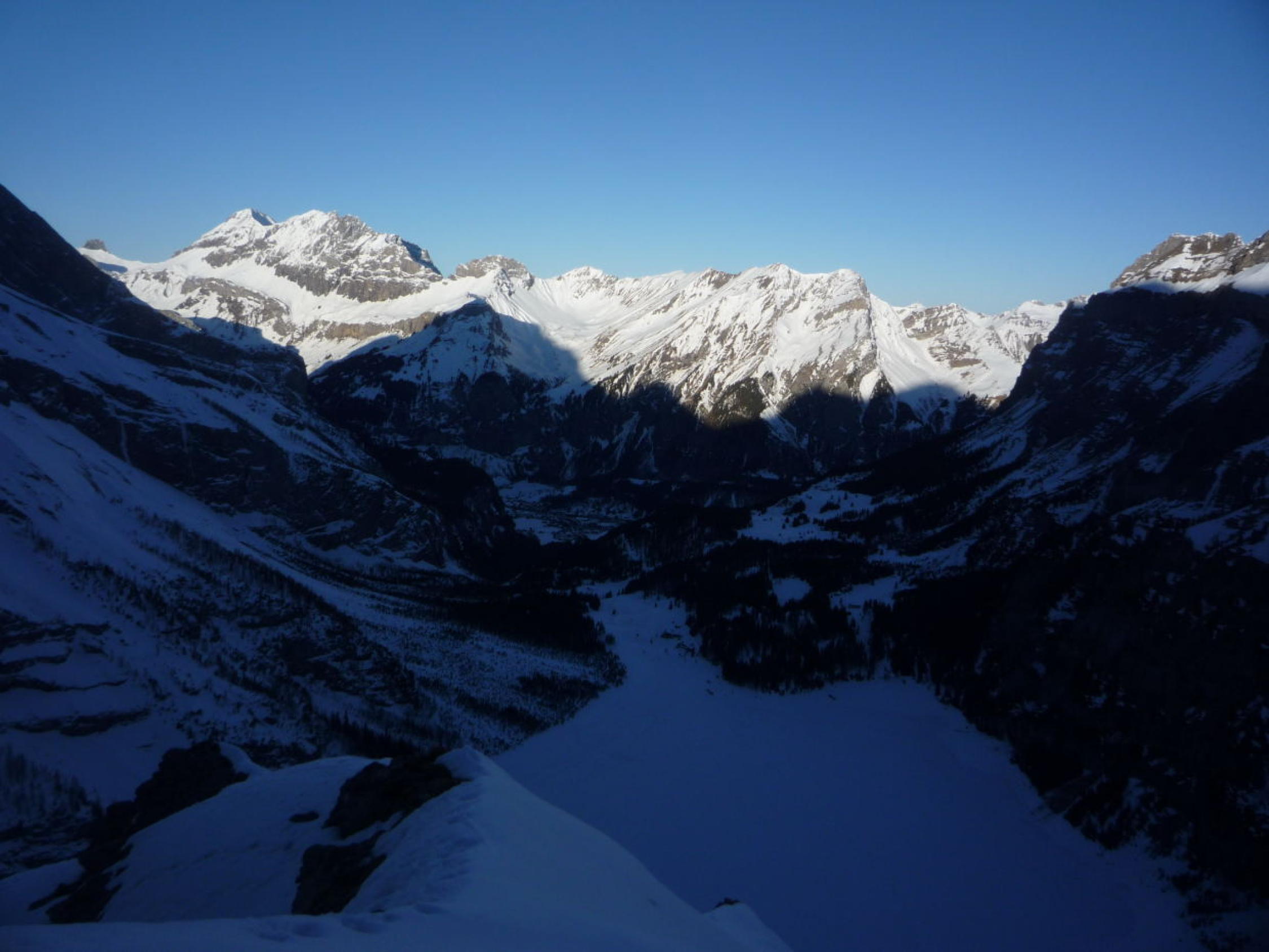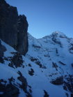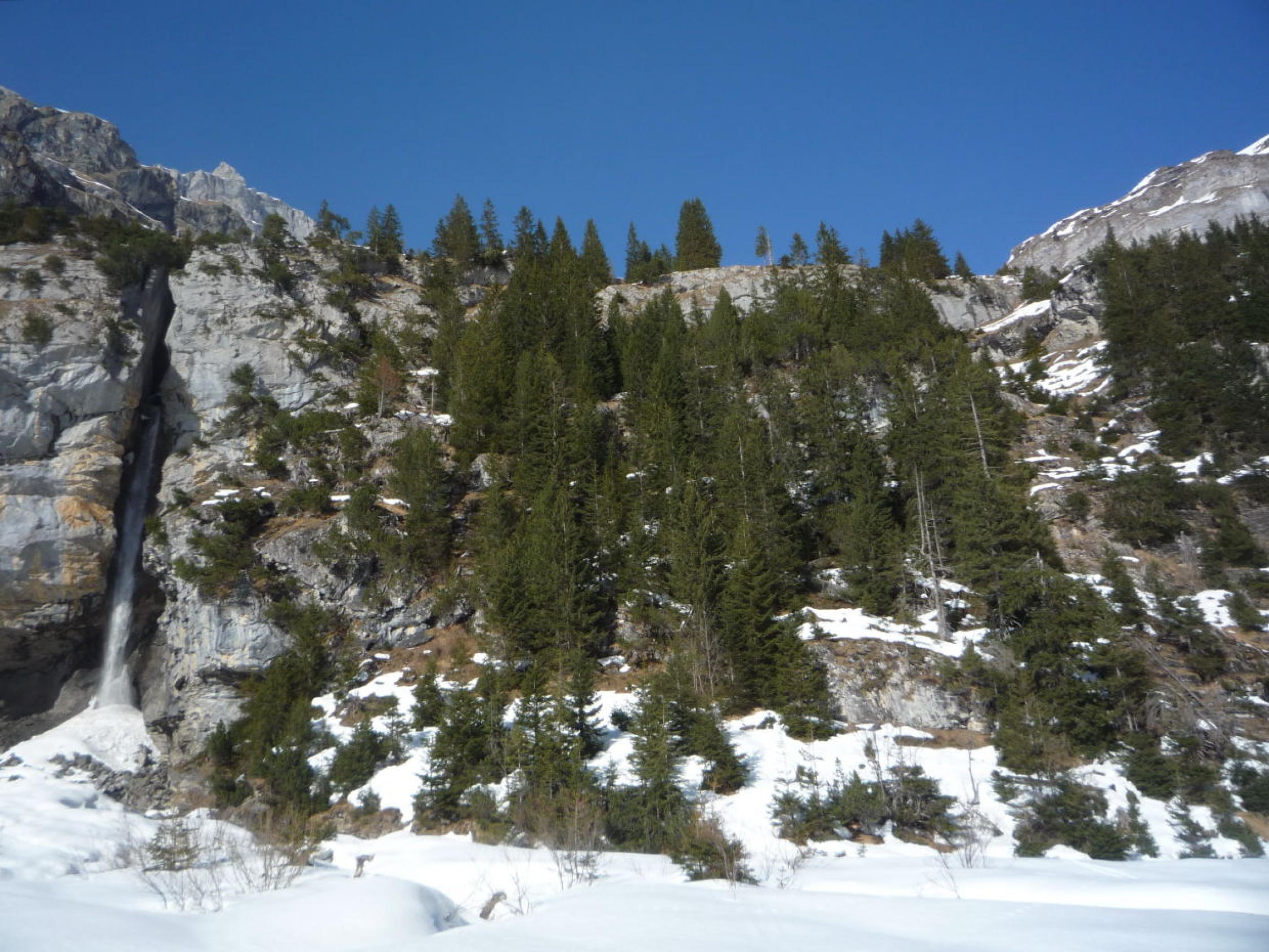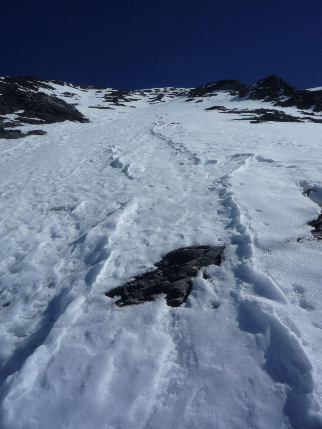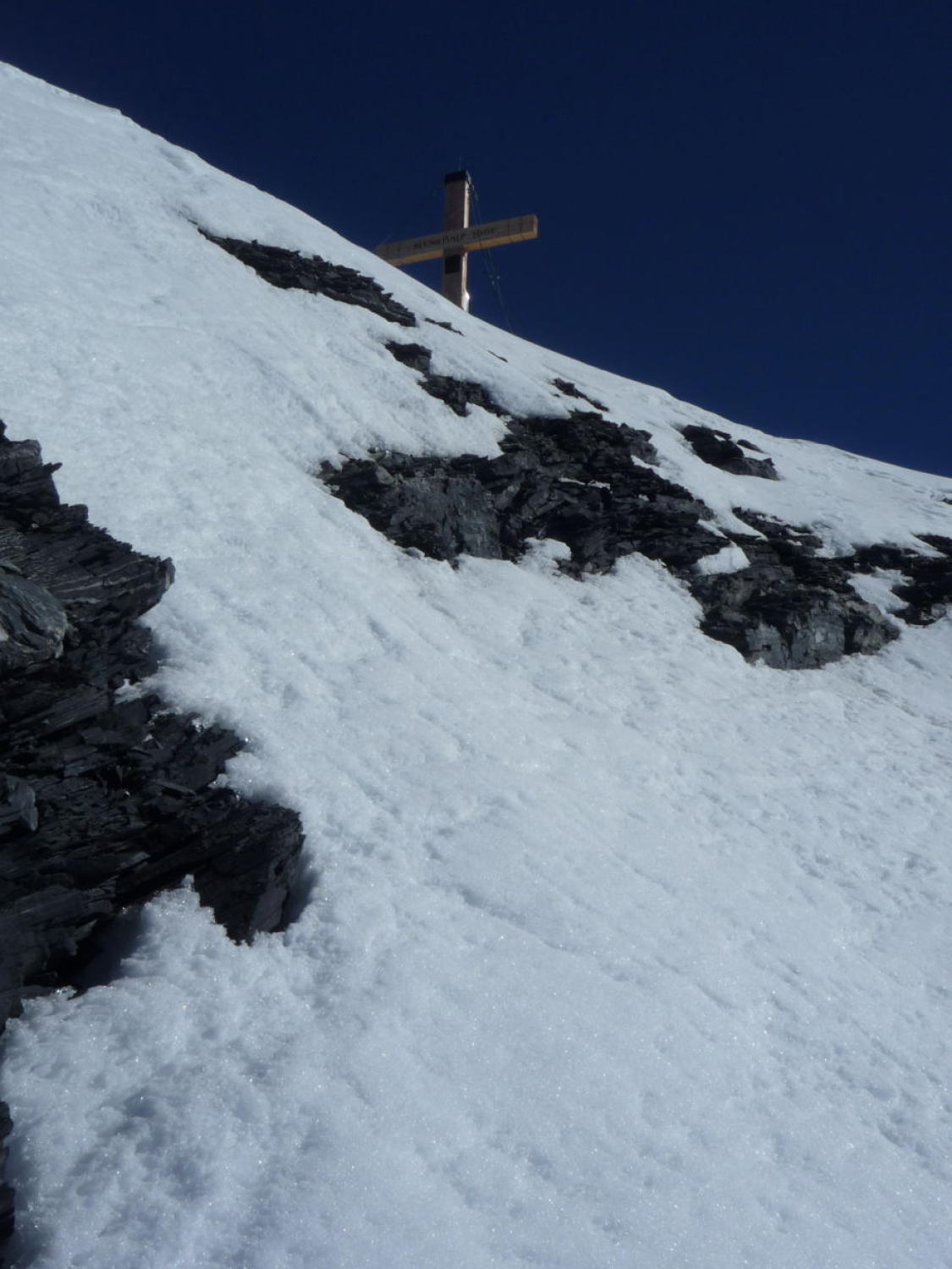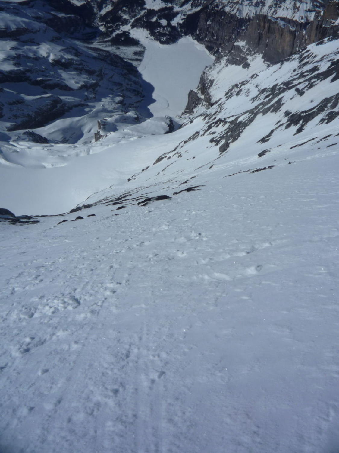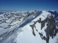 Schnee bis Läster morgens tragend gefroren, nachmittags aufgeweicht. Fründenschnur abwechselnd weicher Schnee (Einsinken) und aper. Bis zum W-Couloir morgens tragend, bei der Abfahrt z.T. Bruchharsch. W-Couloir und -Flanke Trittschnee, bei der Abfahrt z.T. angesulzt u. griffig. In der W-Flanke unter dem S-Grat über eine Felsbarriere 1m abgeklettert, zudem einzelne Passagen mit nur dünn verschneiten Platten (unangenehm).