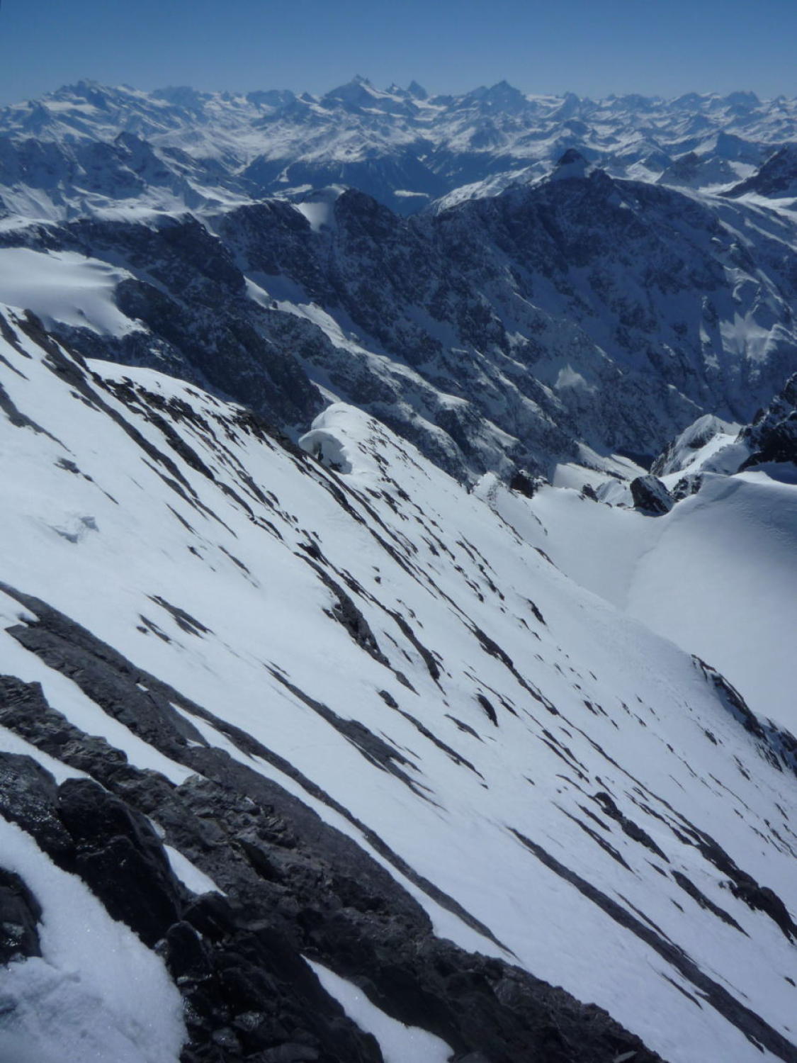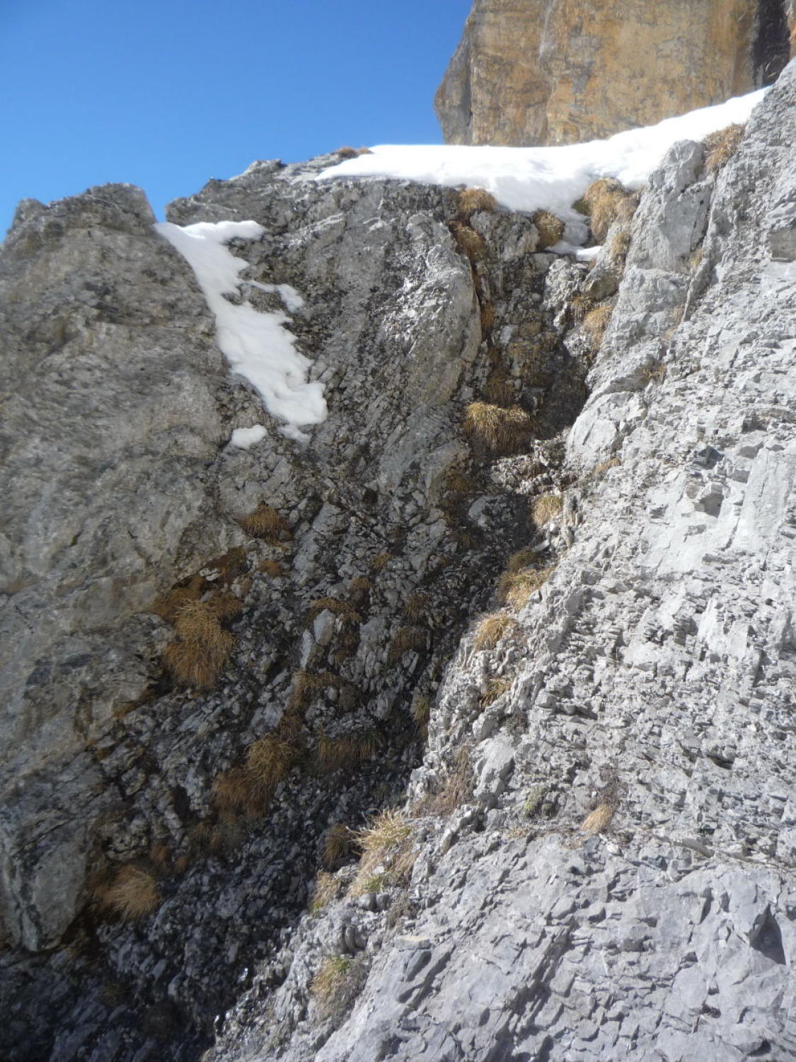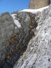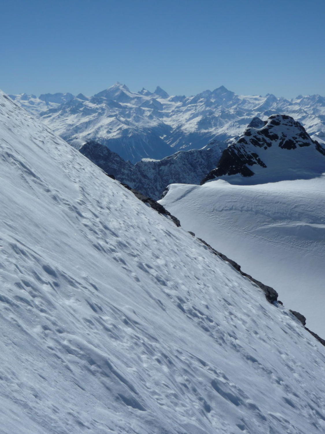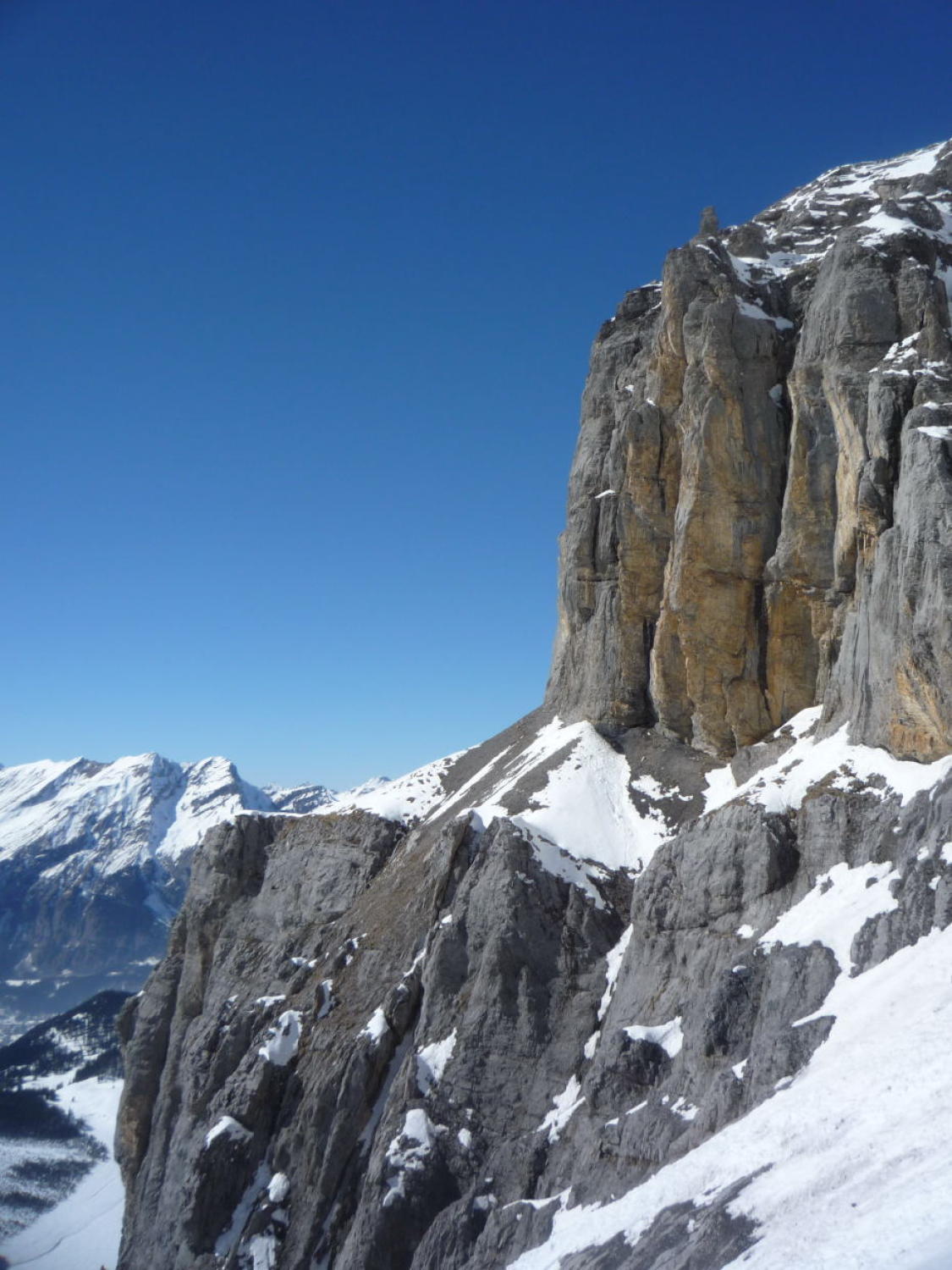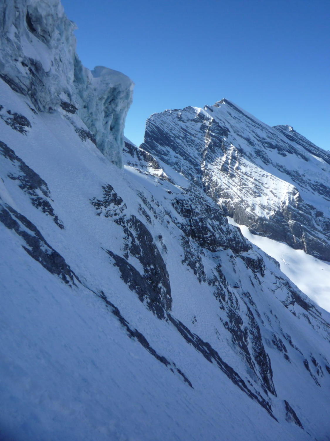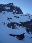 Schnee bis Läster morgens tragend gefroren, nachmittags aufgeweicht. Fründenschnur abwechselnd weicher Schnee (Einsinken) und aper. Bis zum W-Couloir morgens tragend, bei der Abfahrt z.T. Bruchharsch. W-Couloir und -Flanke Trittschnee, bei der Abfahrt z.T. angesulzt u. griffig. In der W-Flanke unter dem S-Grat über eine Felsbarriere 1m abgeklettert, zudem einzelne Passagen mit nur dünn verschneiten Platten (unangenehm).