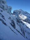 Material: zusätzlich Stirnlampe, Helm, Eisgerät und Steigeisen. Ich hatte noch ein zweites leichtes Eisgerät, den Klettergurt, 1 Express, 2 Schlingen, 2 Eisschrauben und eine 30m Reepschnur dabei, was ich aber alles nicht brauchte.