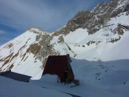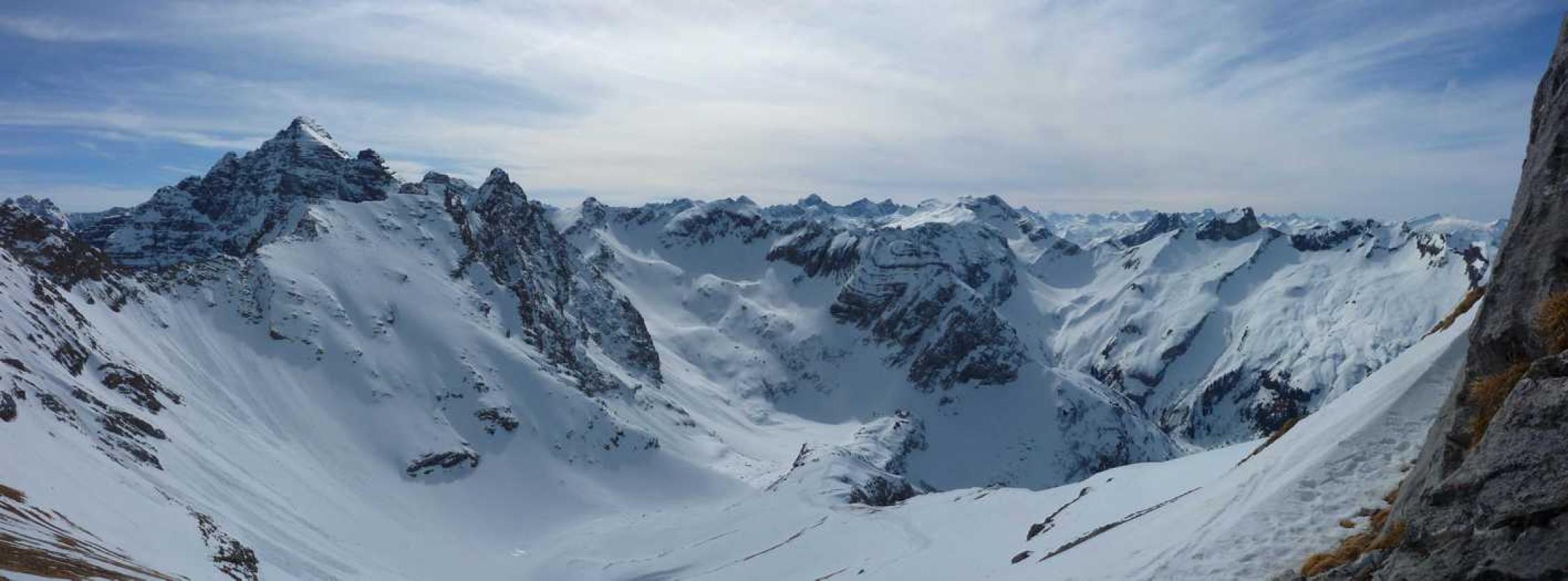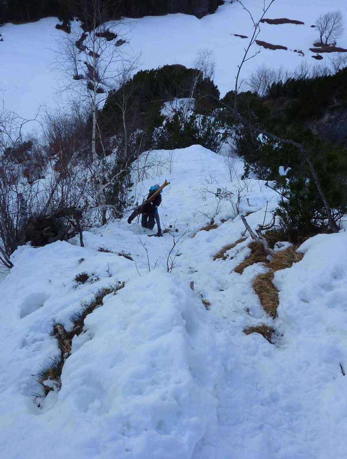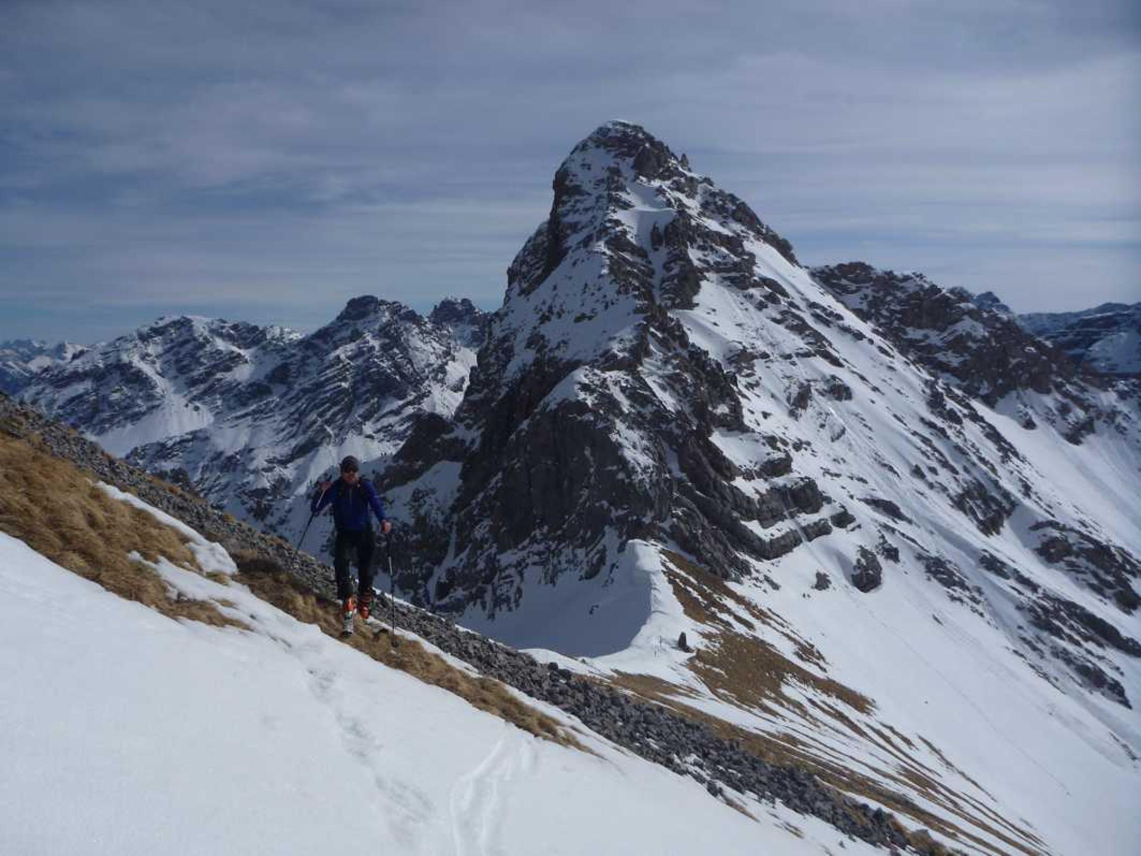 Am 11.3. Aufstieg zum Prinz Luitpold Haus. Die zwei Geländestufen mit ganz kurzen Tragstrecken. Weiter zum Glasfelderkopf. Die Schneedecke in dessen Südhängen wird langsam lückiger. Nächtigung im sehr guten Winterraum. Am nächsten Tag zum Hochvogel. Das letzte Stück zur Balkenscharte muss getragen werden. Die Querung ins Kaltwinkelkar wegen der Felsrippen etwas mühsam aber mit guten Schneeverhältnissen. Skidepot in der Scharte. Stapferei hoch zur Schnur und über eine eisige Rinne (Pickel hier angenehm) in die Westflanke. In für den schneearmen Winter überraschend viel Schnee zum Gipfel hochgewühlt. Abstieg auf dem gleichen Weg. Die Abfahrt in erstaunlich gutem Schnee: Sulz in den Sonnenhängen und gesetzter Pulver in den Schattenhängen. Sporadisch ein kleiner Kratzer. Die Schneedecke ist halt doch nicht so üppig.