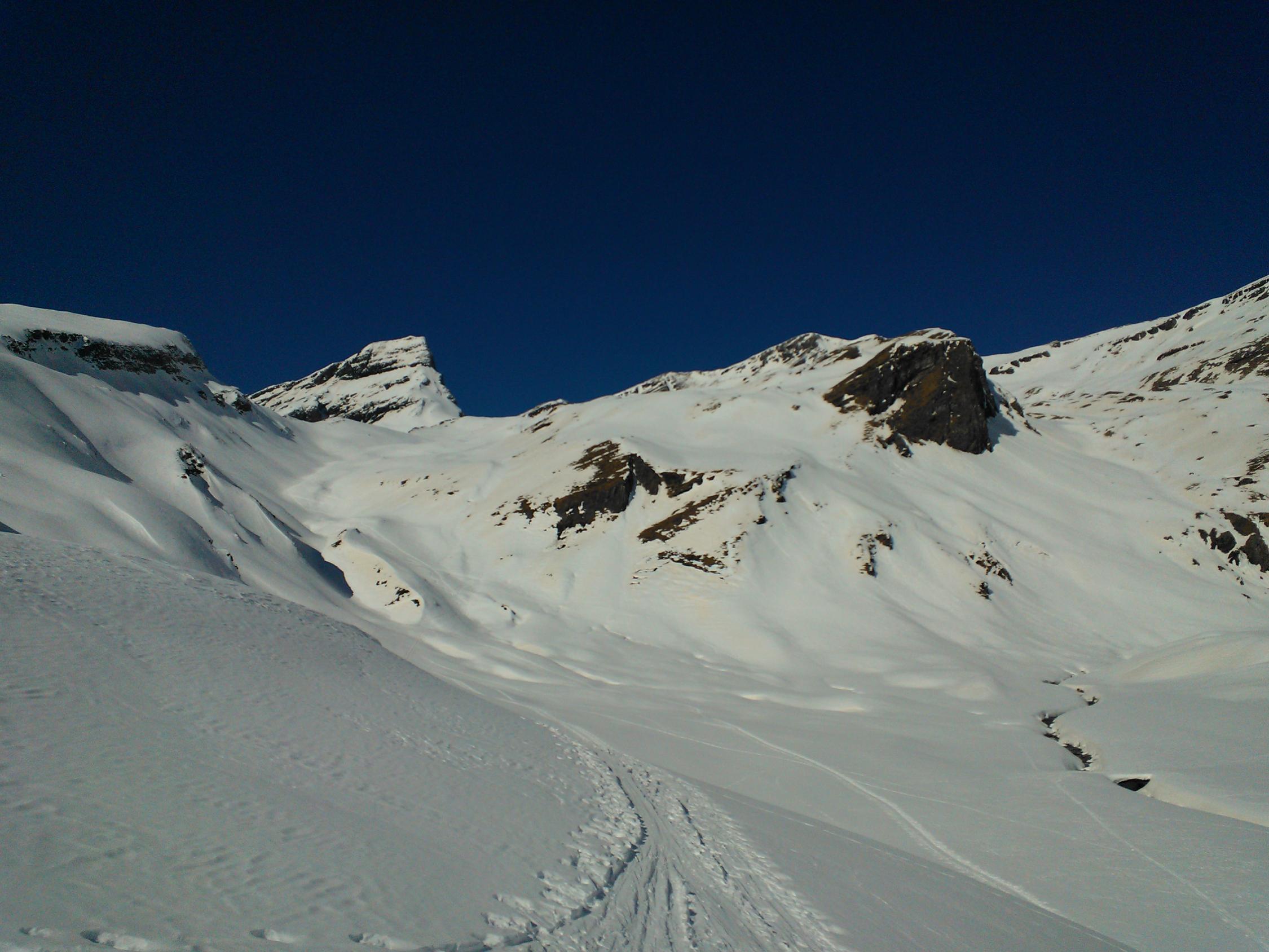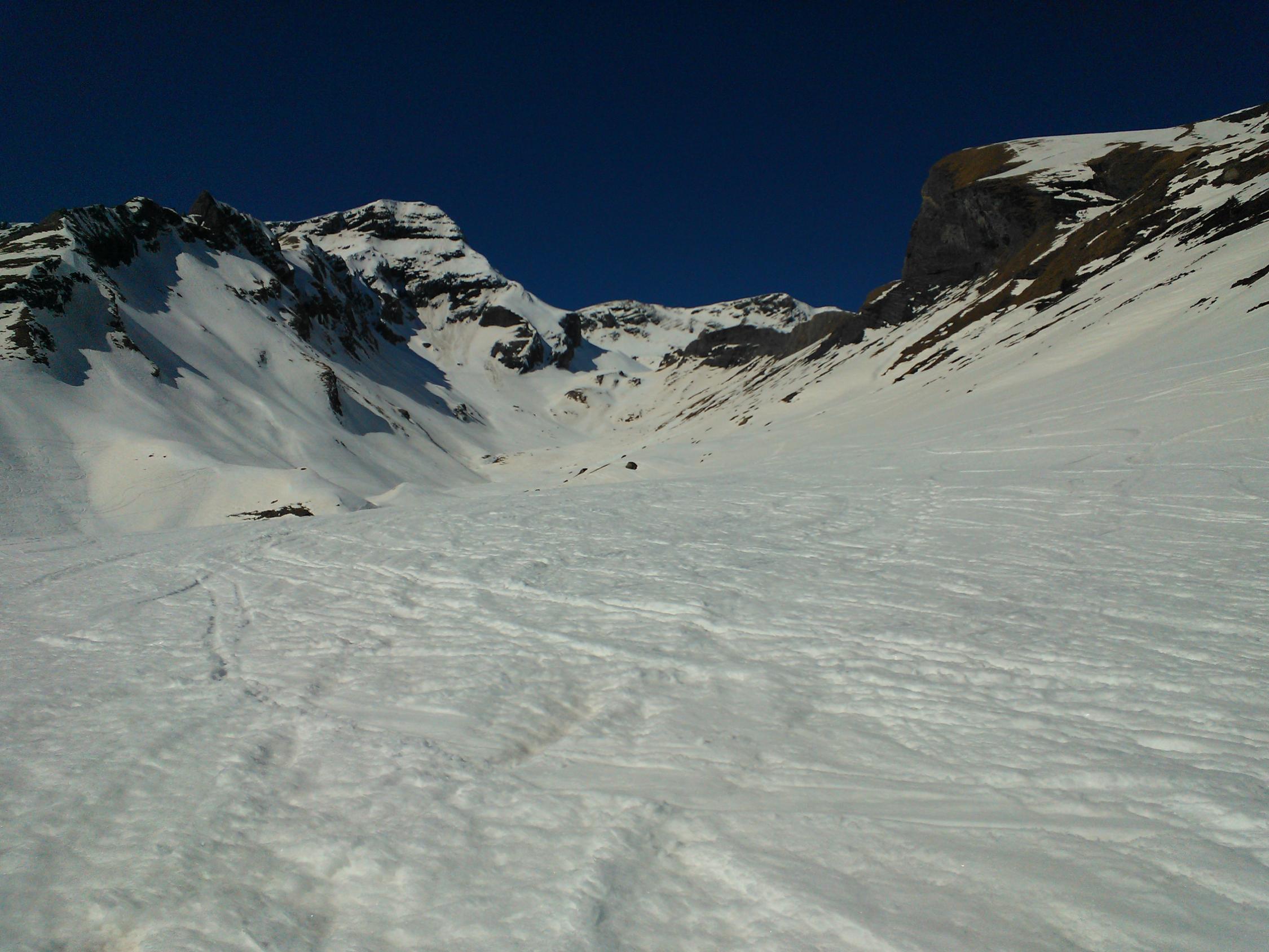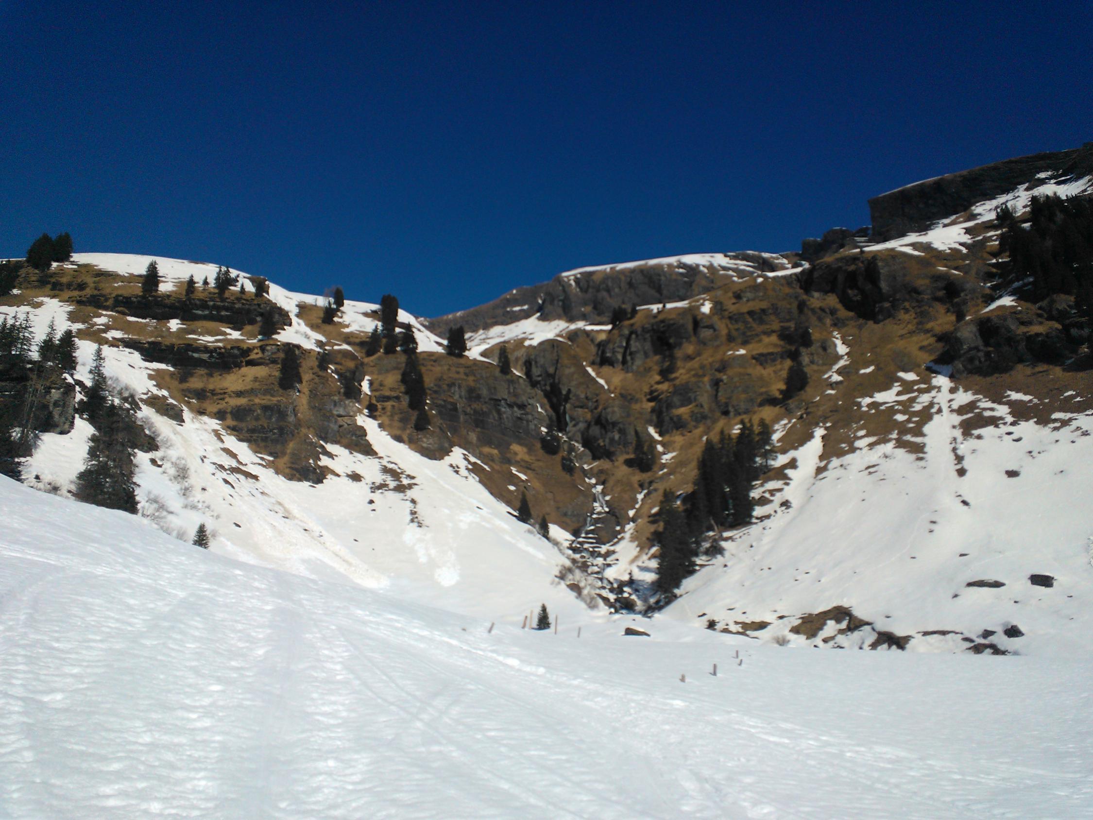 Die steilen Südhänge haben teils schon abgeladen (siehe Fotos). Bei der Abfahrt ist das Wischbächtäli meiner Meinung nach auch deshalb besser, weil man es lawinensicher fahren kann. Bei der Aufstiegsroute hätte ich in den untersten Hängen Bedenken.