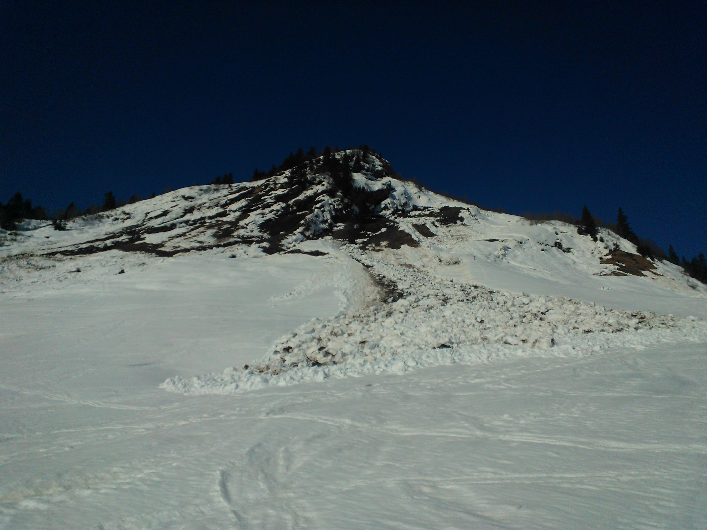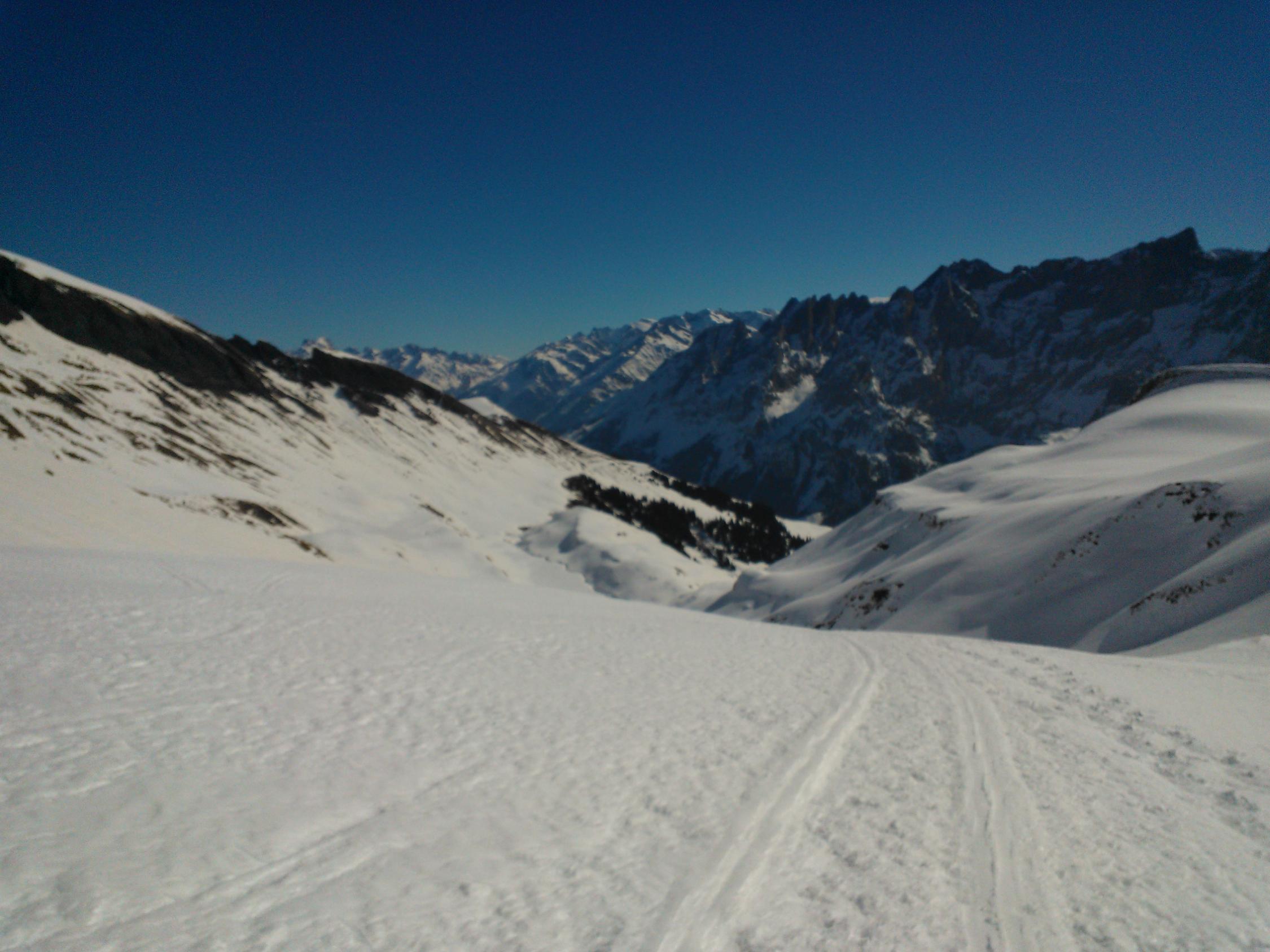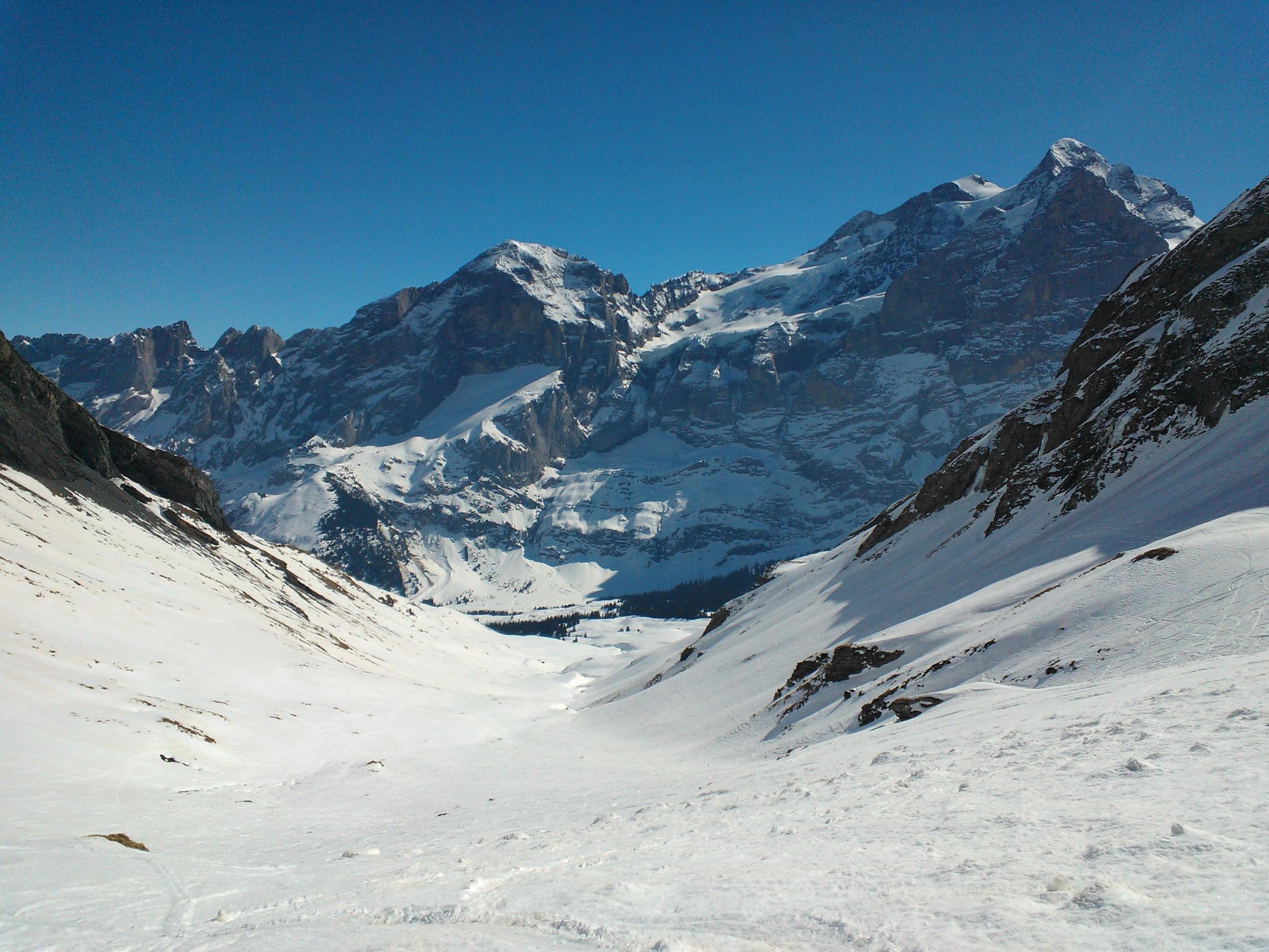 Die steilen Südhänge haben teils schon abgeladen (siehe Fotos). Bei der Abfahrt ist das Wischbächtäli meiner Meinung nach auch deshalb besser, weil man es lawinensicher fahren kann. Bei der Aufstiegsroute hätte ich in den untersten Hängen Bedenken.
