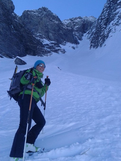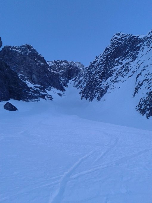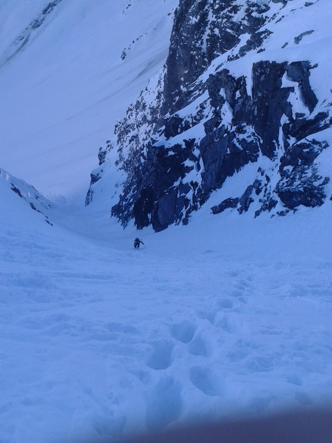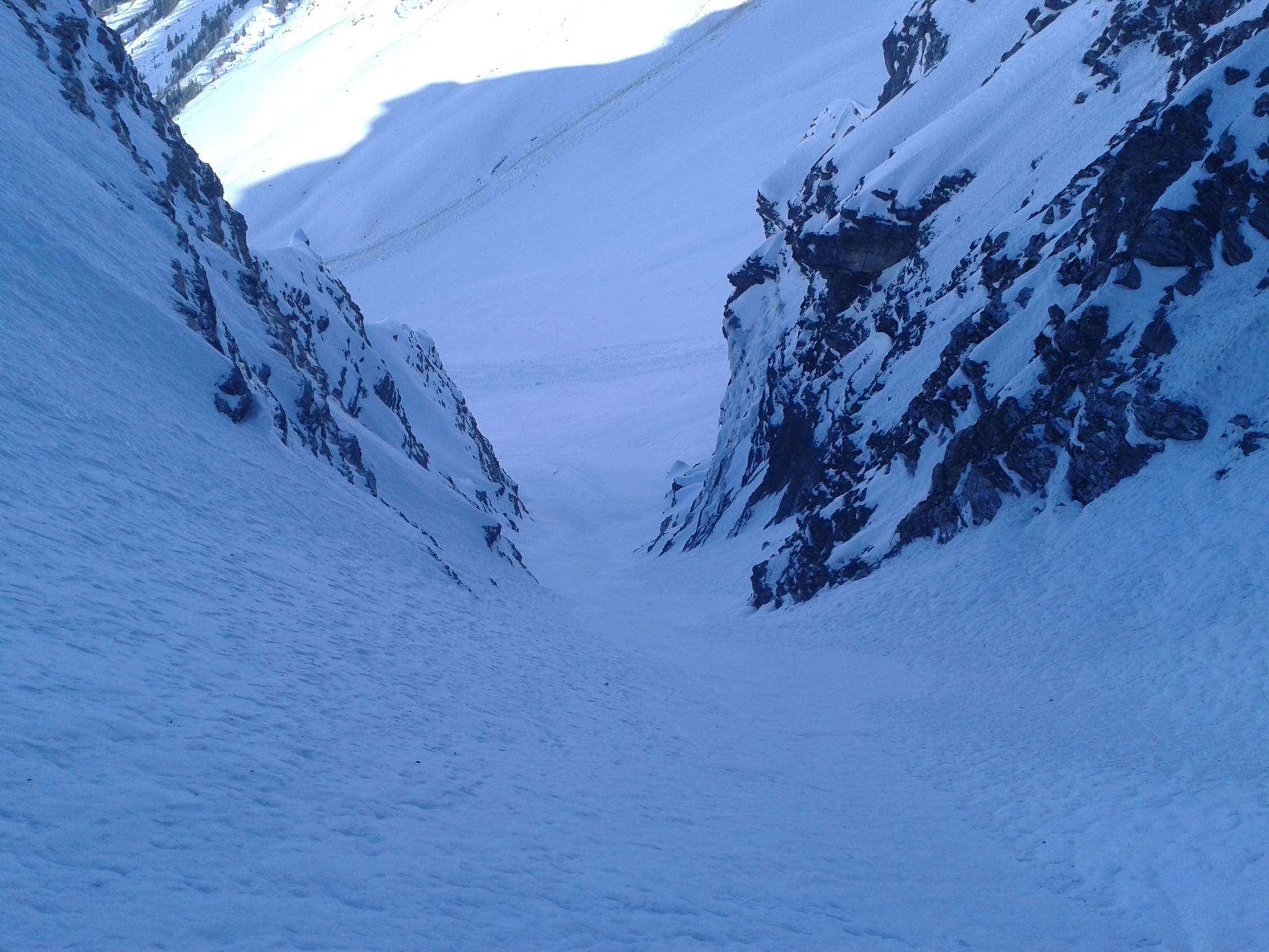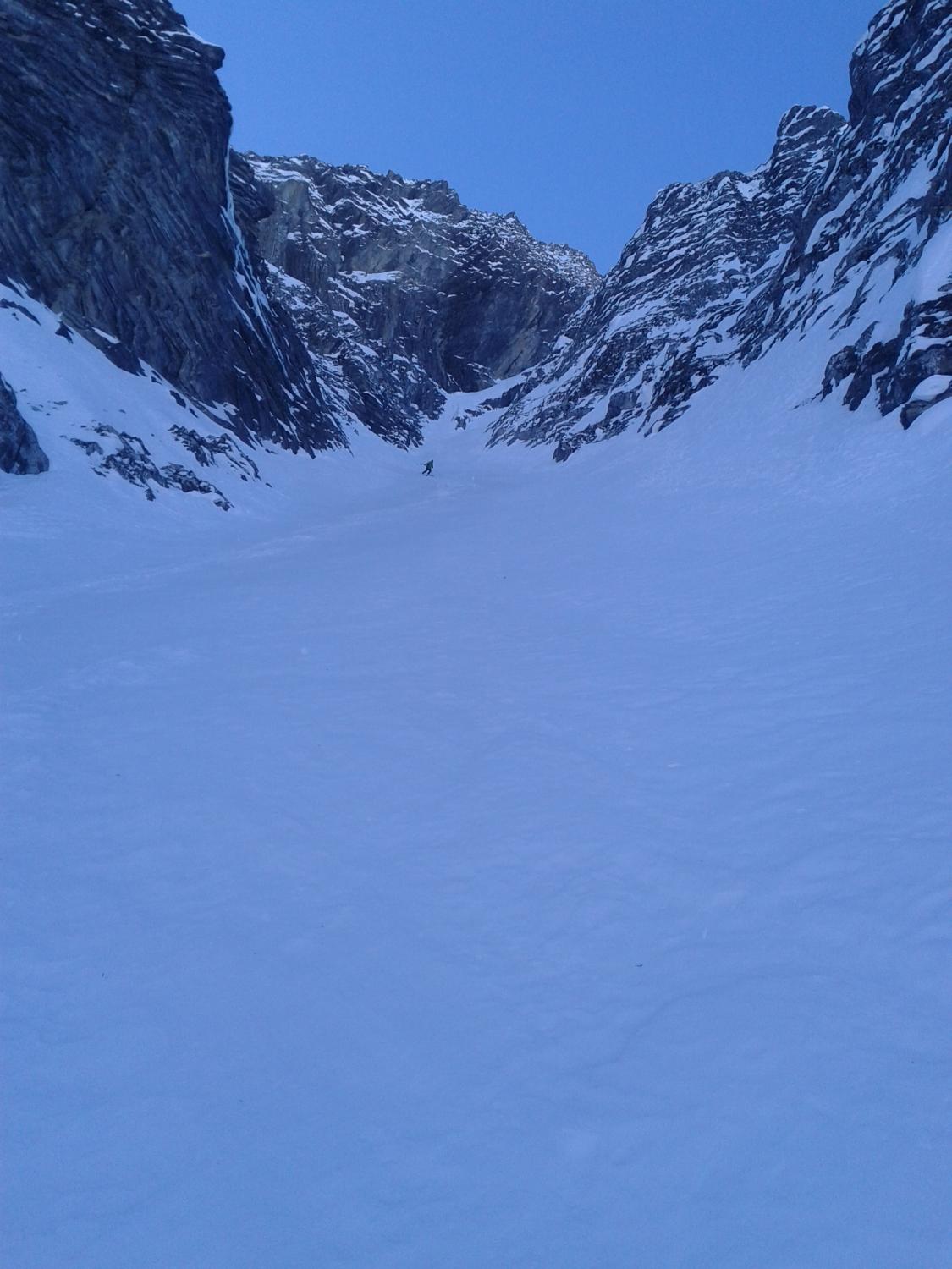 Abfahrt über das Zentrale N-Couloir, bis auf ca. 2150hm noch Pulverschnee angetroffen, das Couloir ist hart aber gut fahrbar.