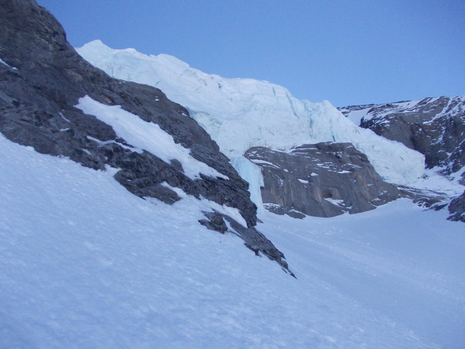Wichtig, ca 150 Hoehenmeter unter dem Serac ist ein versteckte Spalte, die beim Aufstieg fast nicht zu sehen ist.