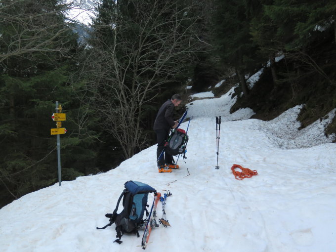 Parken direkt hinter der Brücke links, am Beginn des Wanderwegs. Wir sind um 6.20 Uhr gestartet. Den markierten Weg östlich vom Bach hoch, die Ski getragen bis zur Fahrstrasse. Diese dann mit den Skis weiter, kurze apere Stellen. Es liegt viel Schnee im Gebiet. Der Gletscher ist sehr gut eingeschneit. Hinter Geländekuppen verbergen sich ein paar offene Spalten. Vorsicht bei der Abfahrt.