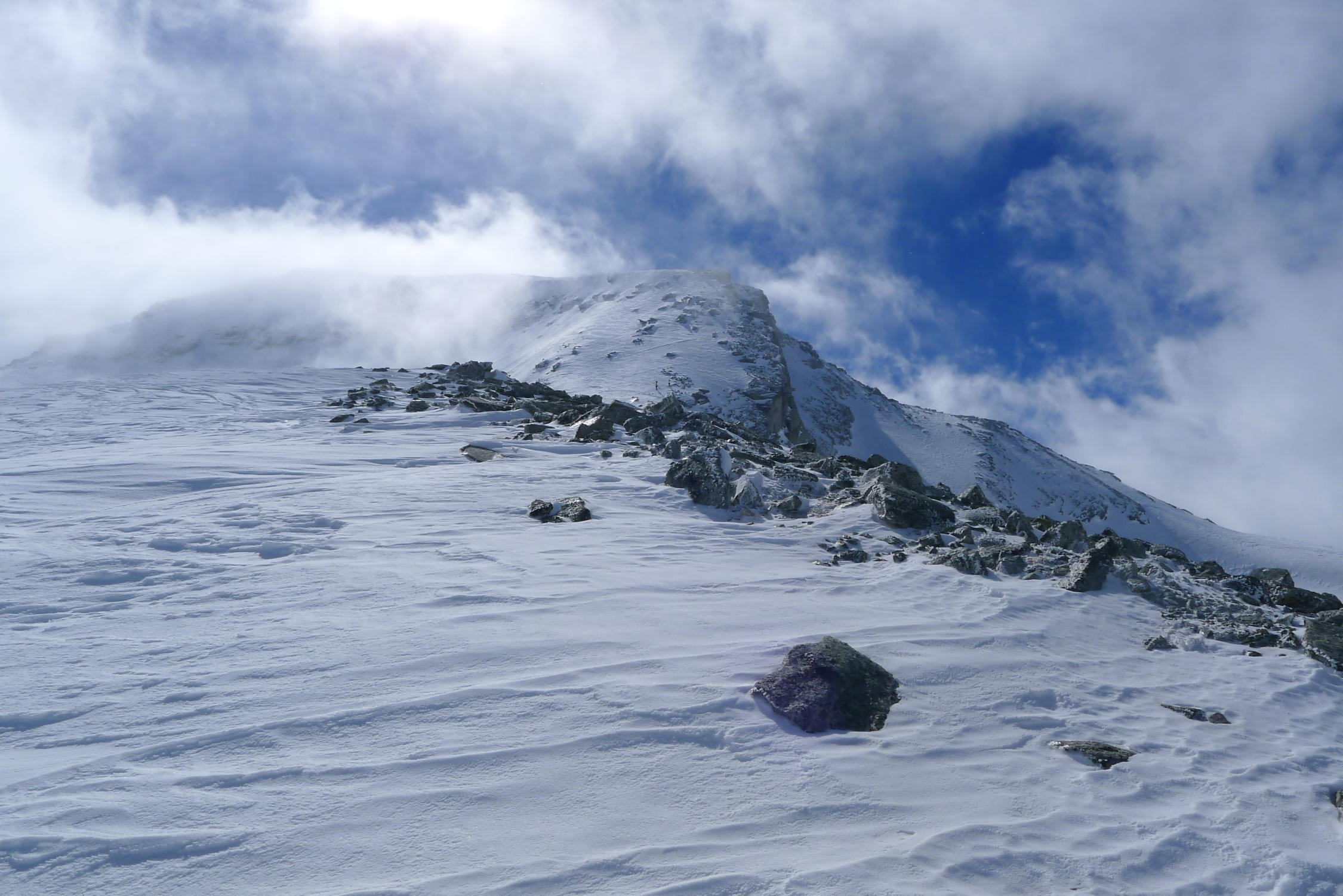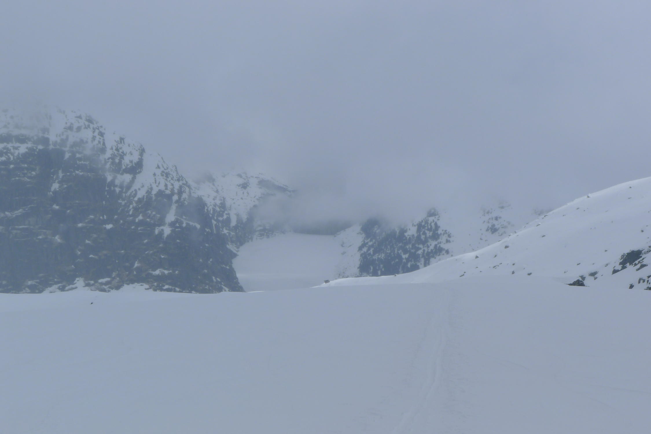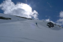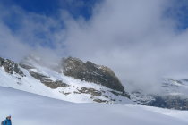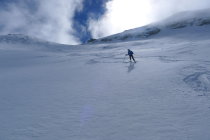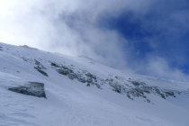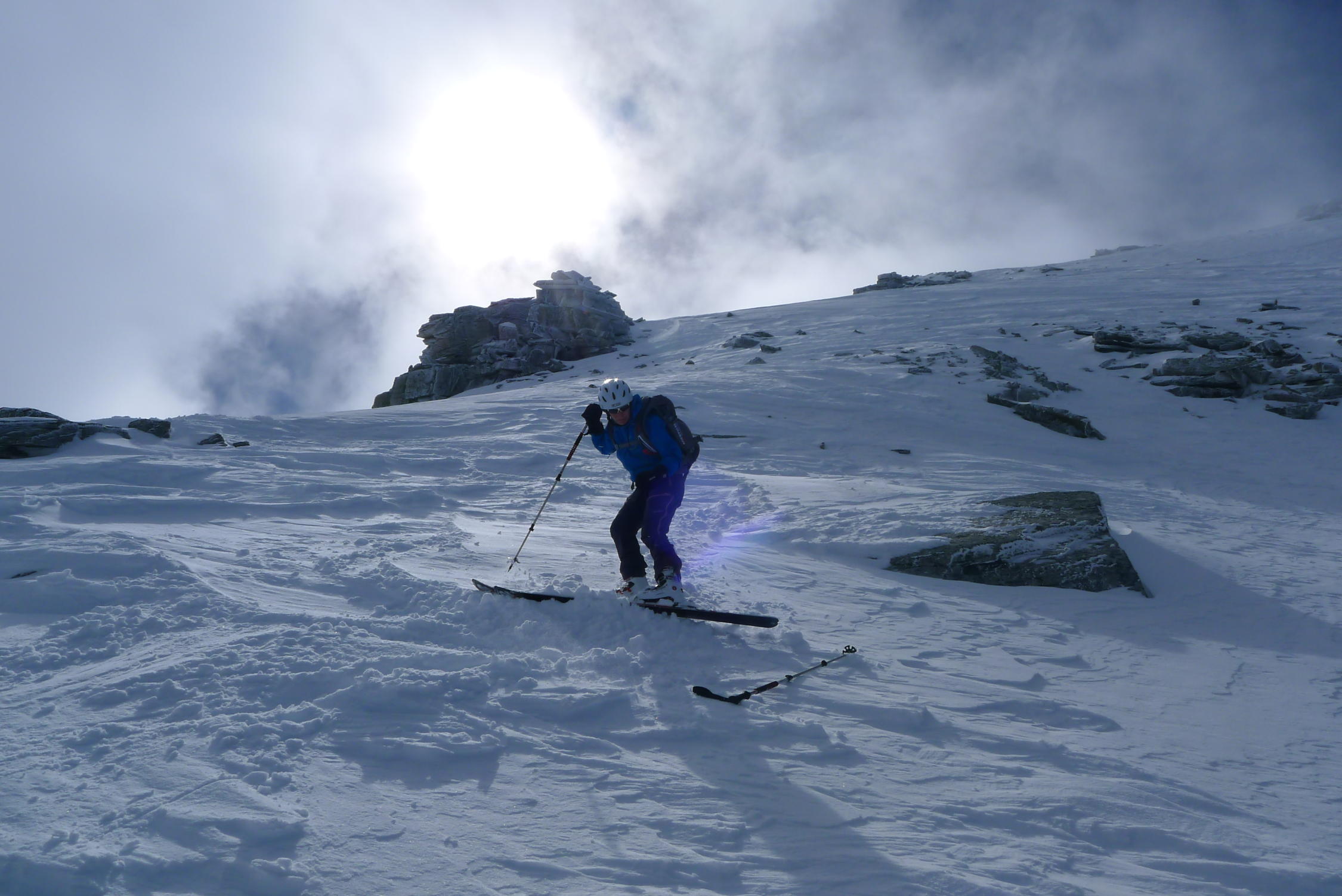 Prompt verpassten wir den Nordgrat und landeten im Nebel am Ostgrat des Gipfels. Kaum hatten wir die Ski abfahrtsbereit riss es auf. Ab dann gute Sicht und vermehrt blauer Himmel.
