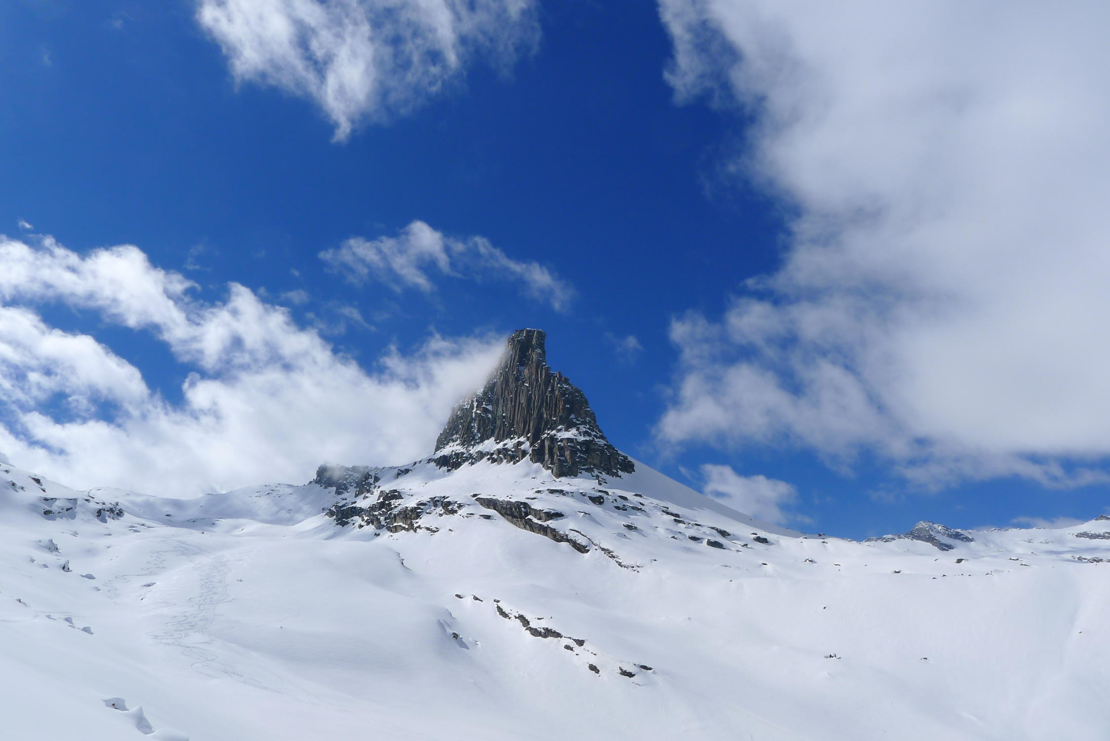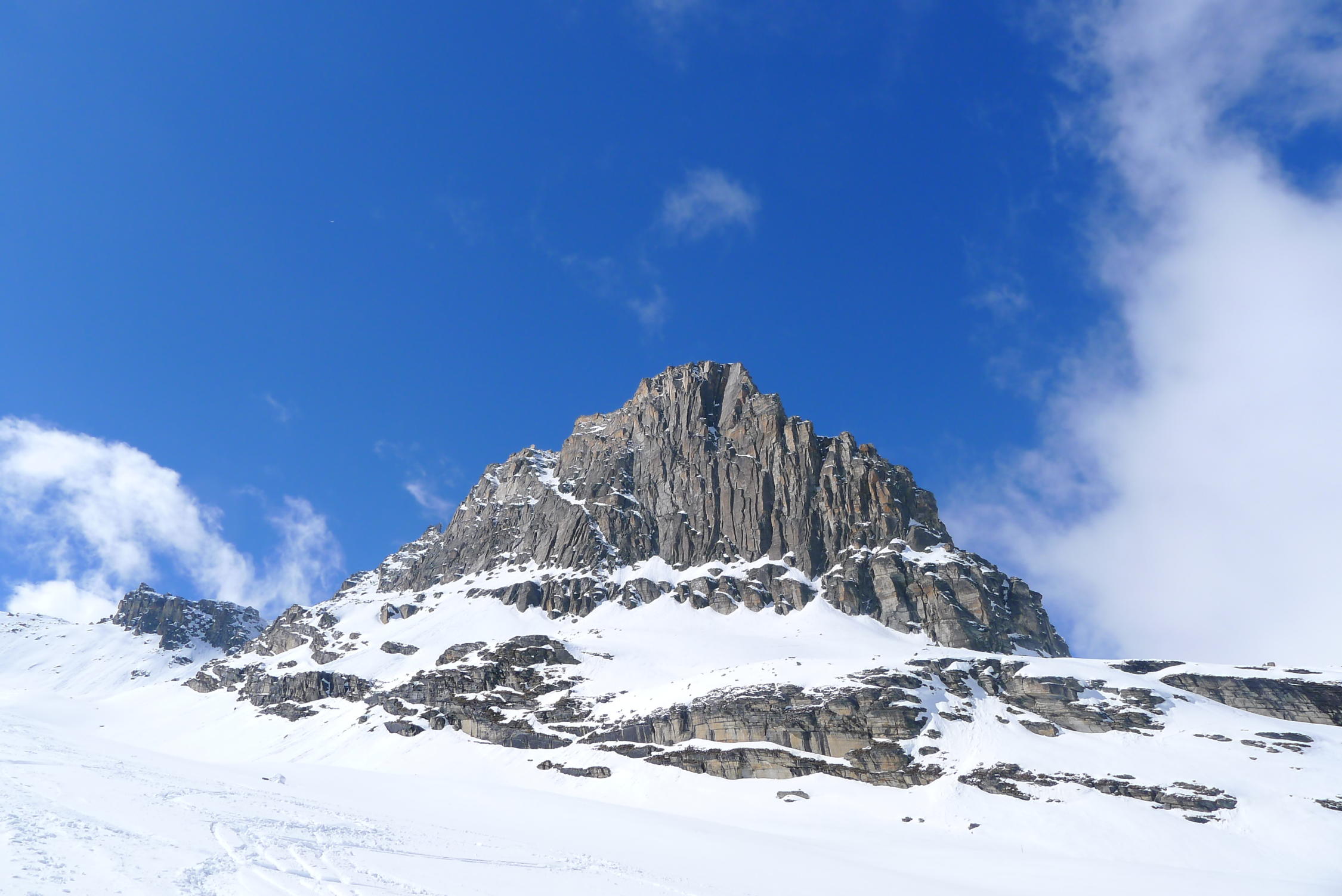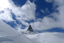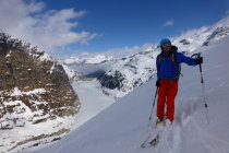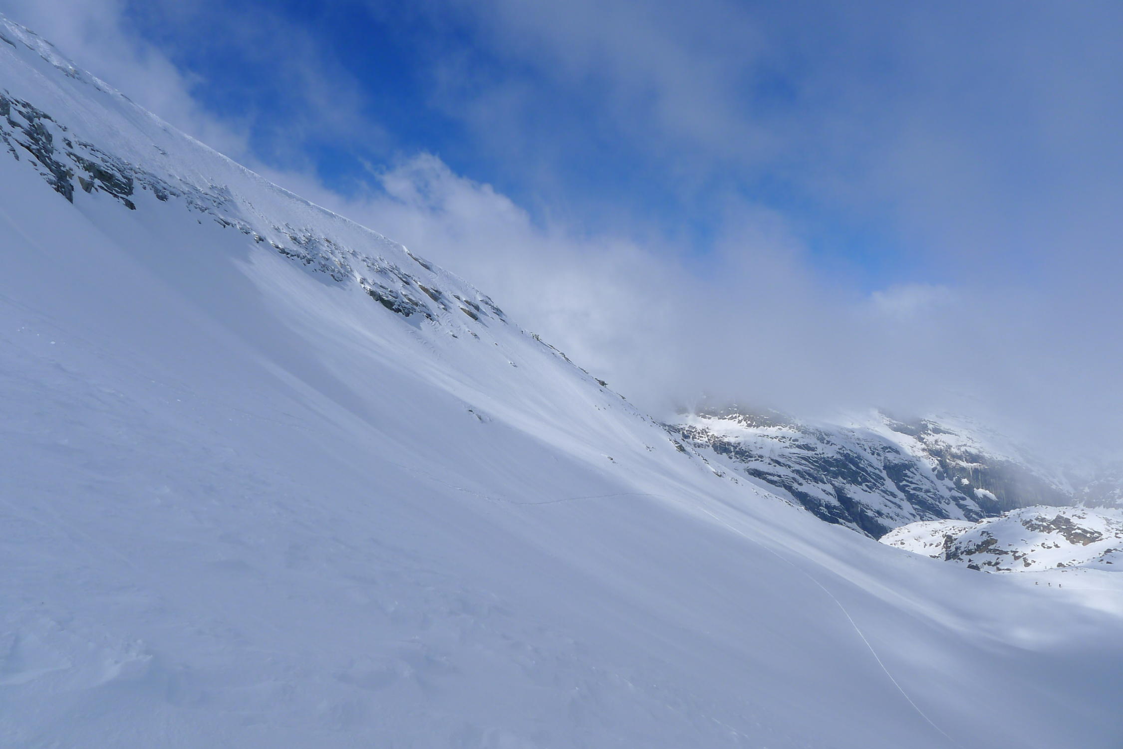 Prompt verpassten wir den Nordgrat und landeten im Nebel am Ostgrat des Gipfels. Kaum hatten wir die Ski abfahrtsbereit riss es auf. Ab dann gute Sicht und vermehrt blauer Himmel.