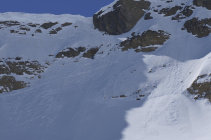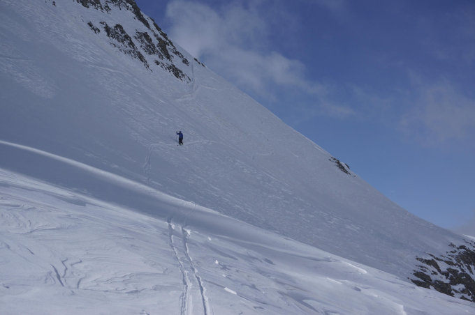 Gut, fester Schnee mit ganz wenig frischen Pulver. In den Südwestflanken schauen schon etliche Steine heraus, bis zum Gipfel.