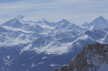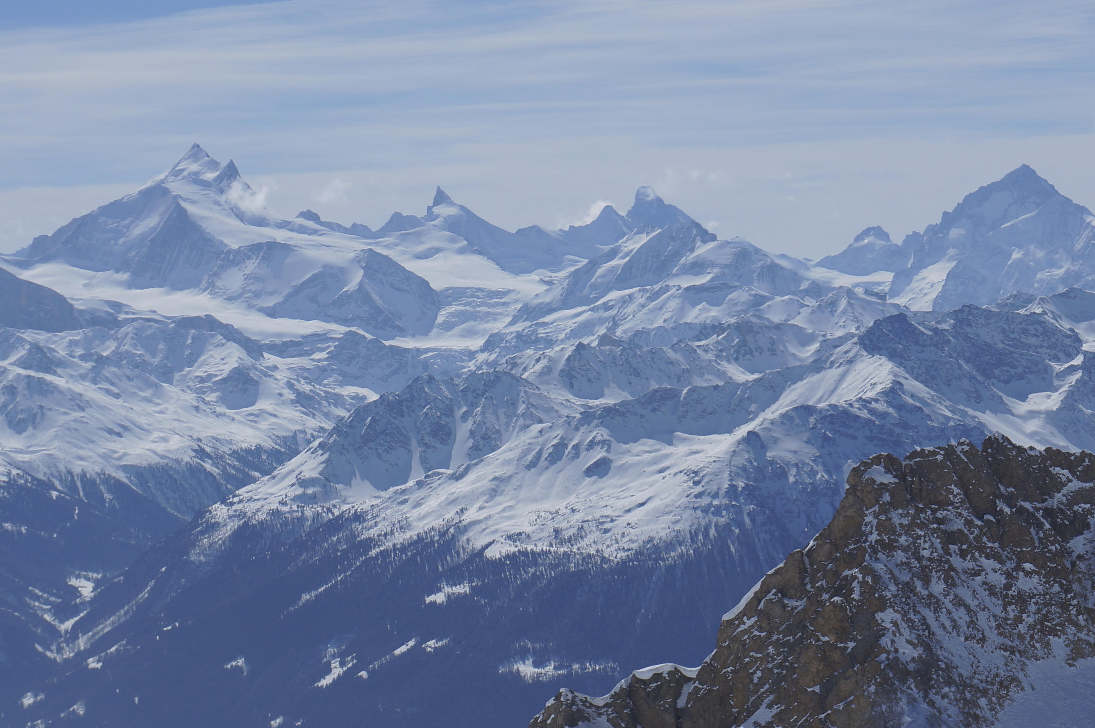 Heute herrliche Sicht trotz sich nur langsam verziehender Wolken, auf Walliser Viertausender, Mt. Blanc, Finsteraarhorn etc.