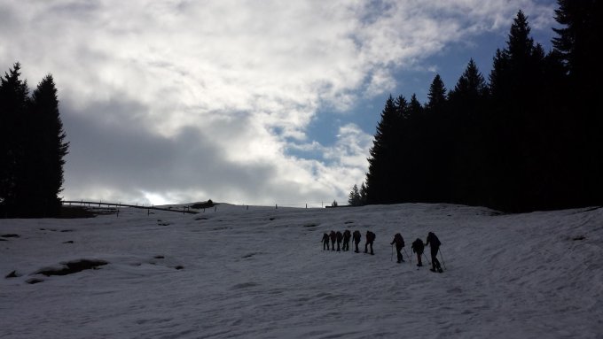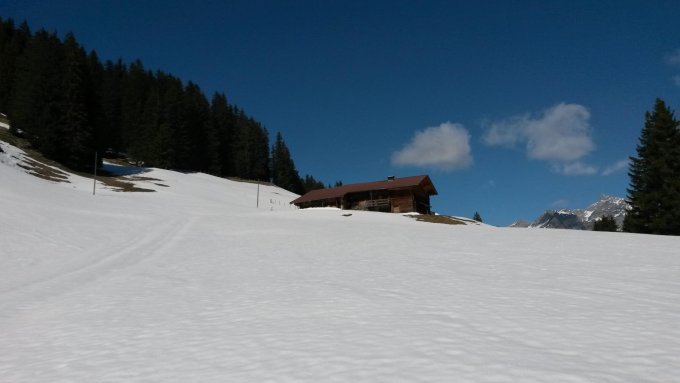 Durchgehende Schneedecke ab ca. 1155m, ab dort können Schneeschuhe angezogen werden. Den Temperaturen entsprechend weichte der Schnee im Laufe des Tages immer weiter auf (v.a. Expositionen im Sektor SW-O); ein früher Aufbruch ist vorteilhaft.