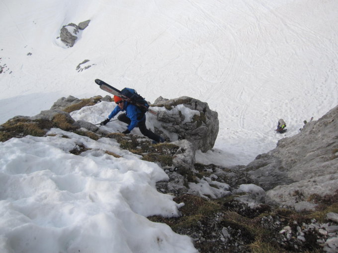 Nordhänge bis zum Drusator sehr harschig. Da wir sehr früh dran waren (Start Lindauer Hütte um 05.15 Uhr) waren auch die Querungen zur Carschinahütte und zur Sulzhütte noch fest gefroren und daher ohne großes Anschieben machbar. Im Gemschtobel liegt an der Steilstufe zwar noch Schnee, aber ist noch ohne Steigeisen machbar. Abfahrt durch den Rachen sehr stark planiert. Im latschenbestandenen Steilstück Schnee schon sehr schwer und sulzig (12 Uhr)
