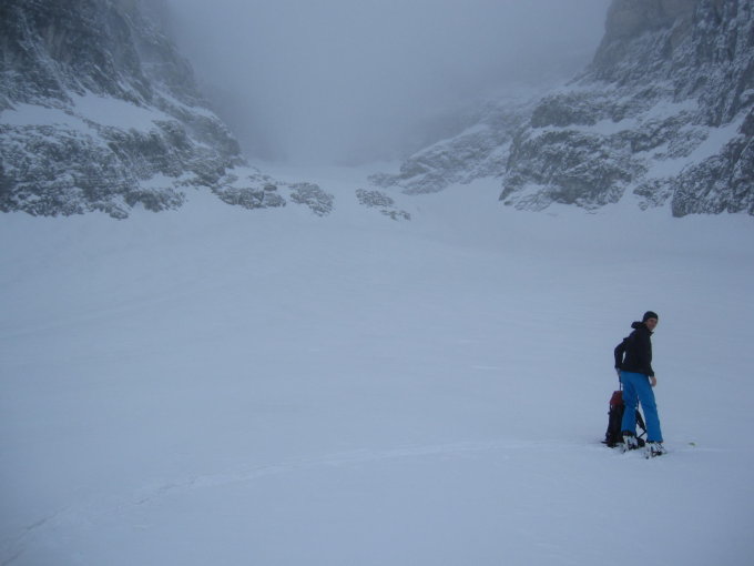 Aber unterer Teil des Eistobels (mit etwas bessere Sicht) war mit der dünnen Neuschneeauflage so gut zu fahren, dass wir ein zweites Mal bis zum Beginn der Engstelle (2300m) hochgelaufen sind.
