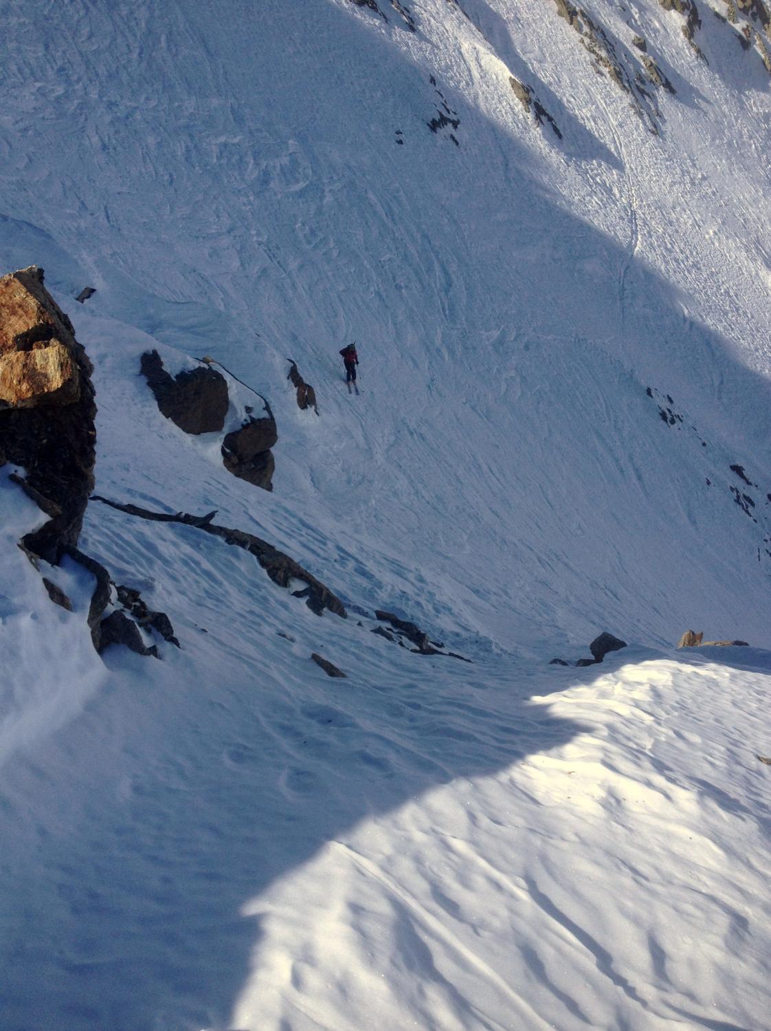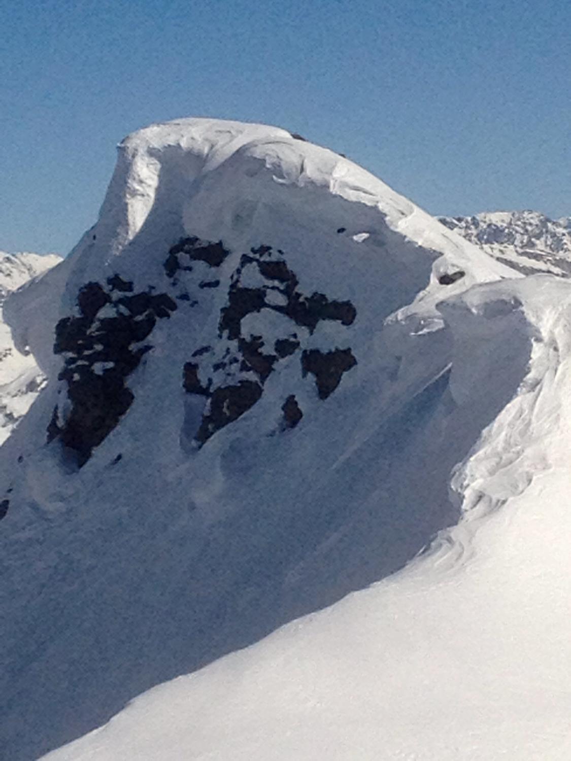 Stürmischer Nordwind, daher Aufstieg im Windschatten gewählt, also von Süden hinter dem Grat. Schnee in der Rinne westl. des Gipfels immer noch Traumpulver bis hinunter "In da Steina". Weiter zur Tamboalp.