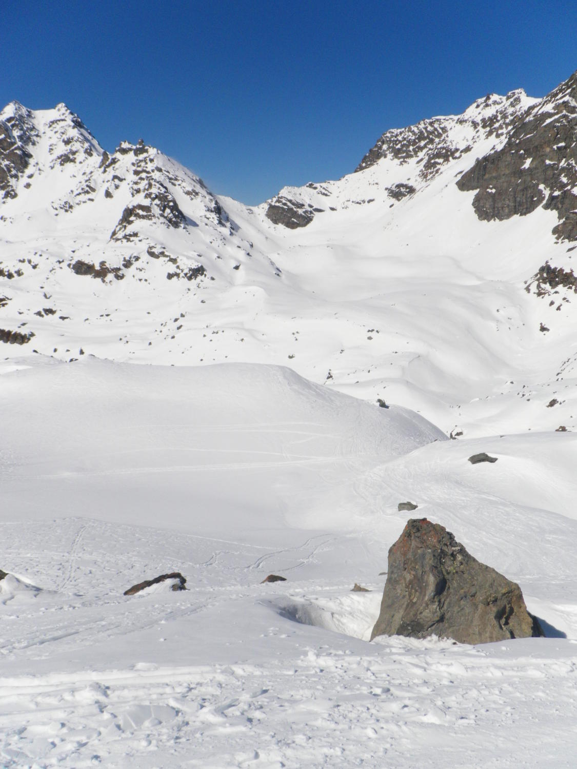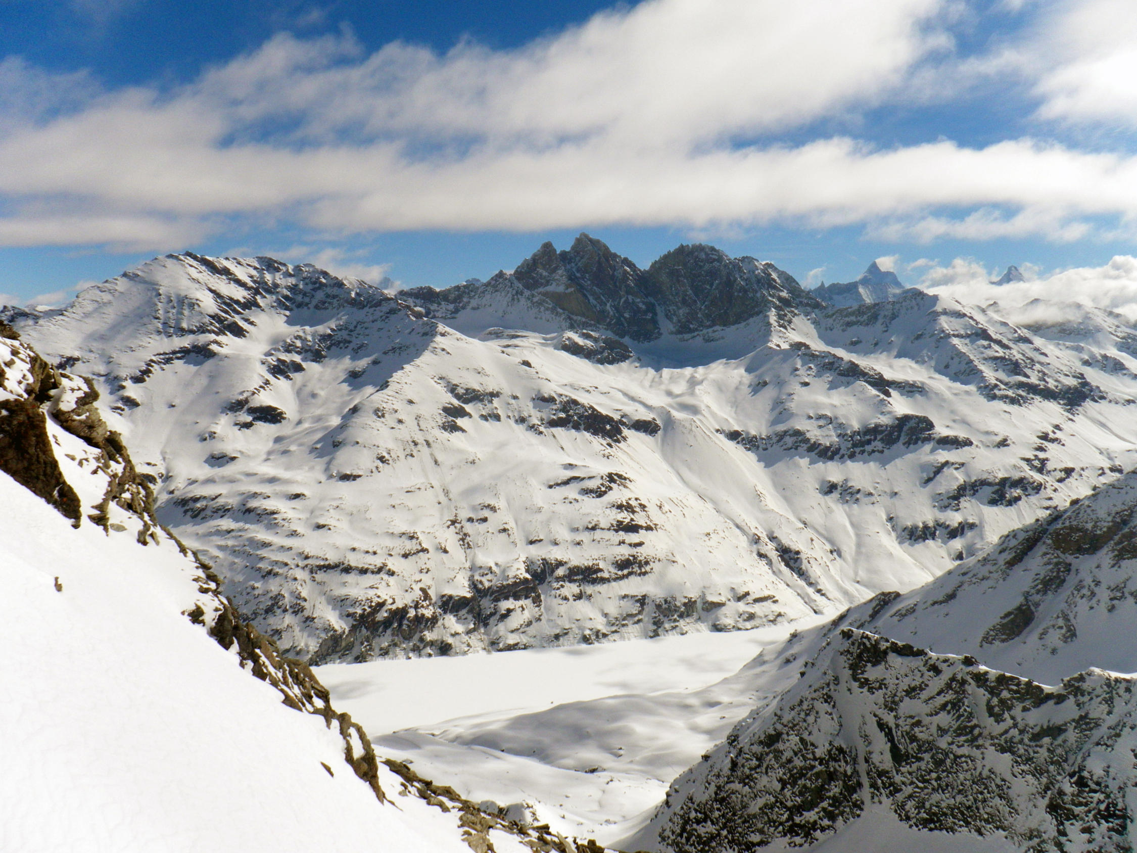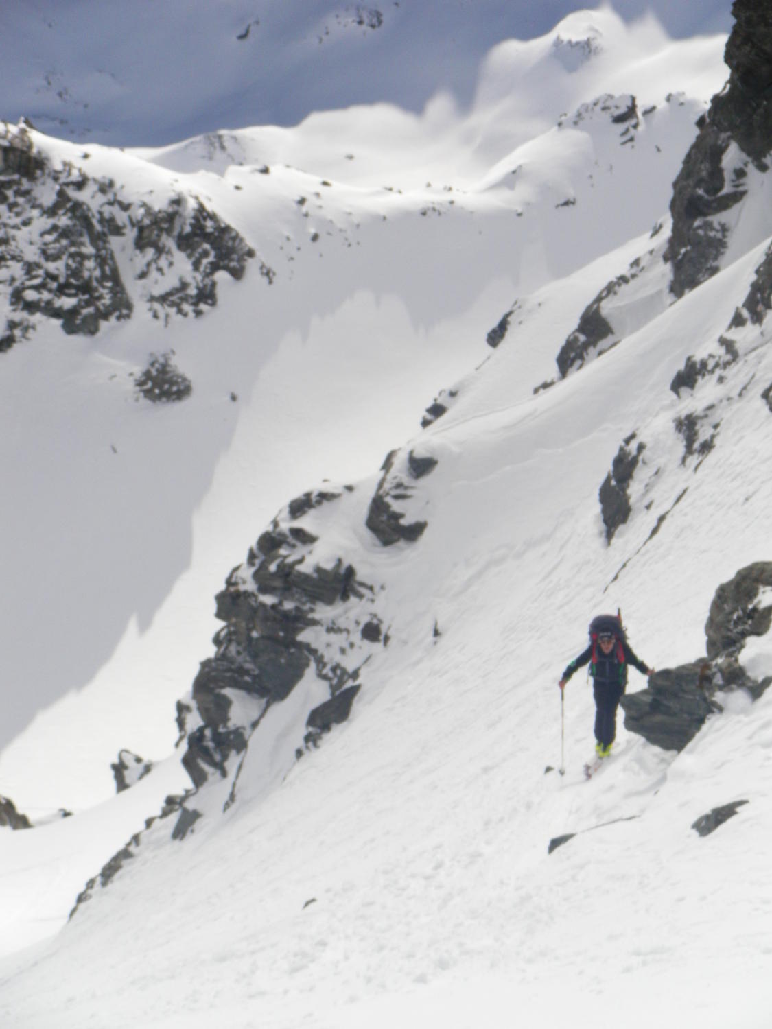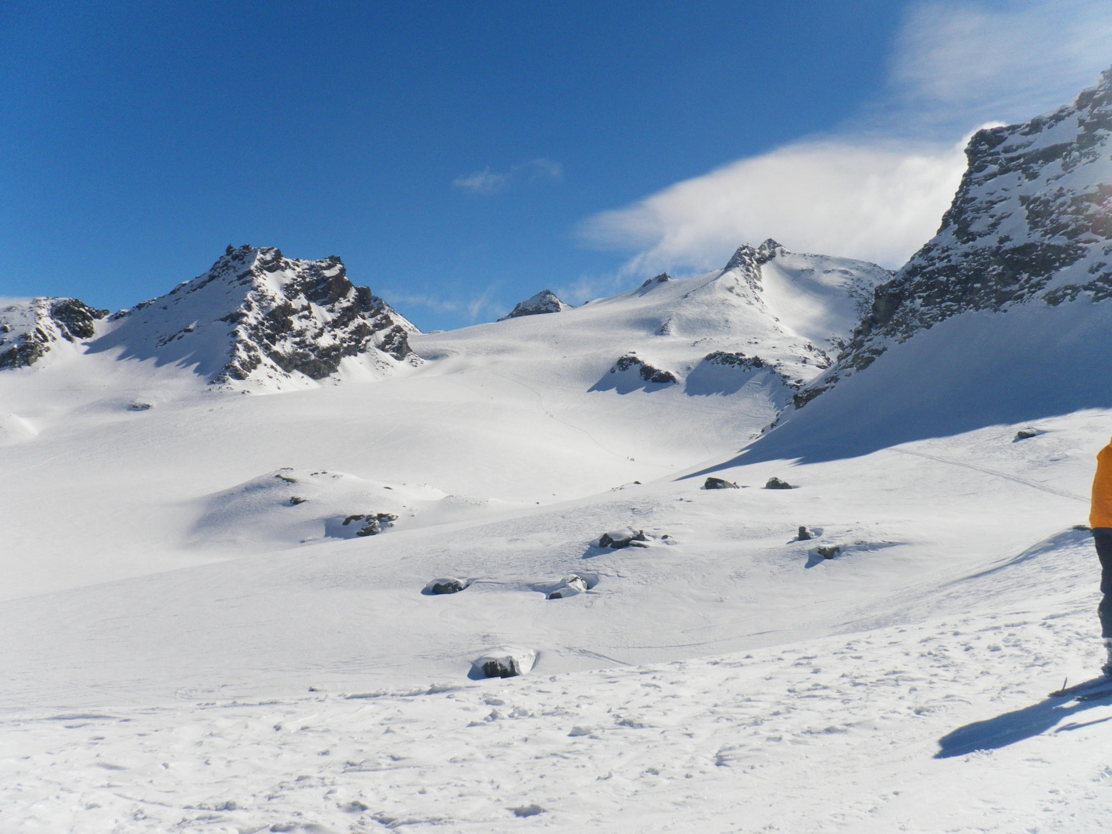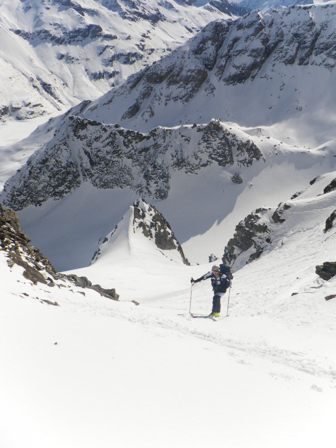In der Portage zum Col de Riedmatten ist vorsichtiges aufsetzen der Skischuhe gefragt, sonst ist man Hüfttief eingesunken. Ebenfalls beim Abstieg war je nach Körpergewicht ein einsinken nicht zu vermeiden. Der letzte Teil der Abfahrt zum Grand Dix Stausee im Pulverschnee. Entlang vom Lac des Dix gute Spur bis La Barma und die Sonne zeigte sich wie vom Wetterbericht vorhergesagt. Die Portage vom Glacier de Mourti bis Punkt 3192 östlich vom Rosablanche konnte heute mit den Ski überwunden werden. Es sind schöne Treppen für Spitzkehren vorhanden. Auf dem Sattel windstill und strahlend blauer Himmel. Anders am letzten Übergang dem Col de la Chaux starker Wind aber nicht kalt.