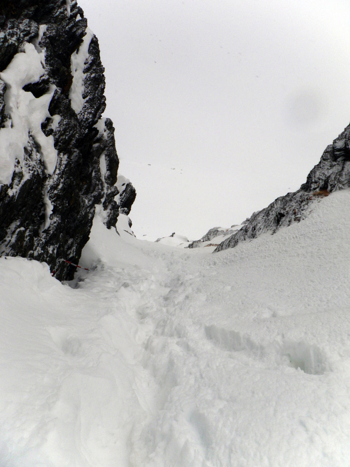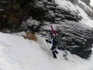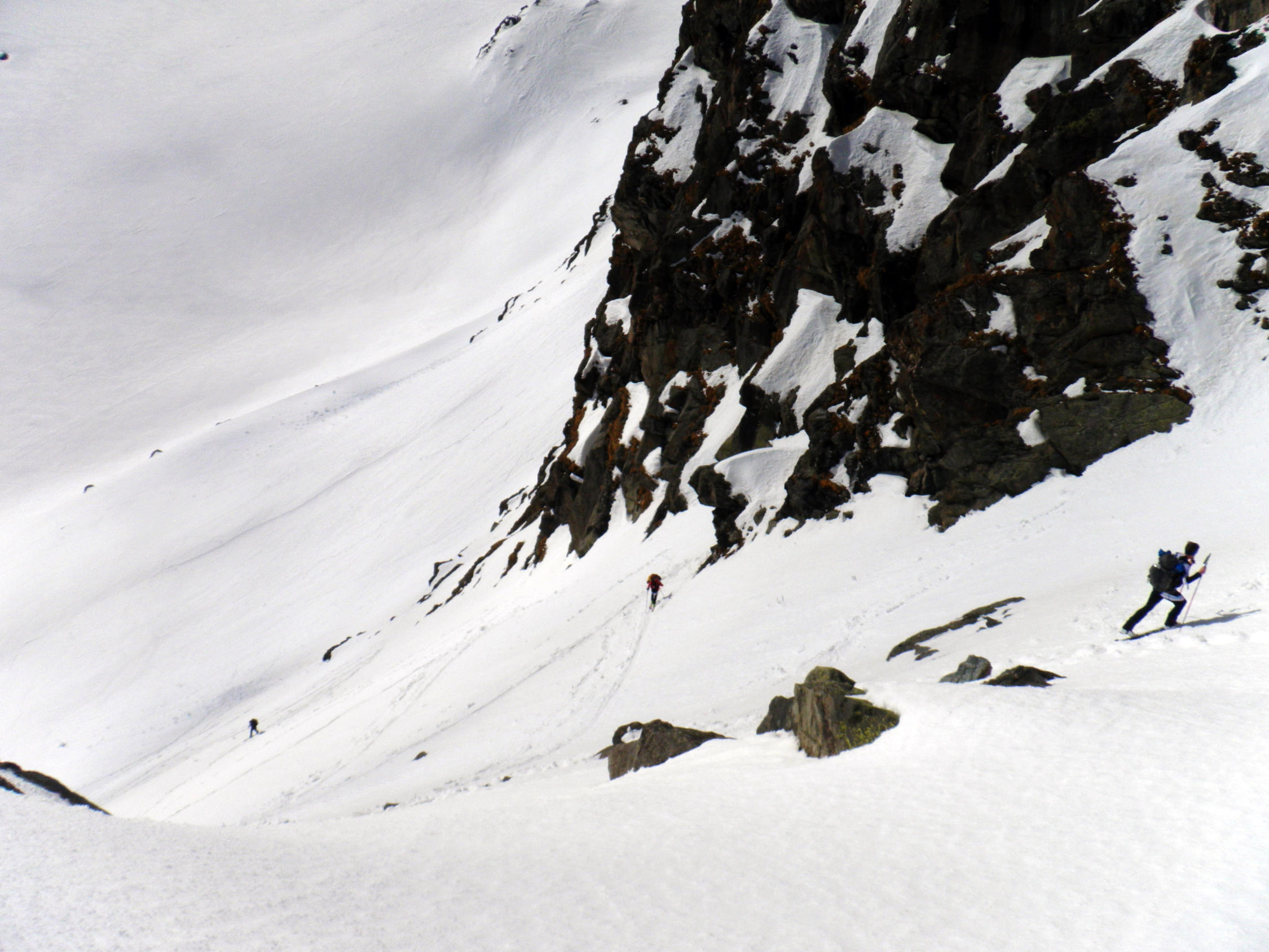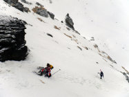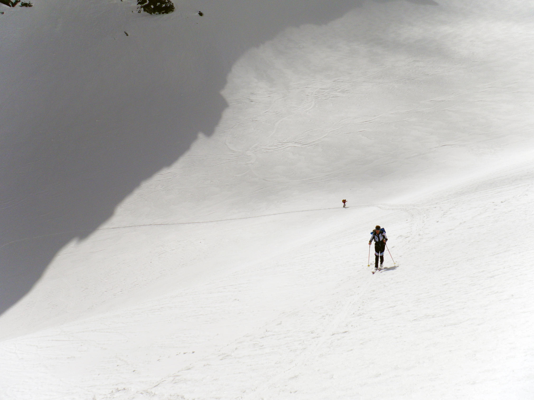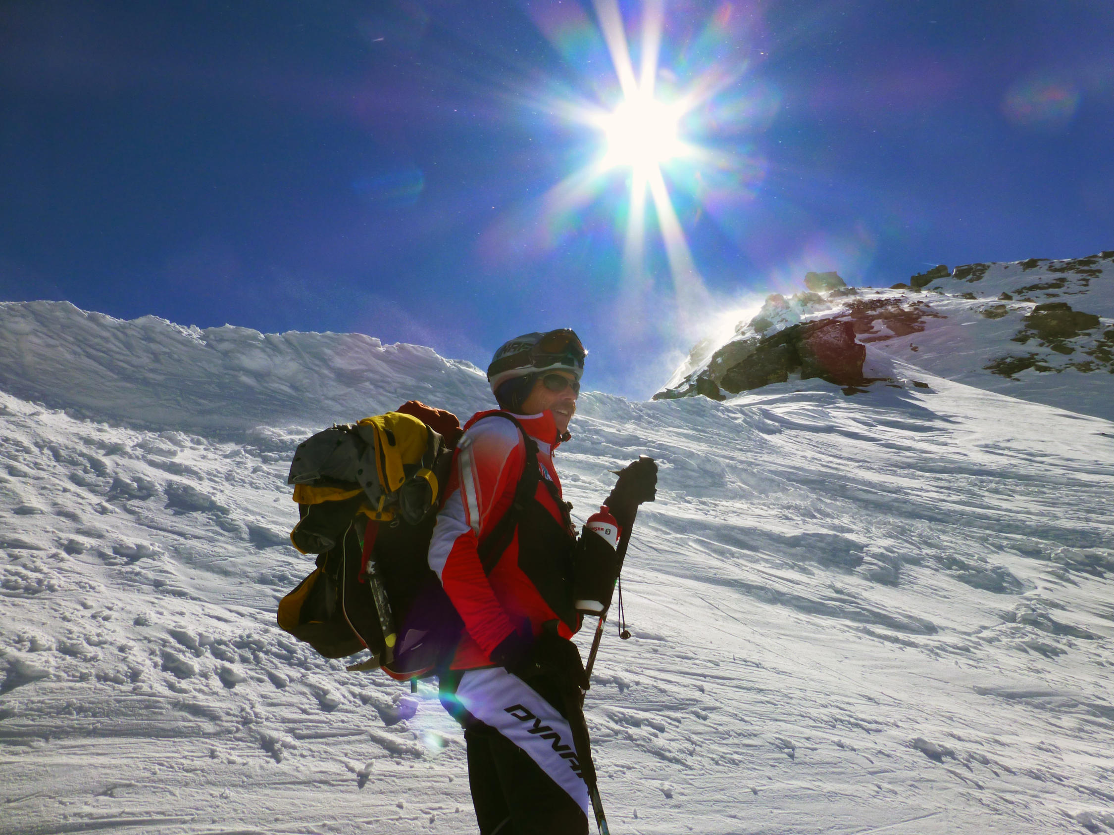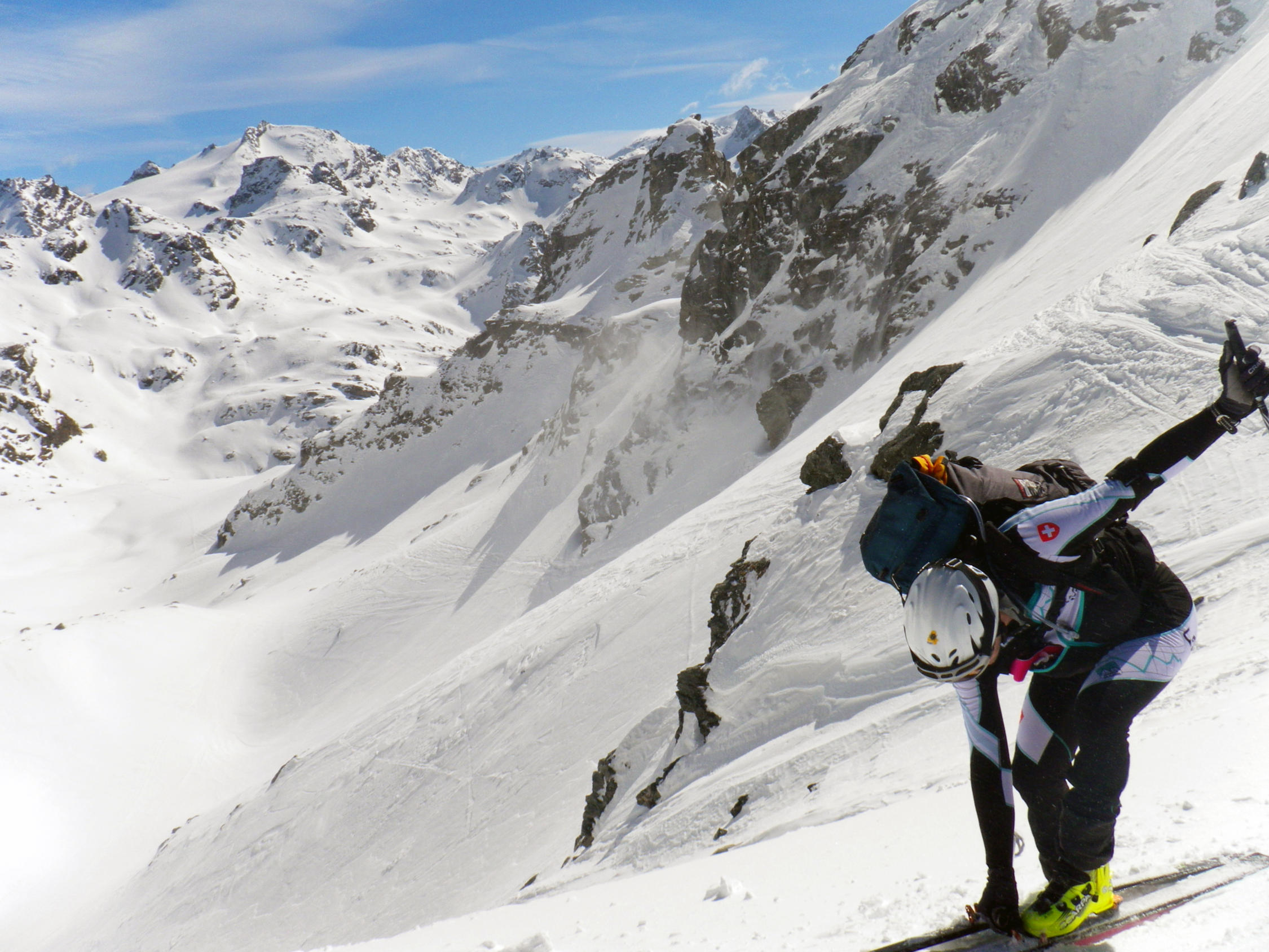 In der Portage zum Col de Riedmatten ist vorsichtiges aufsetzen der Skischuhe gefragt, sonst ist man Hüfttief eingesunken. Ebenfalls beim Abstieg war je nach Körpergewicht ein einsinken nicht zu vermeiden. Der letzte Teil der Abfahrt zum Grand Dix Stausee im Pulverschnee. Entlang vom Lac des Dix gute Spur bis La Barma und die Sonne zeigte sich wie vom Wetterbericht vorhergesagt. Die Portage vom Glacier de Mourti bis Punkt 3192 östlich vom Rosablanche konnte heute mit den Ski überwunden werden. Es sind schöne Treppen für Spitzkehren vorhanden. Auf dem Sattel windstill und strahlend blauer Himmel. Anders am letzten Übergang dem Col de la Chaux starker Wind aber nicht kalt.