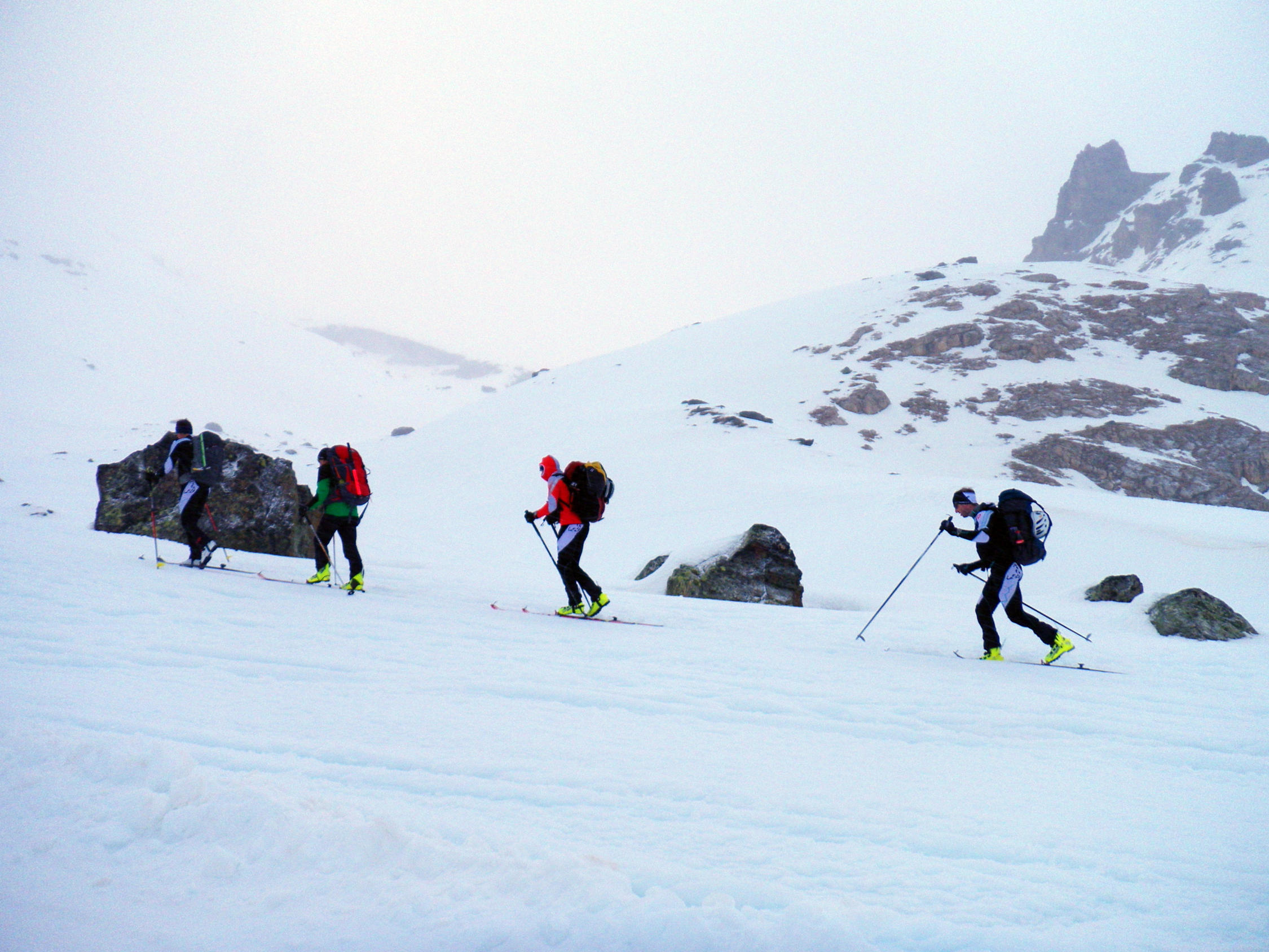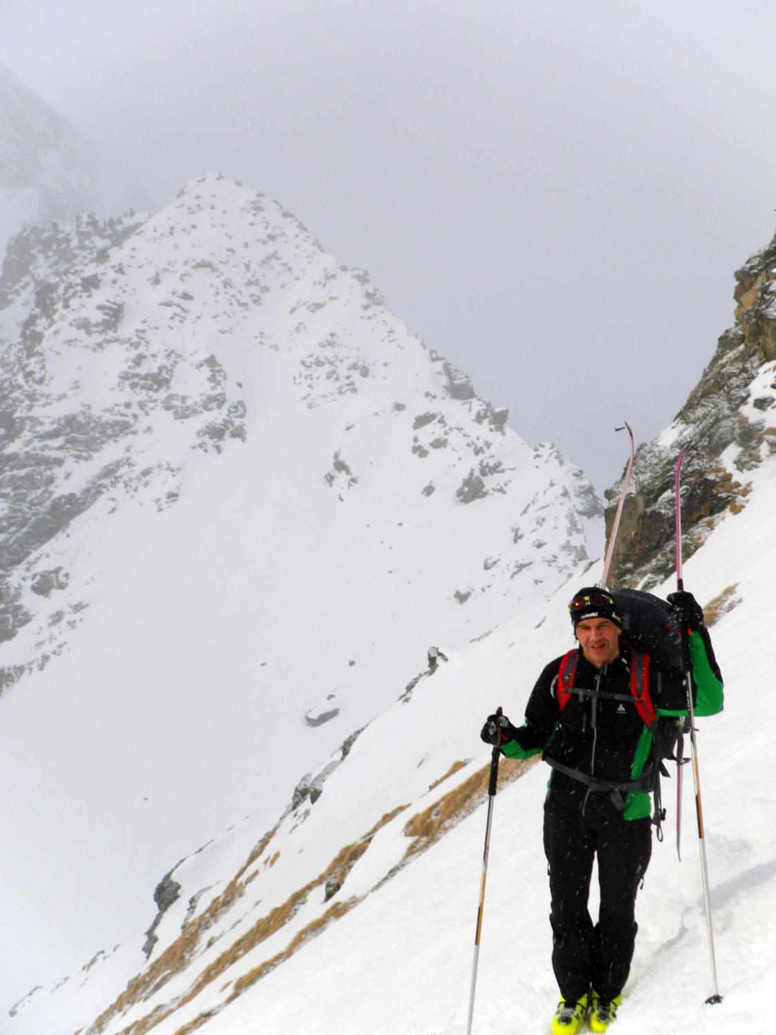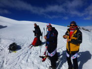 Um 6 Uhr starteten wir vom Hotel du Mont Collon in Arolla. Der Himmel war bedeckt, die Wetteraussichten versprachen aber Sonne im Tagesverlauf. Um 7.45 Uhr am Col de Riedmatten war leichter Nebel. Bei der Abfahrt zum Pas du Chat (8.30 Uhr) ein kleiner Verhauer . Wir wollten den ersten Hang Richtung Norden queren. Um möglichst wenig Höhe zu verlieren, was sich als Fehler herausstellte. Und uns zu einigen wenigen, zusätzlichen, Höhenmetern zwang. Besser fährt man Punkt 2734 an, und umfährt diesen nördlich. Weiter unten am Pas du Chat war es dann vorbei mit Slalomschwüngen. Treten auf der Fläche bis La Barma (9.10 Uhr)war angesagt. Da kommt uns der Aufstieg zum Rosablanche (10.50 Uhr) als willkommene Abwechslung richtig entgegen ;-). In der Abfahrt bis Lac du Pt Mont Fort und der Schlussaufstieg bis zum Col de la Chaux (12.00 Uhr) sind viele trainnigswillige mit Renndress anzutreffen. Auf der Schlussabfahr nach Verbier (12.45 Uhr) erlaubten wir uns nochmals einen Schnitzer. Anstatt auf unseren Routinier zu hören (5-facher PdG Teilnehmer) entschieden wir uns für die falsche Piste. Was Fussmarsch bedeutet, anstatt direkt mit den Skies bis zur Gondelbahn zu fahren. War eine super Tour und ein tolles Erlebnis die PdG Strecke einmal am Tag abzulaufen.