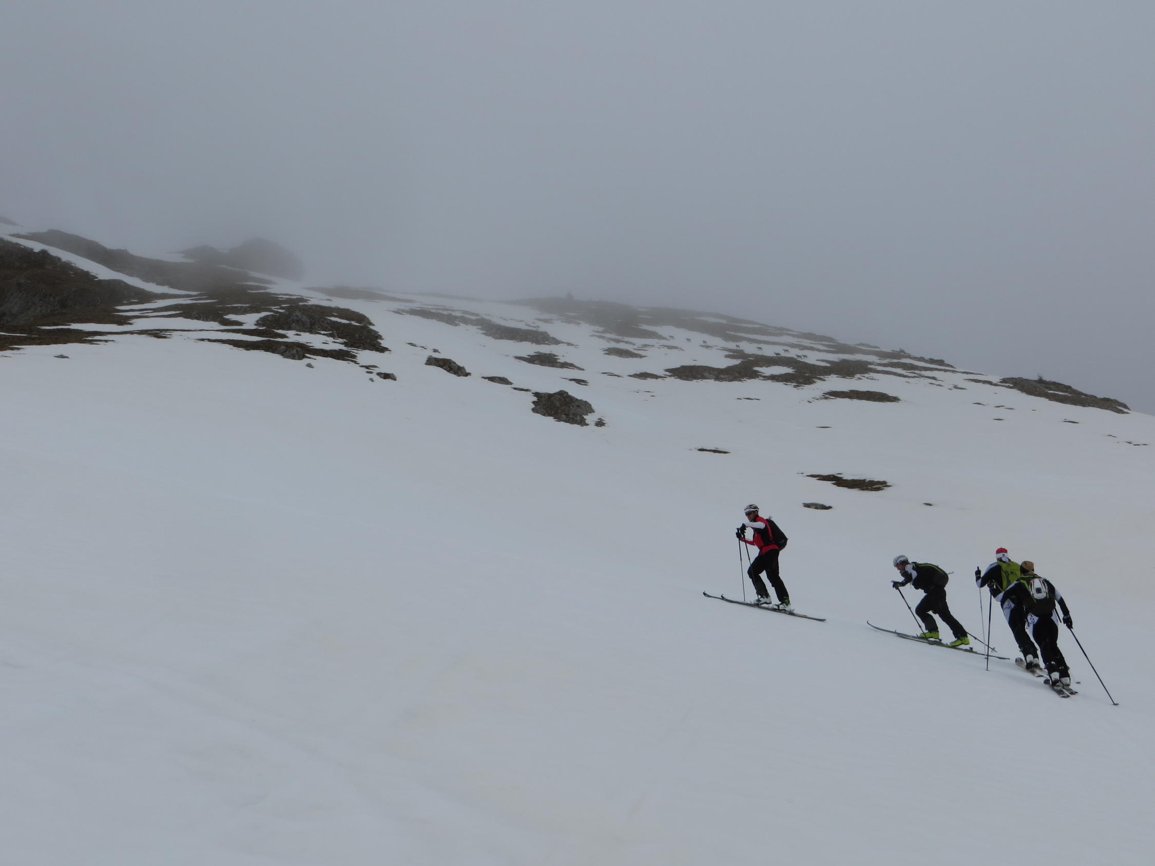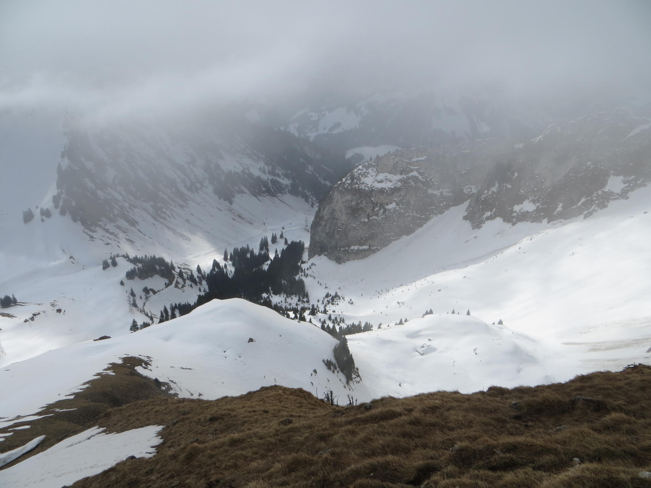Da Euschelspassstrasse nicht mehr durchgehend schneebedeckt ist,wählten wir die Aufstiegsroute via Skipiste bis Bergstation Bodenlift.Auf Piste noch hart, ansonsten teilweise bereits etwas sulzig.Aufstieg zum Fochsen ohne Harscheisen problemlos.