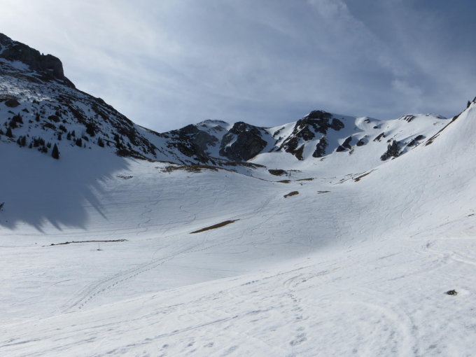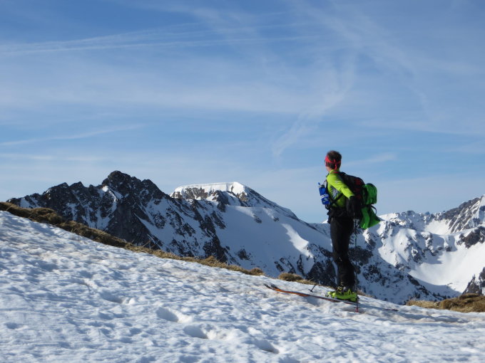 Bereits leicht sulzig. Gipfelhang nicht mehr durchgehend schneebedeckt, daher haben wir etwas oberhalb des Ausstieges beim Ochsensattel unsere Skis deponiert und sind zu Fuss bis zum Gipfel. Couloir nur noch beim Einstieg etwas Schnee vorhanden.