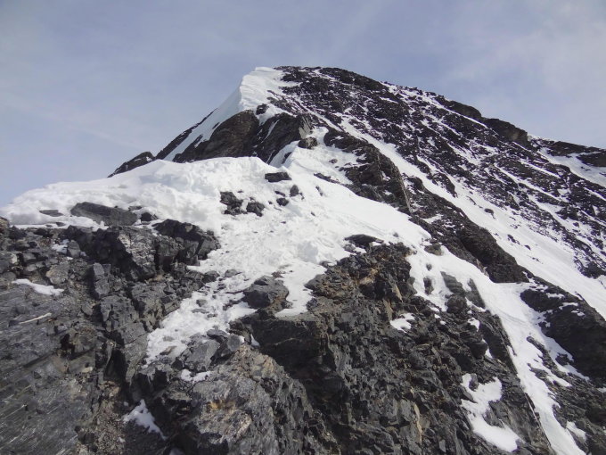 8.15 Start bei Stn. Eigergletscher, Aufstieg mit Ski, hartgefrorener Schnee. Auf 2820 m unter dem Felsriegel schnalle ich die Steigeisen an. Ski auf den Rucksack. Je höher ich aufsteige, desto härter wird der Schnee, darunter teilweise Eis. Vorsicht ist geboten. Der Abbruch verhält sich ruhig, steige links vorbei. Auf 3470 m zwischen den Felsen Skidepot. Ich muss erkennen, dass eine Skiabfahrt vom Gipfel nicht möglich ist. Zu wenig Schnee, zu viele senkrecht verlaufende Felsbänder mit nur wenigen Metern Abstand. Der Aufstieg auf dem eisig harten Schnee, auf den Vorderzacken, ist eine Schinderei. Auf ca. 3850 m steige ich nach links auf den Westgrat aus und erreiche in leichtem Gelände auf Fels und Schnee den Gipfel.