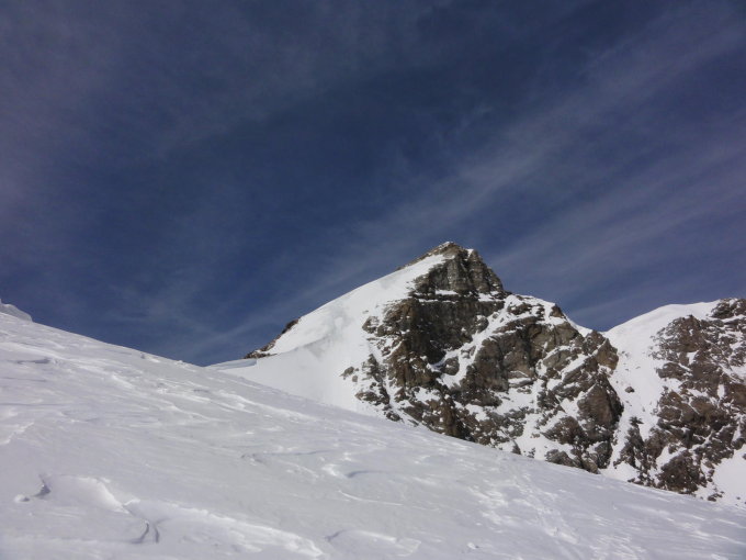 Der bereite Rücken des Rottalhorn E-Sporns weisst 2 längliche Spalten auf die nur leicht mit Schnee bedeckt sind.