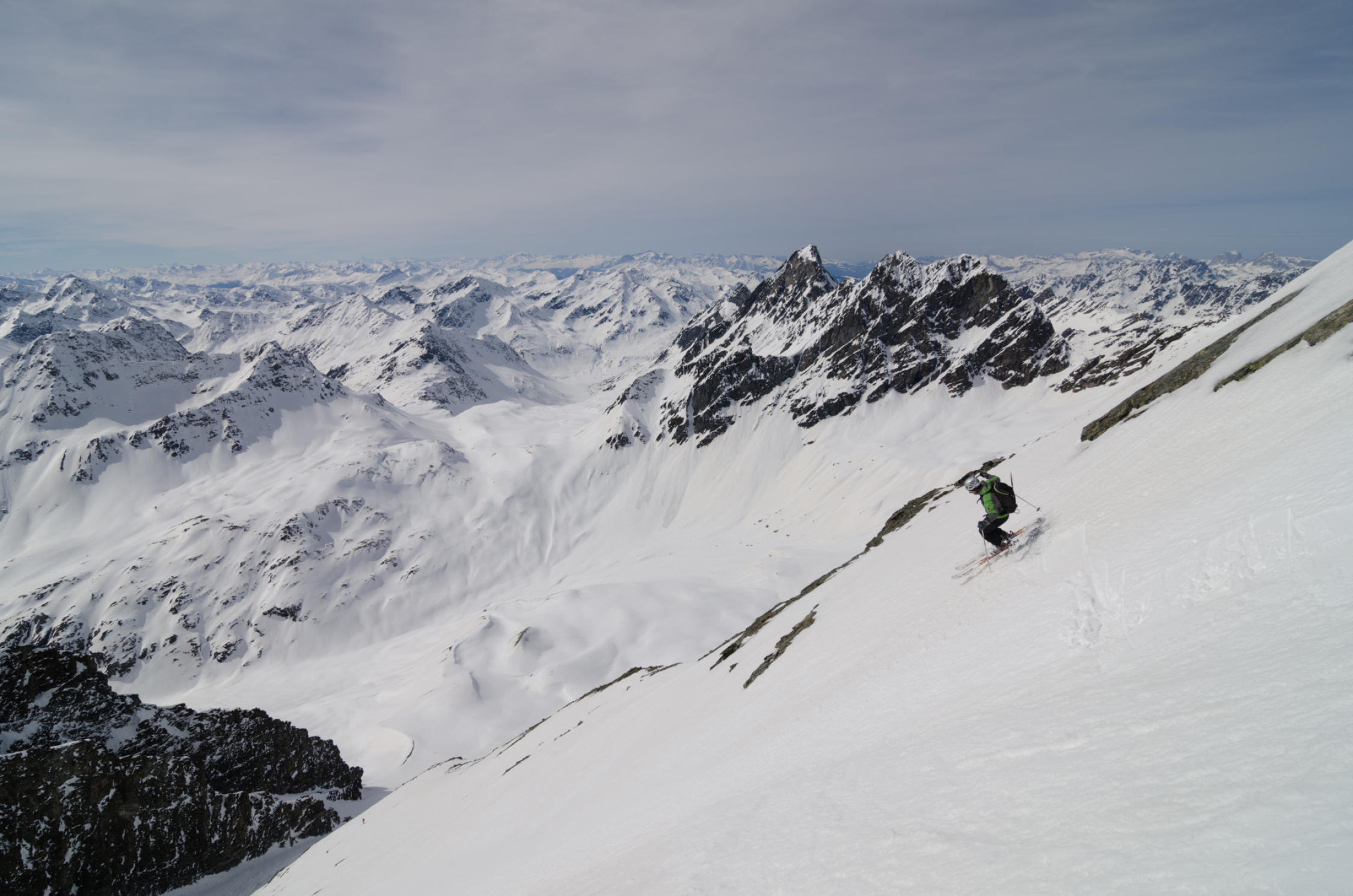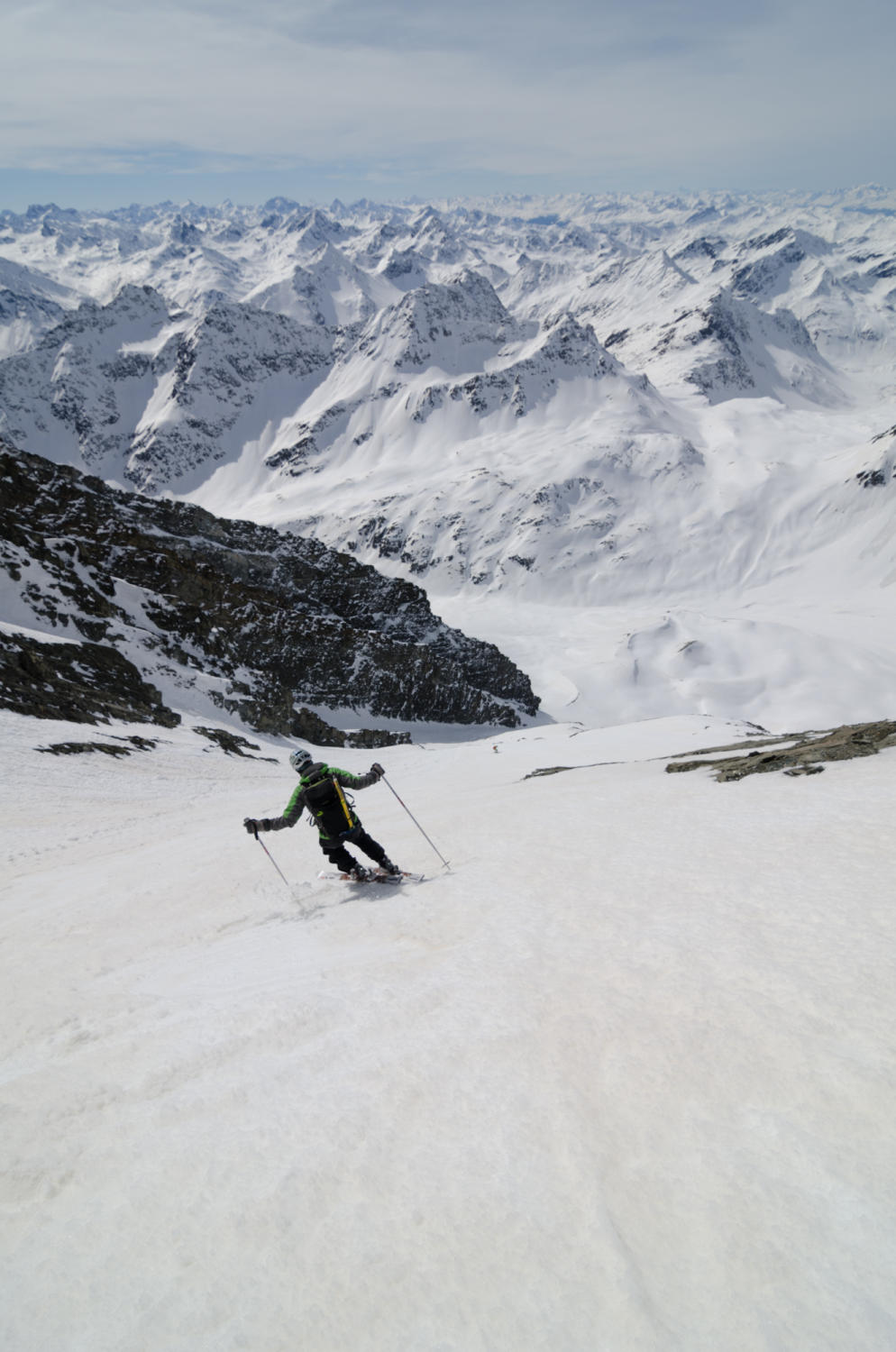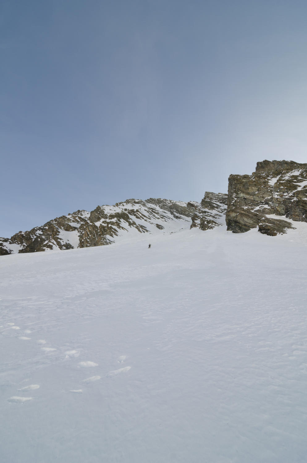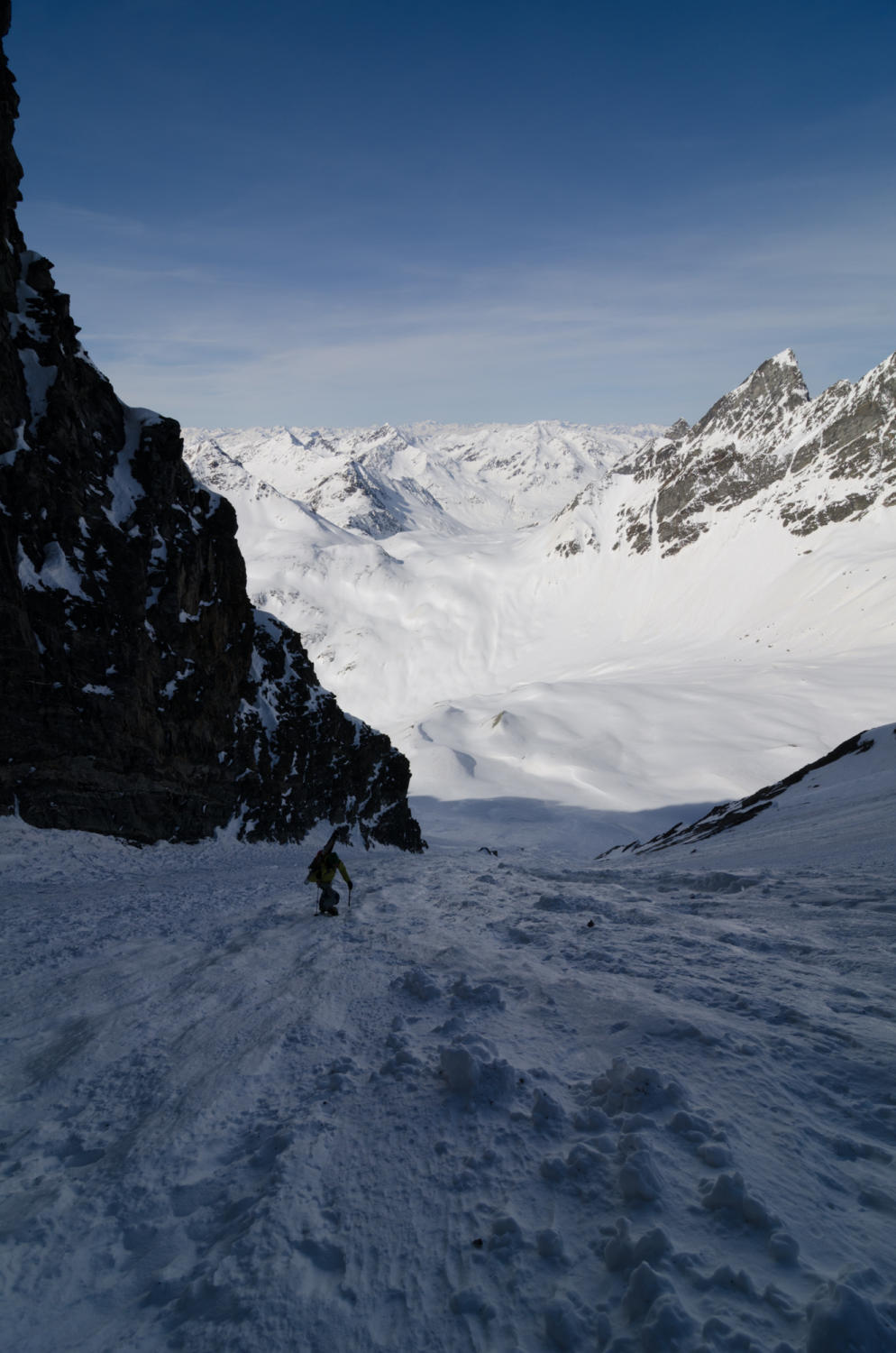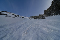 Nicht mehr zuviel Schnee in der Rinne, aber absolut genügend. Aufstieg in gutem Trittschnee, abfahrt warten bis es ein wenig aufsulzt (wir fuhren um 13.00 los).