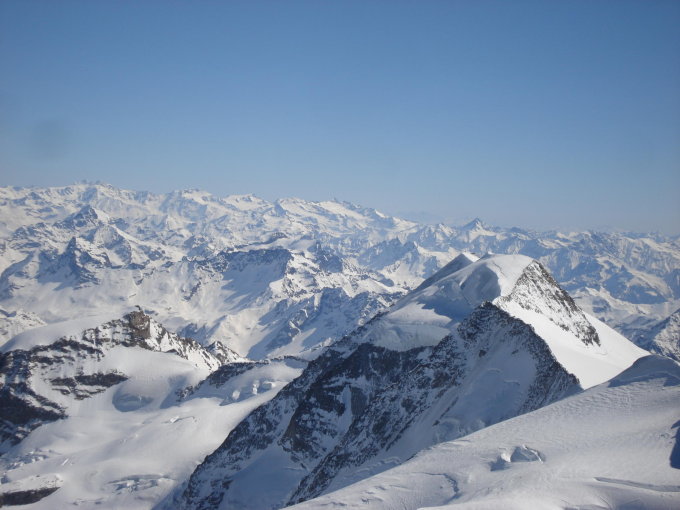 folgent zur steilen Piste entlang, Gletscher ist gut eingeschneit, jedoch sind beim durchqueren noch einige Spalten sichtbar. Ab 3200m. dann leicht decklig und Nordwindig, unterhalb Skidepot hat der Wind seine Spuren hinterlassen, sieht aus wie ein Ackerfeld:). Felsen am Spallagrat trocken, Firnweg in der Querung zum Gipfel heute recht gut.