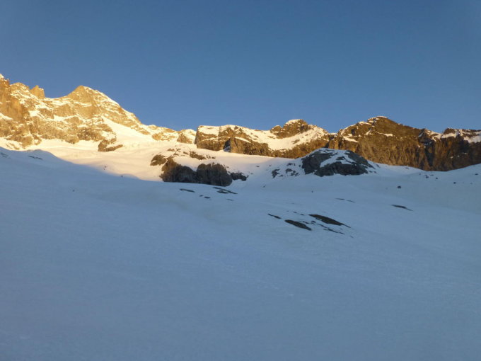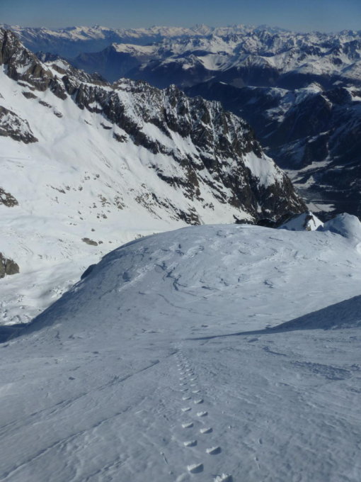 Kommentar auf dem Gipfel: "Normalement les faces nord ça se fait en mai." Wahrscheinlich hat er recht, aber dann muss man noch früher aufstehen...