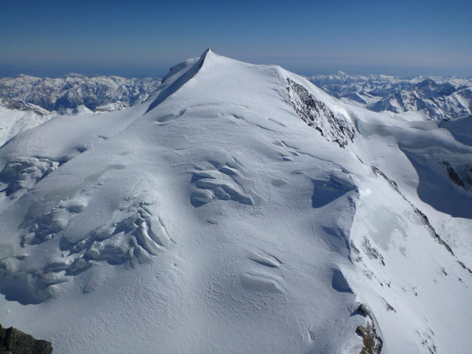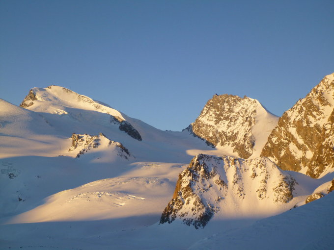 Sehr gute Verhältnisse, auch wenn die starken Winde der letzten Tage geprägt haben... Alle Gletscher in der Gegend sind sehr gut eingeschneit und entsprechend sicher. Am Grat im Fels praktisch Schneefrei. Guter Trittschnee im Couloir. Übergang Vorgipfel zu Hauptgipfel problemlos.