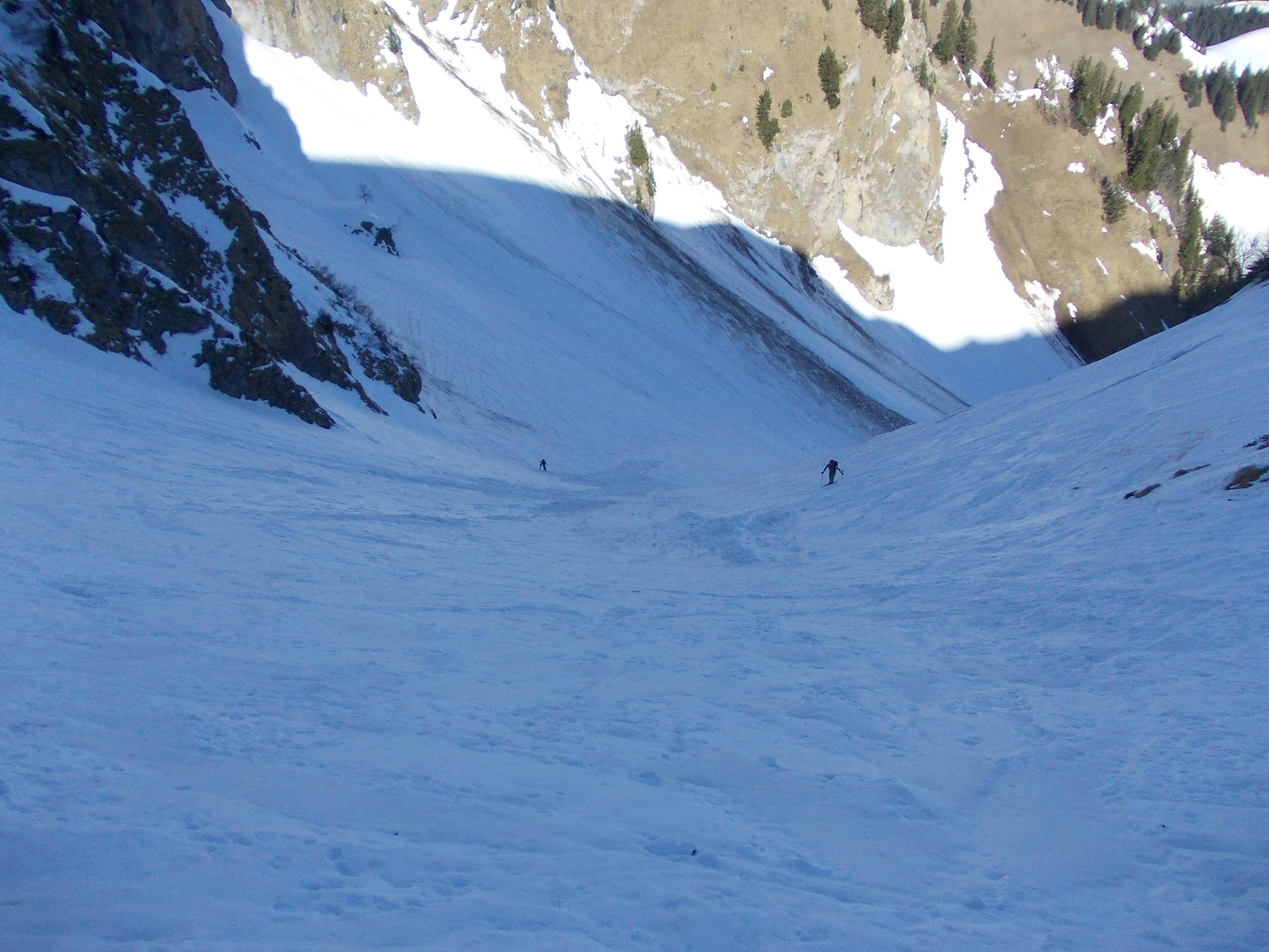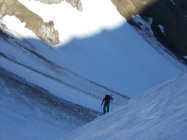 Abfahrt: Wir nahmen die direkte Einfahrt 45 - 50 Grad auf 50 Hoehenmeter in das NW-Couloir. Coulior hart aber griffig zu fahren. Ab Ausfahrt Couloir bis zu den Monts Martin war es eine wunderbare Sulzabfahrt.