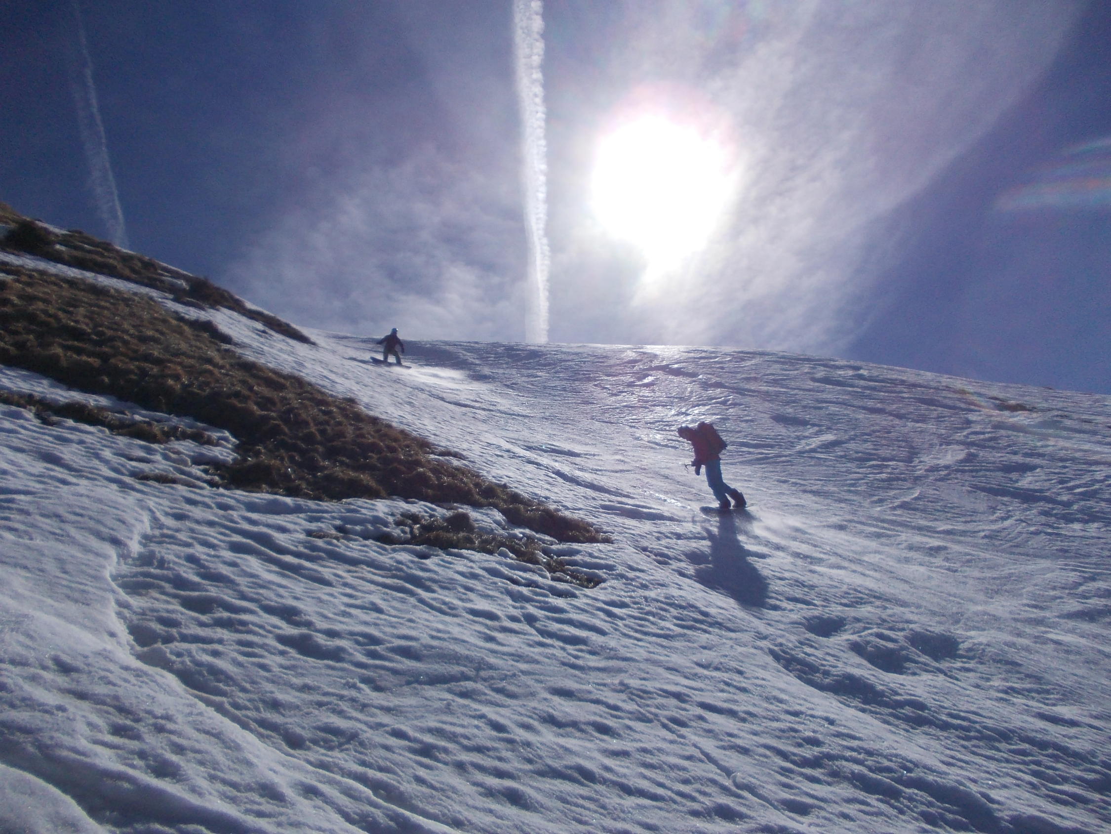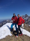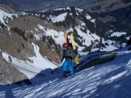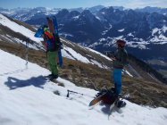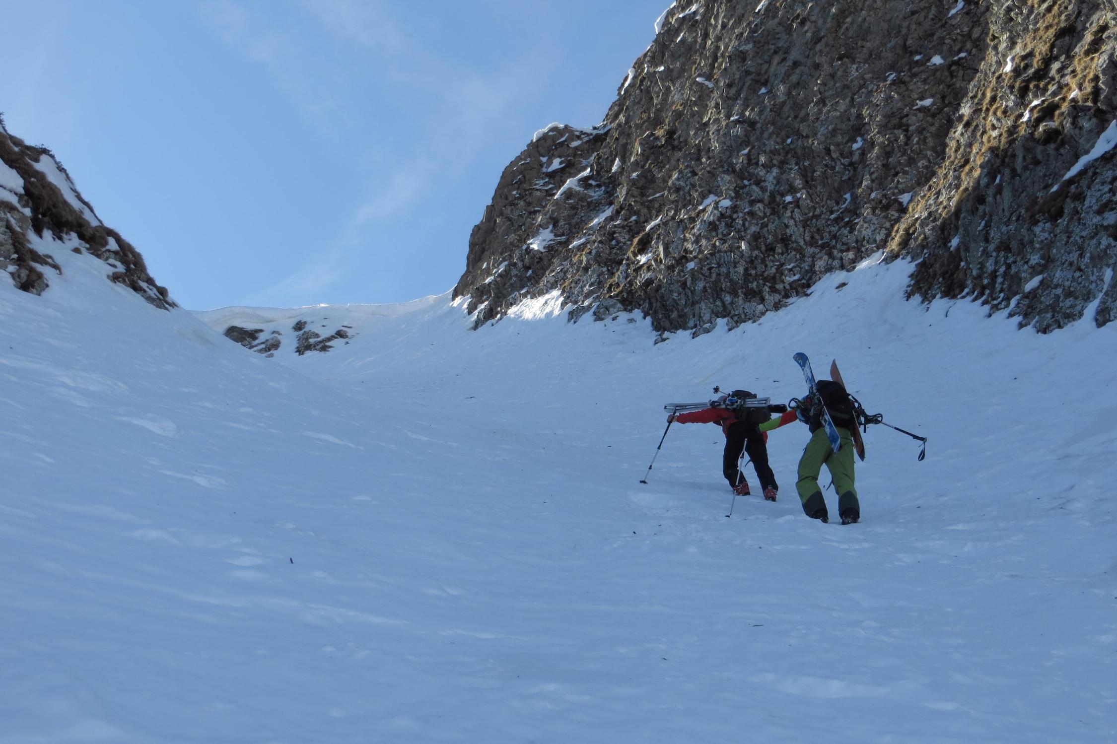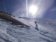 Aufstieg im 35 - 40 gradigen NW-Couloir hart und griffig. Mit Harscheisen gut zu gehen.Die letzten 15 Minuten sind wir zu Fuss auf dem ausgeaperten Westgrat auf den Gipfel.