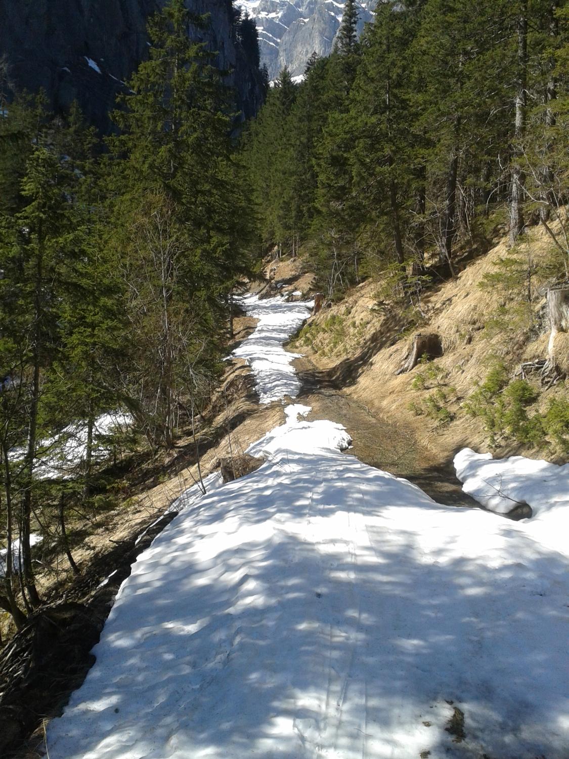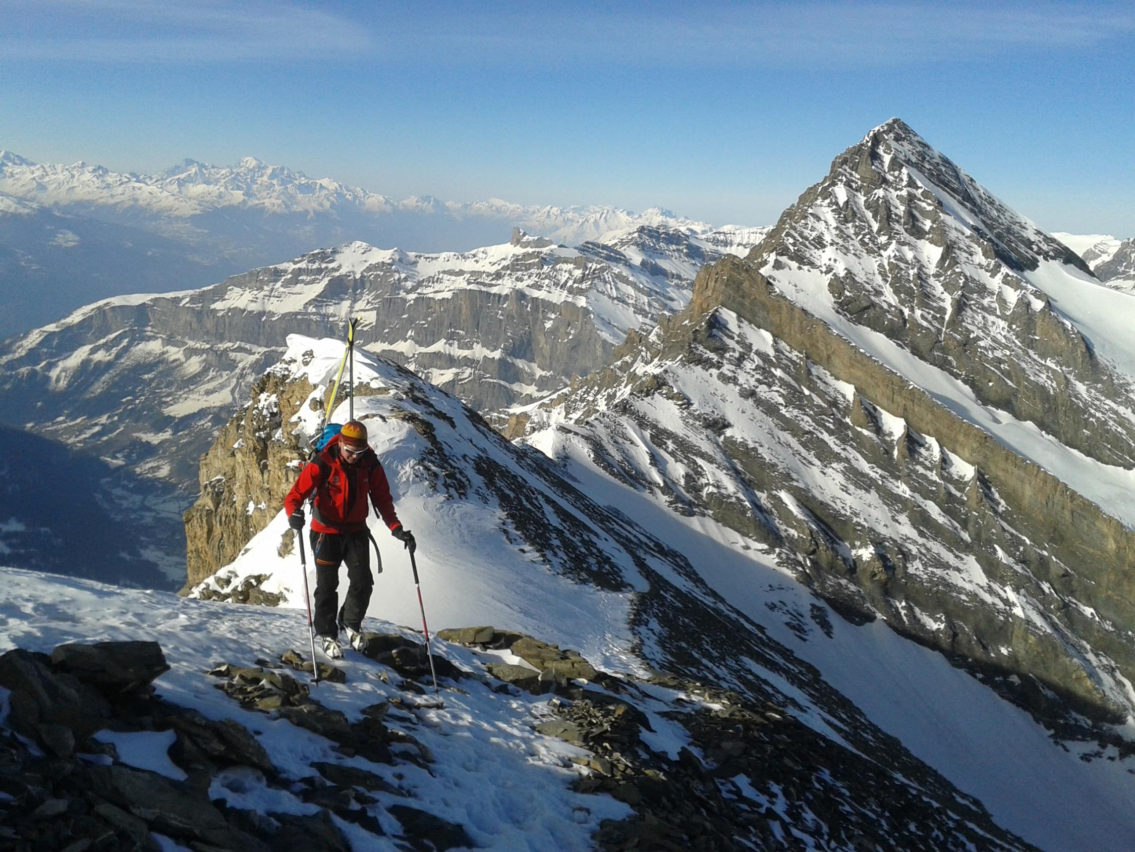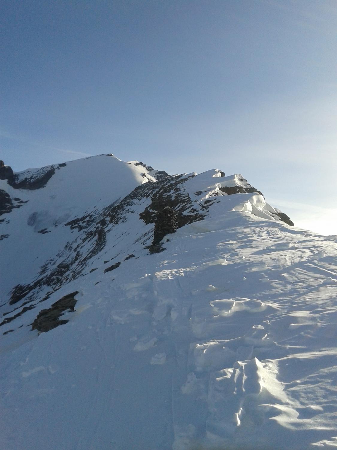 Ab Kandersteg mussten wir die Ski 200hm tragen, von da an durchgehend Schneedecke. Über den Zackengrat schnallten wir die Ski auf den Rücken und mit Steigeisen an den Füssen zur Gipfelflanke (sehr wenig Schnee auf den Grat). die Gipfelflanke wider ohne Probleme mit Ski.