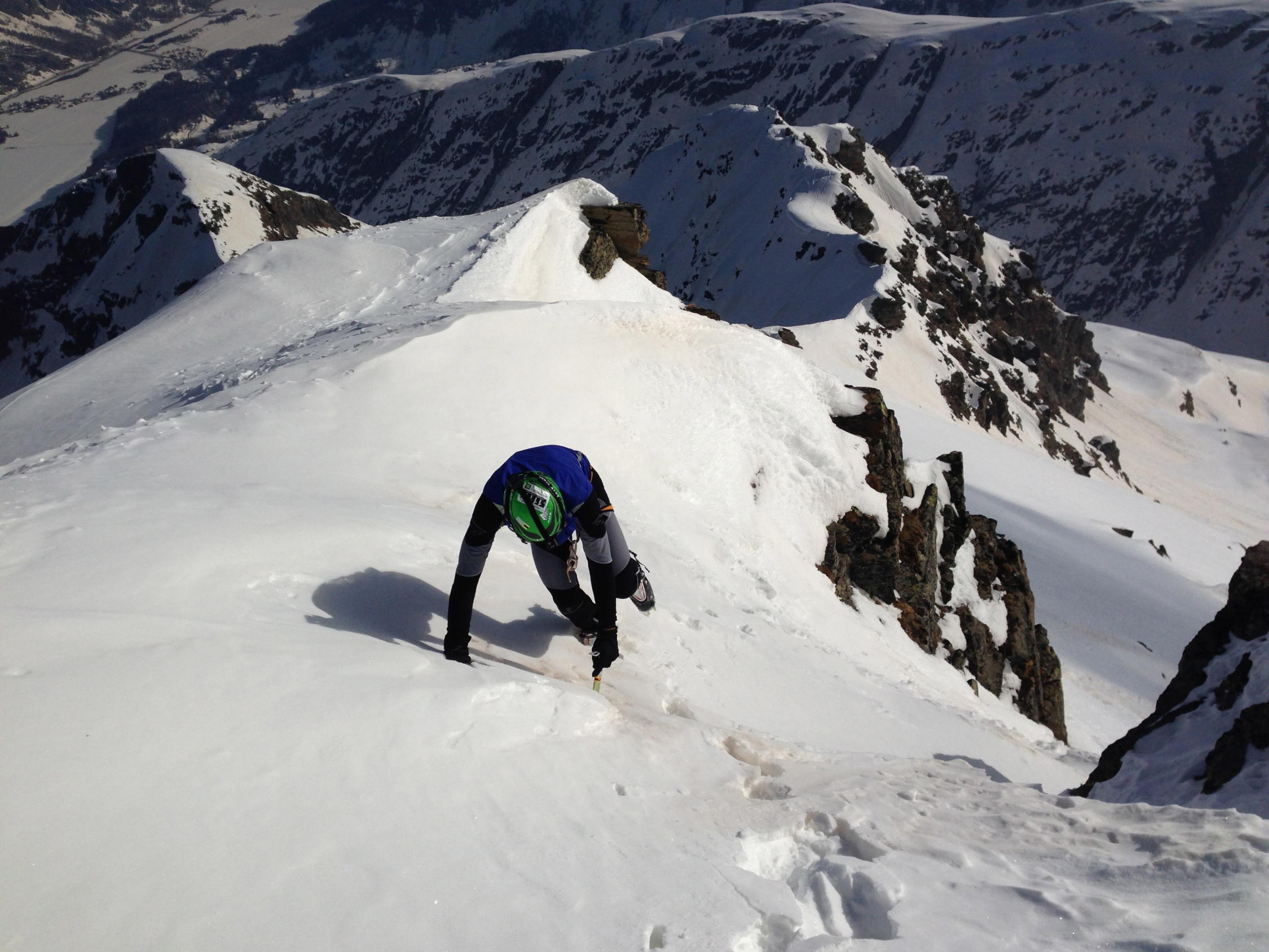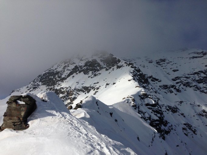 Wegfindung von Sils Maria beachten und ggf. etwas mehr Zeit einplanen um ins Val Murtairac zu gelangen. Dort war die Spur gefroren und daher etwas mühsam die beiden Steilstellen zu überwinden. Harscheisen wären sicherlich hilfreich gewesen. Der Grat ist gut ein zu begehen und die Steilstufe kann links über ein kleines Couloir umgangen werden, so dass keine Felskletterei erforderlich ist. Der restliche Grat ist nach Süden hin sehr verwächtet, so dass auf die Spur in der Nordwand angelegt wurde.
