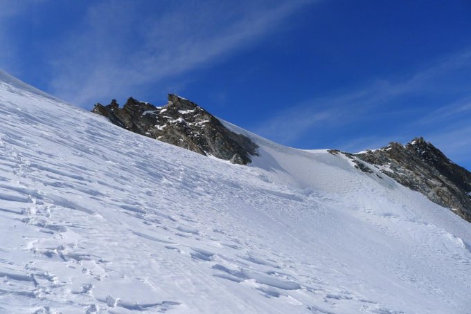 Ab Domhütte sehr gute Verhältnisse, Gletscher schön zugeschneit, vermutlich einige grosse versteckte Spalten. Achtung nach dem Festijoch: versteckter Bergschrund! Schnee ab ca. 3800m hartgeblasen.