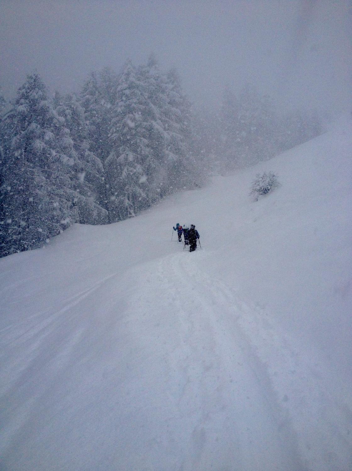Tiefster Winter mit einem halben Meter Neuschnee. Sicht oberhalb Baumgrenze dürftig, im Wald gut.Superweiches Fahrgefühl!