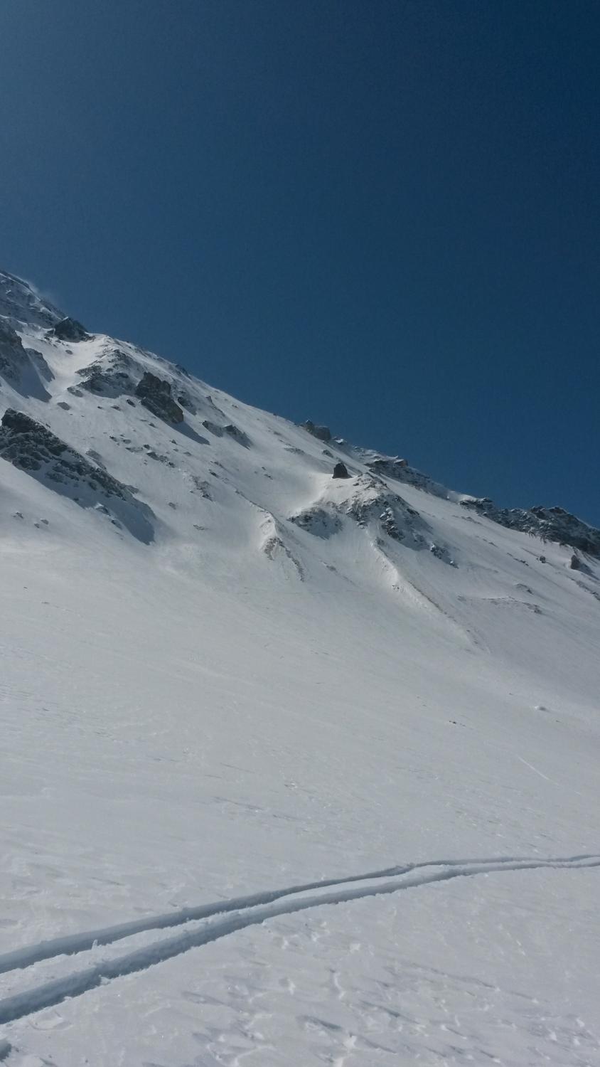 Es herrschte Traumwetter mit leichtem Wind. Die Aufstiegsspur von gestern war nur noch schwach erkennbar und so durfte ich den Grossteil spuren. Der Frühstücksplatz war auch heute für viele der Knackpunkt. Die Traverse wurde wohl von einem freundlichen Tourengeher bearbeitet, gleichwohl mussten die Skier abgezogen und geschultert oder aufgebunden werden. Es sind sogar Personen umgekehrt, da es ihnen zu heikel war. Hier ist ratsam, Steigeisen und Pickel mal lieber zuviel mitzunehmen und nicht zu brauchen als umgekehrt!