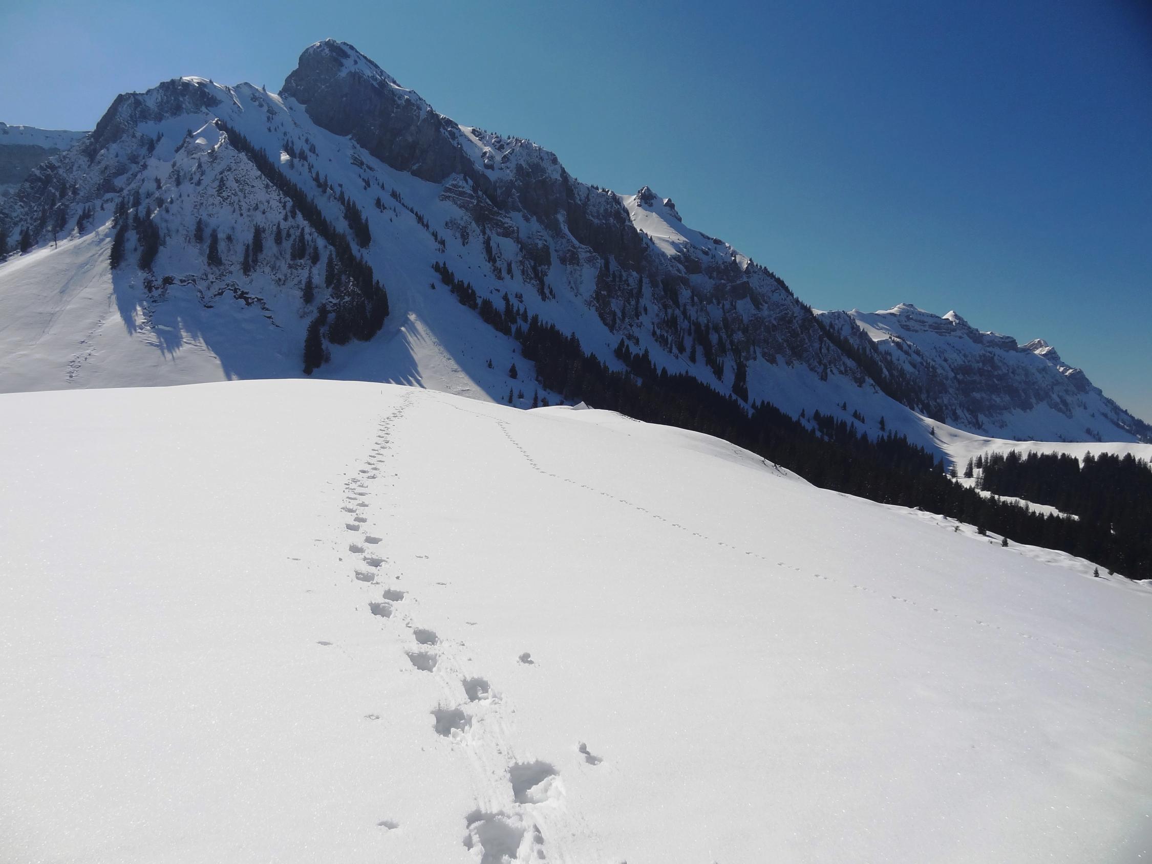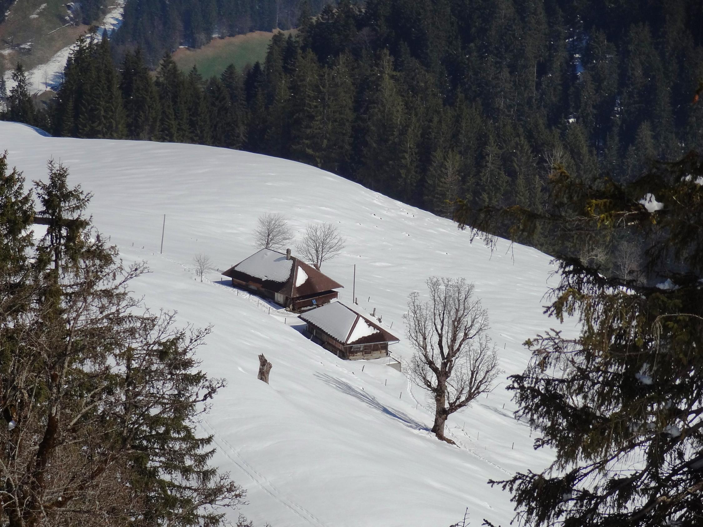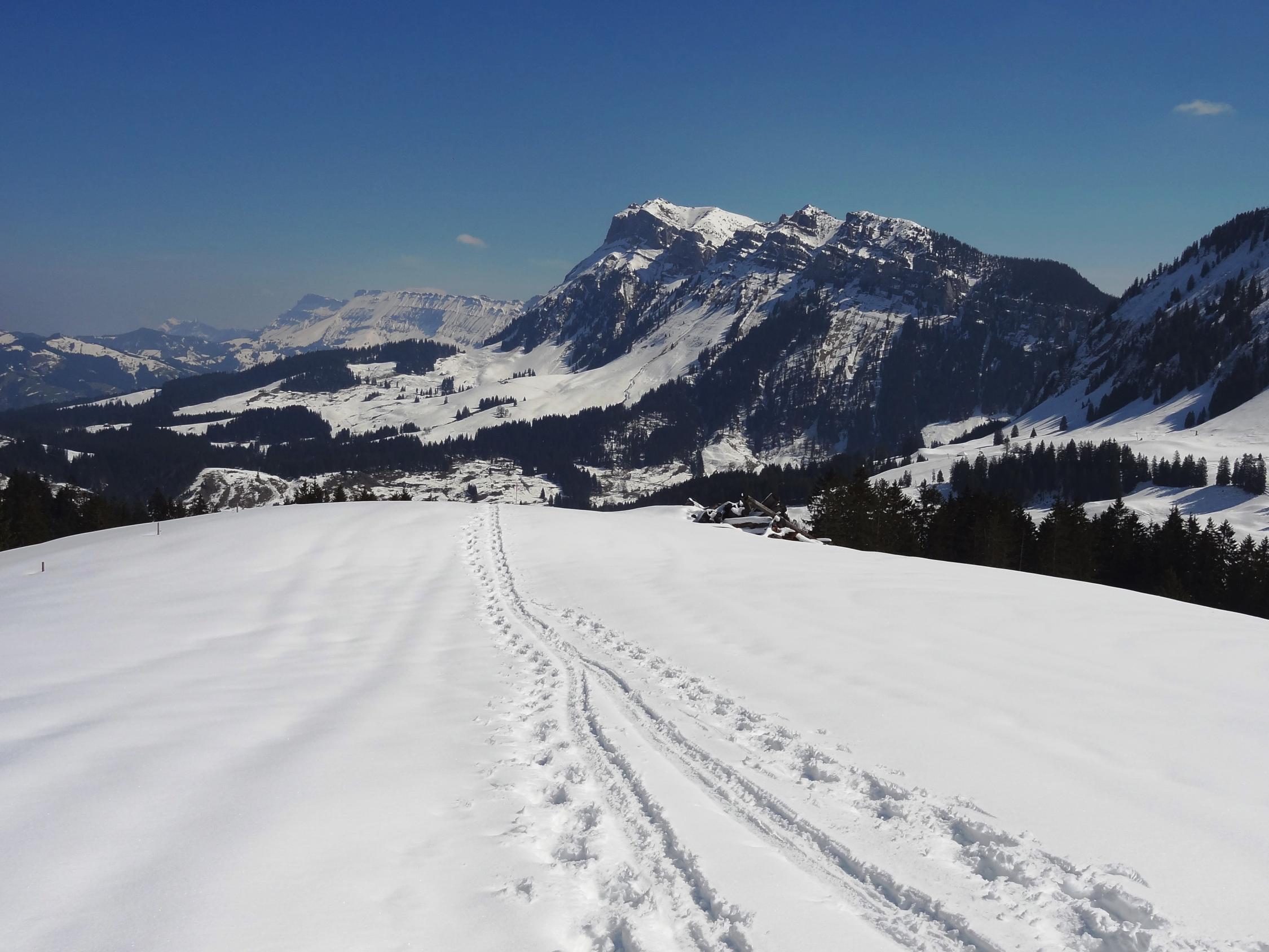 Bis zum Ob. Schöriz fand ich eine gute Spur die mir die Gewissheit gab, bis Sigriswil zu kommen. Die wunderbare Spur hörte aber bei dieser Alp auf. Umkehren wollte ich nicht, so mühte ich mich über die weichen und tiefen Hängen bis zum Rücken bei Pkt. 1463 m. Als ich hinauf kam und die ungespurte Hänge beim Hörnli und Zettenalp sah, wurde ich blitzschnell zum bescheidenen Realist. Allein kann man es kaum machen. So wechselte ich über den Rücken zum Stouffe hinüber zu einer gemütlichen Gipfelrast mit wunderbarer Aussicht. Anschliessend leicht und gemächlich via Schneeschuhtrail hinab nach Innereriz Säge. Es ist immer gut, hat man im Hinterkopf einen Plan B.