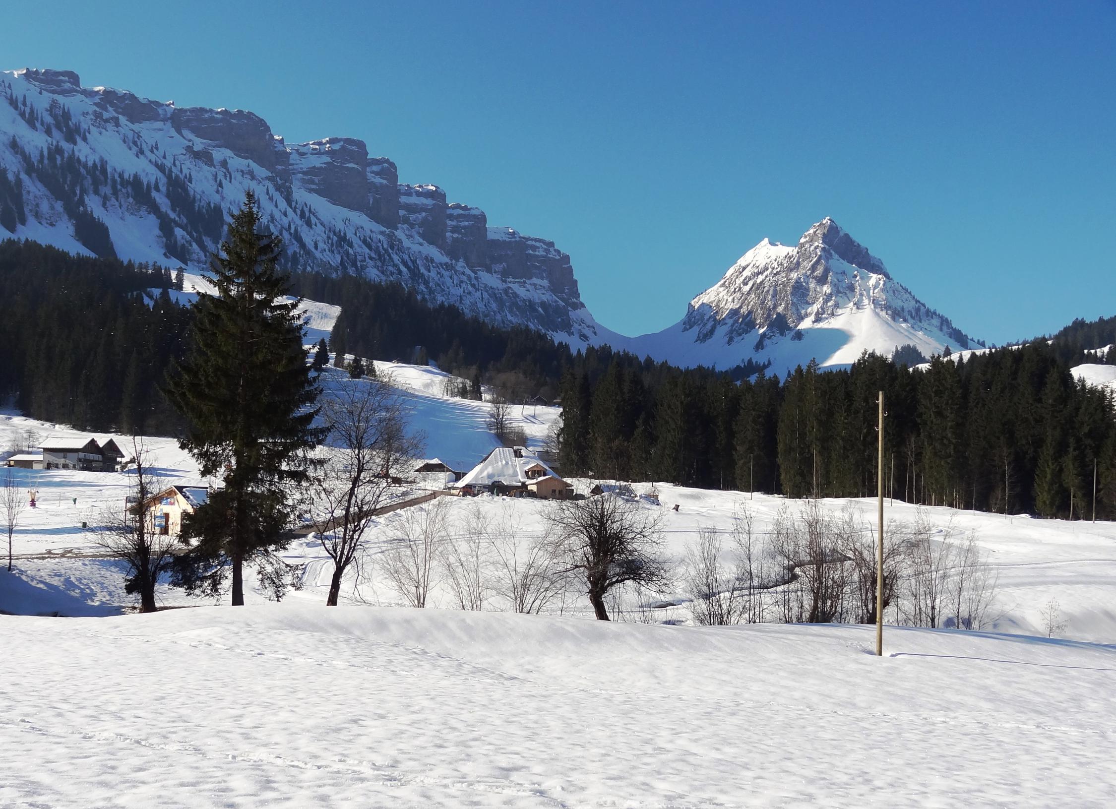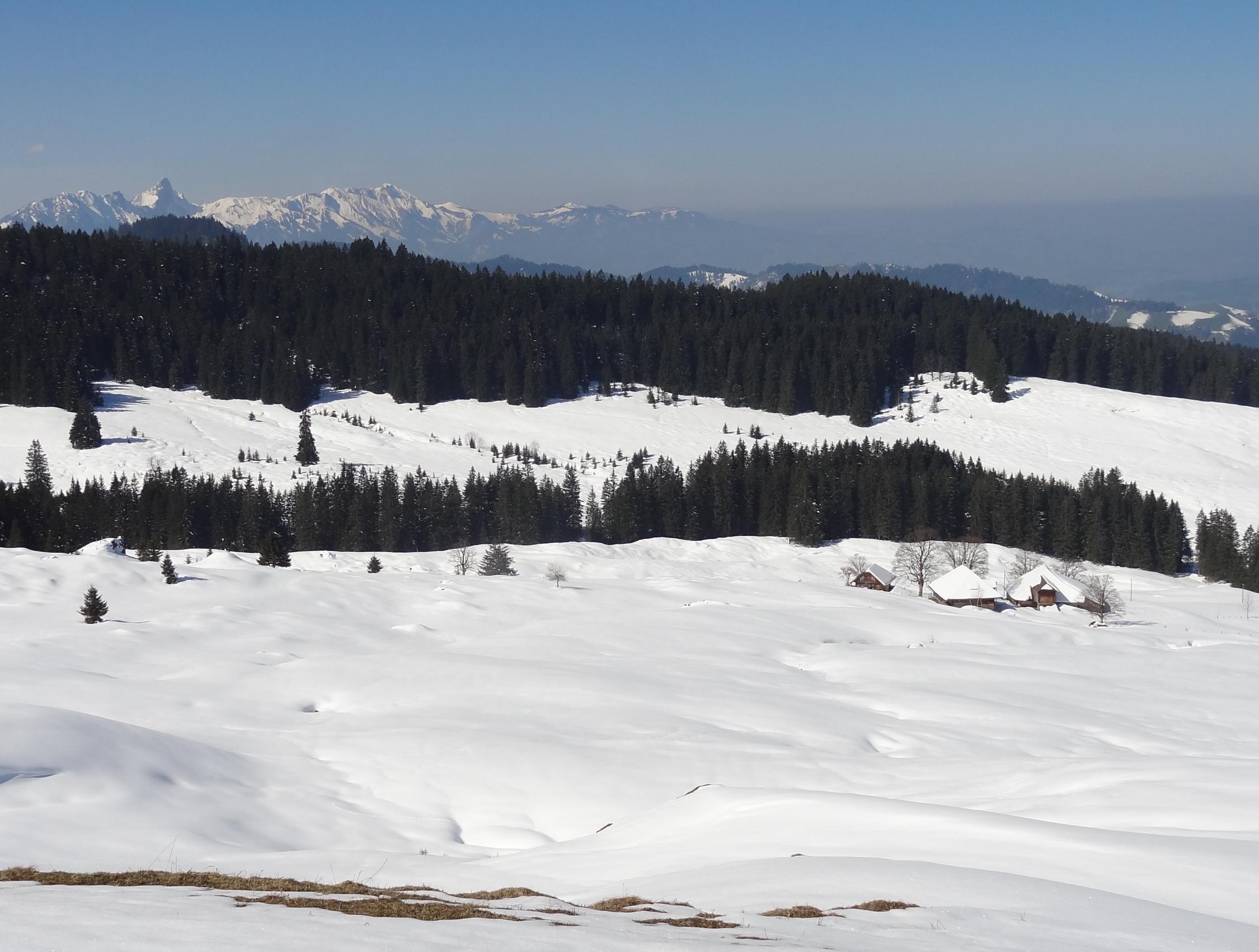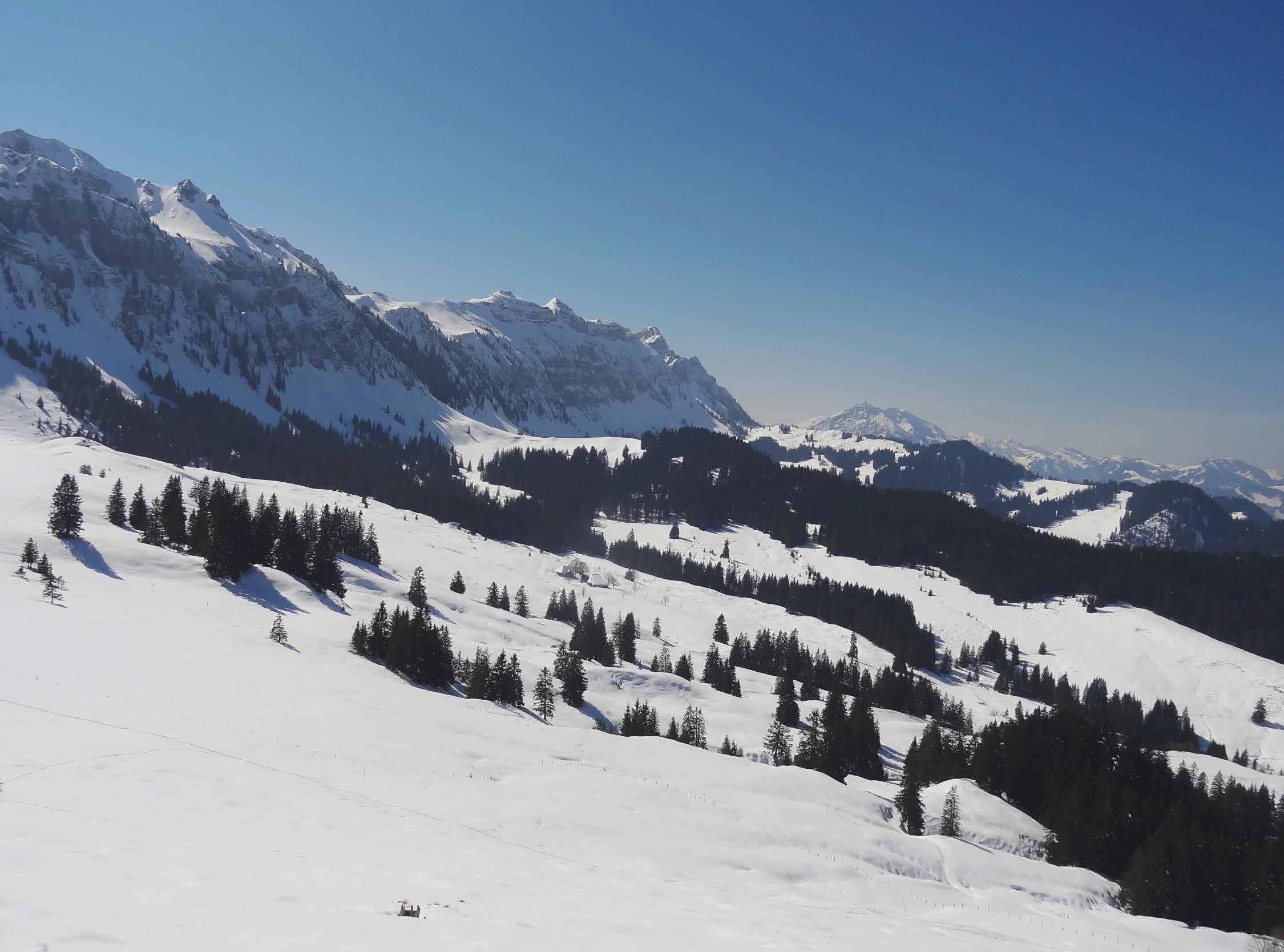 Bis zum Ob. Schöriz fand ich eine gute Spur die mir die Gewissheit gab, bis Sigriswil zu kommen. Die wunderbare Spur hörte aber bei dieser Alp auf. Umkehren wollte ich nicht, so mühte ich mich über die weichen und tiefen Hängen bis zum Rücken bei Pkt. 1463 m. Als ich hinauf kam und die ungespurte Hänge beim Hörnli und Zettenalp sah, wurde ich blitzschnell zum bescheidenen Realist. Allein kann man es kaum machen. So wechselte ich über den Rücken zum Stouffe hinüber zu einer gemütlichen Gipfelrast mit wunderbarer Aussicht. Anschliessend leicht und gemächlich via Schneeschuhtrail hinab nach Innereriz Säge. Es ist immer gut, hat man im Hinterkopf einen Plan B.