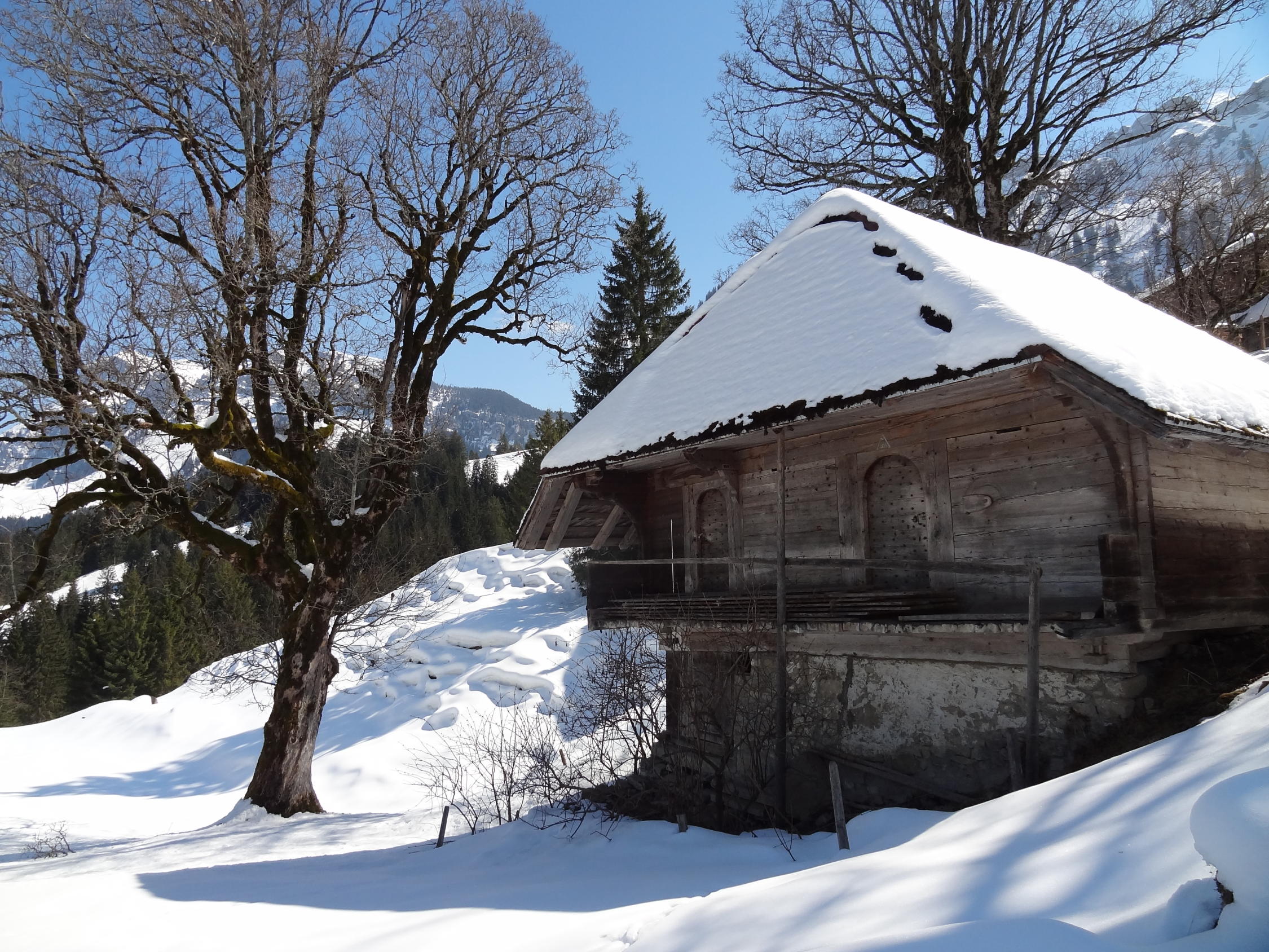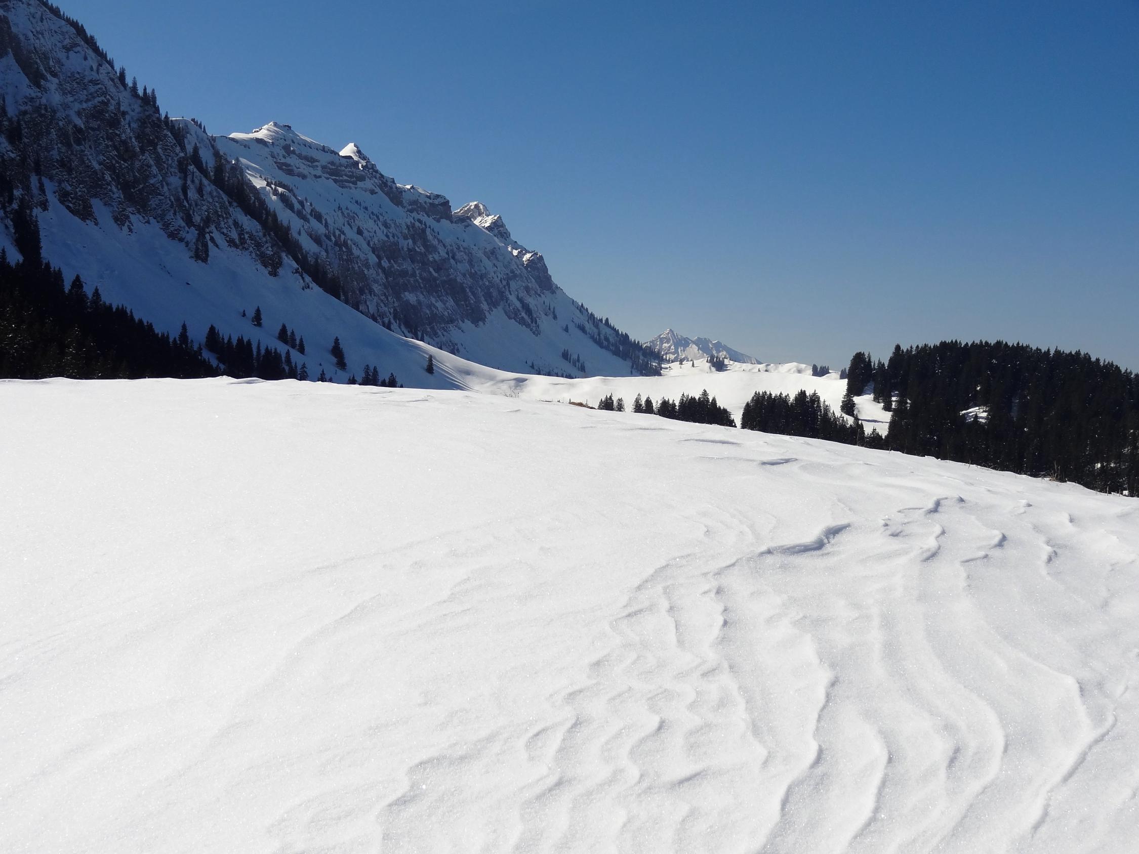 Heute morgen bereits um 9 Uhr, war der Schnee in den besonnten Mulden nicht mehr tragfähig. Die dünne Kruste war weg und darunter bodenloser, feuchter Triebschnee. Grund der Verspätung: erstes Postauto ist um 0825 im Eriz.