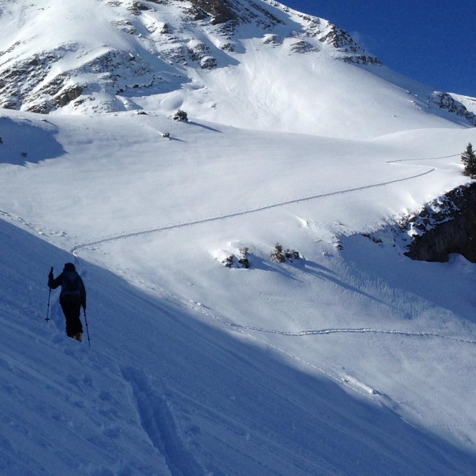 In der östlichen Seite des Gipfelhanges ist ein grosses Brett abgegangen, allerdings noch vor dem Neuschnee vom vergangenen Wochenende, die gesamte Altschneedecke ist da runter und hat die normale Aufstiegsspur aufs heftigste überrollt.