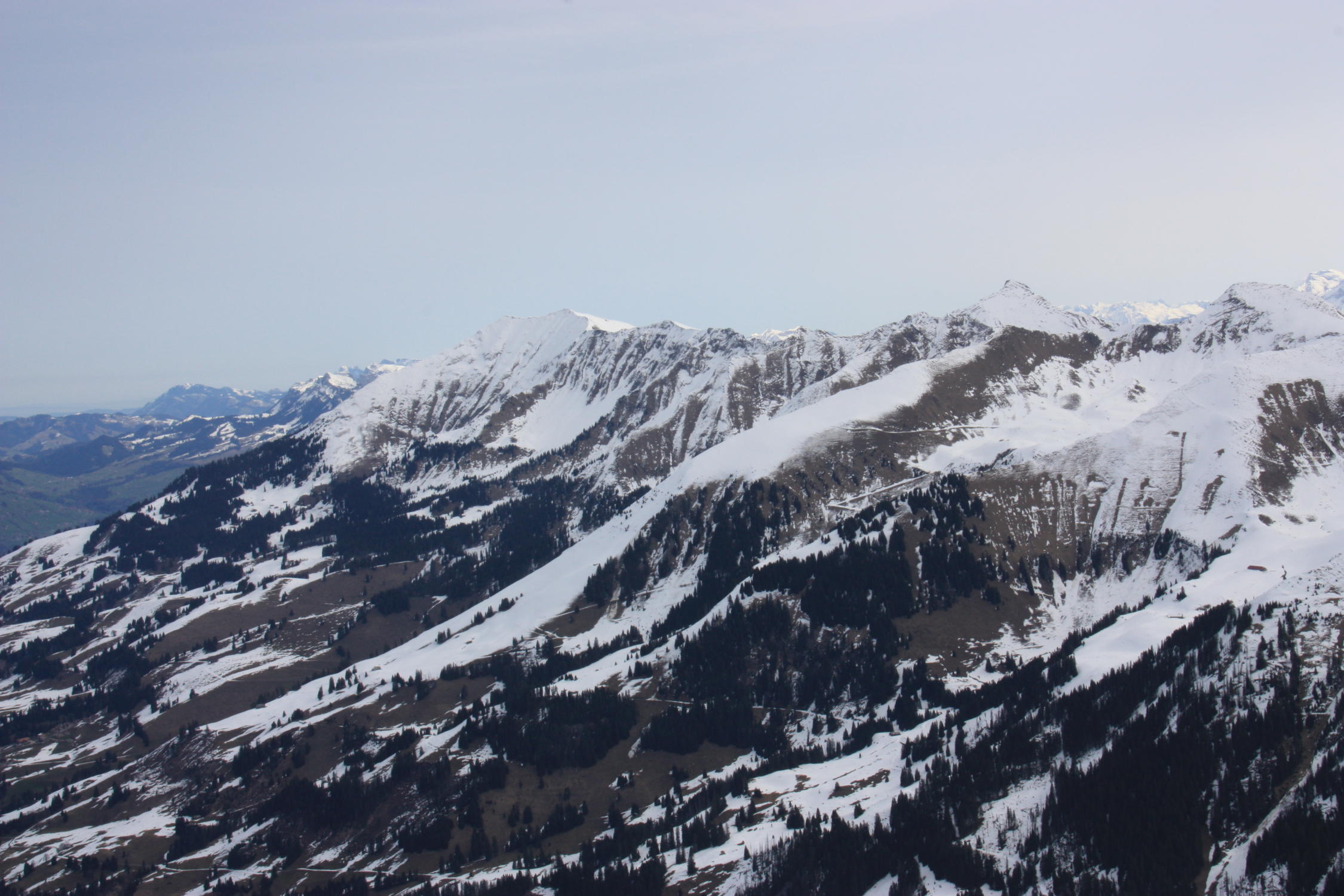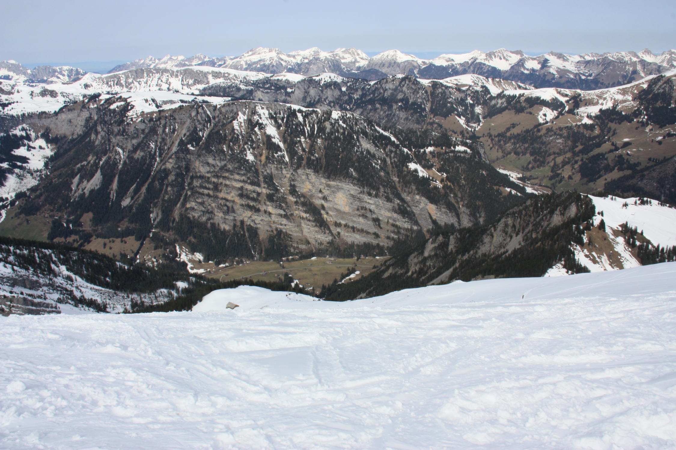 Schnee: über die Piste nur wenige Meter Tragestrecke zu Beginn. Strassenquerung schneefrei. Schnee teilweise gefroren. Ab 1700 Meter teilweise Pulver. In der NW-Flanke harter Schnee. Abfahrt hatte sich heute durch die orogr. rechte Seite der Flanke sehr gelohnt. Danach Sulz bis runter.
